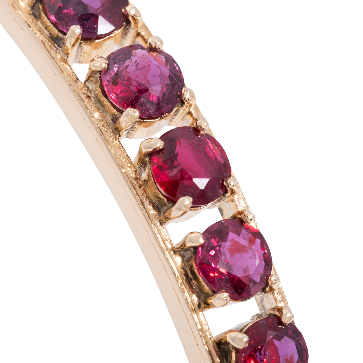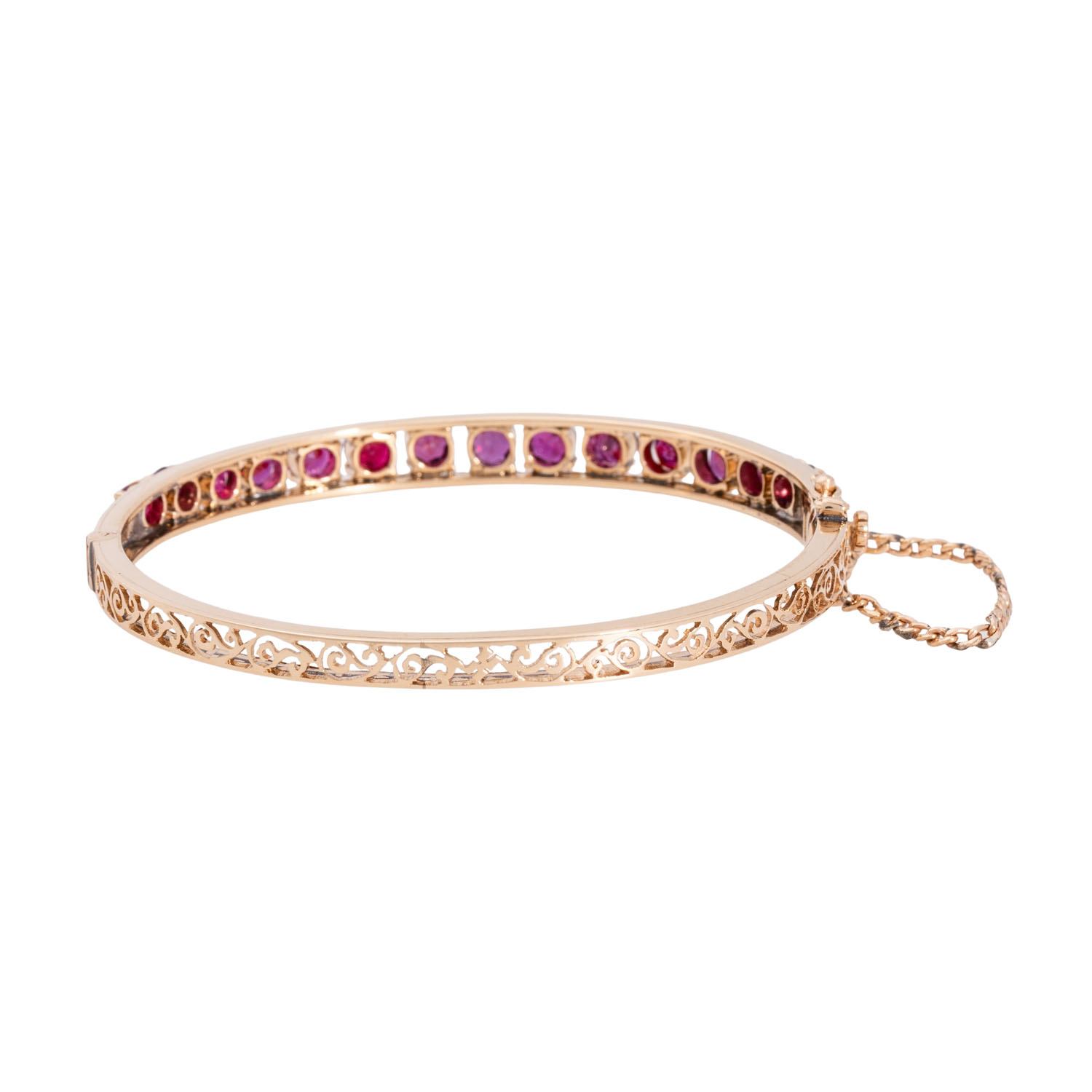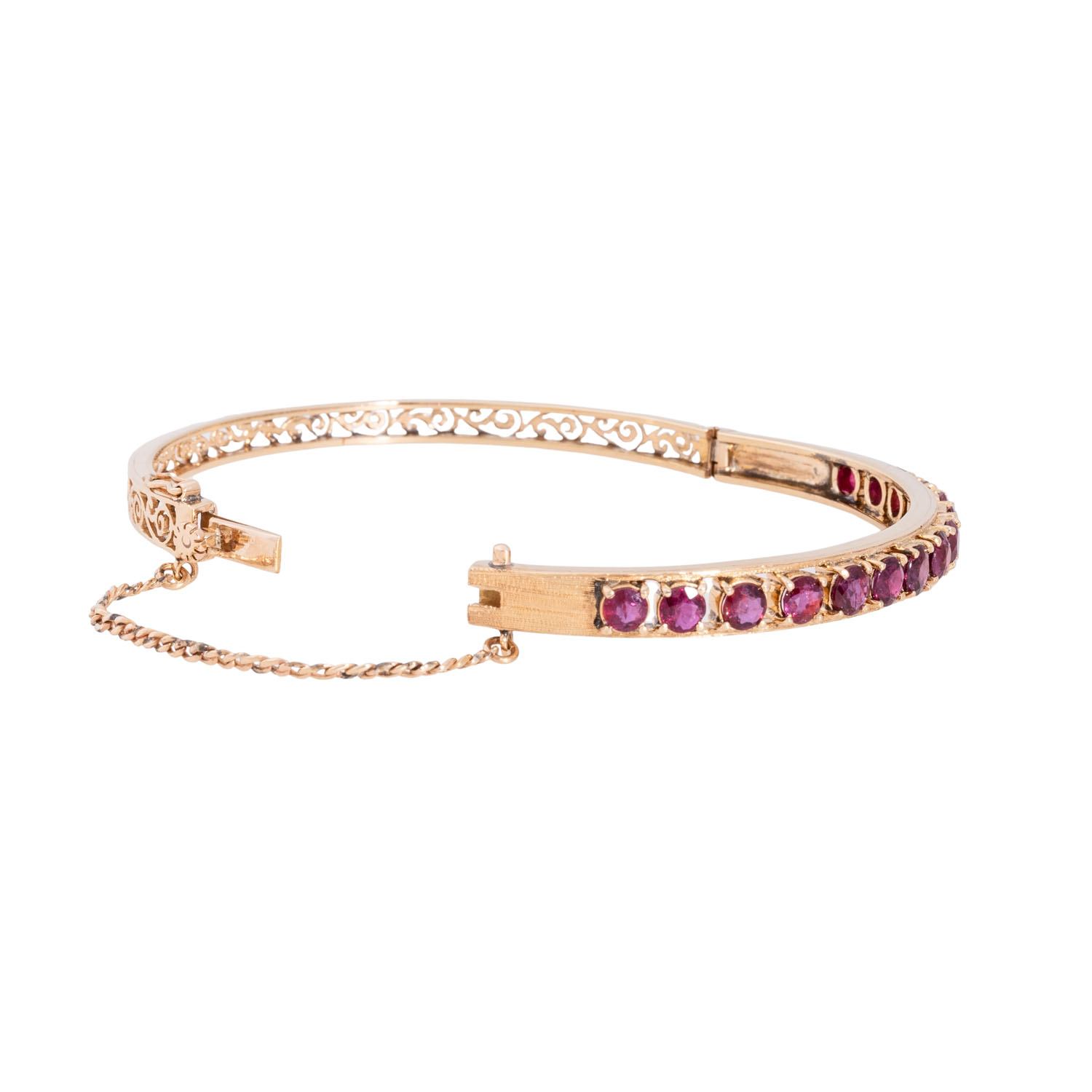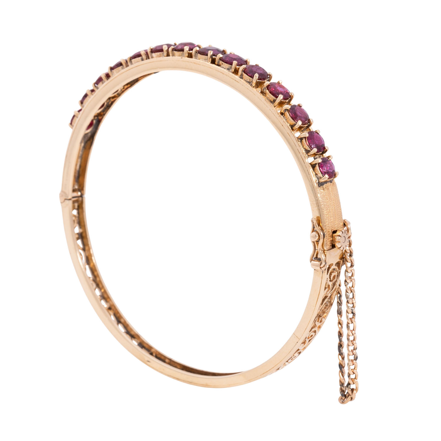 Bangele with 14 rubies, round faceted, totalling ap. 2 ct, 14K yellow gold, 18.3 g, inner circumference 18 cm, W in course from 4.4 to 6.3 mm, safety chain repaired several times, mid 20th century, minor signs of wear, handcrafted.