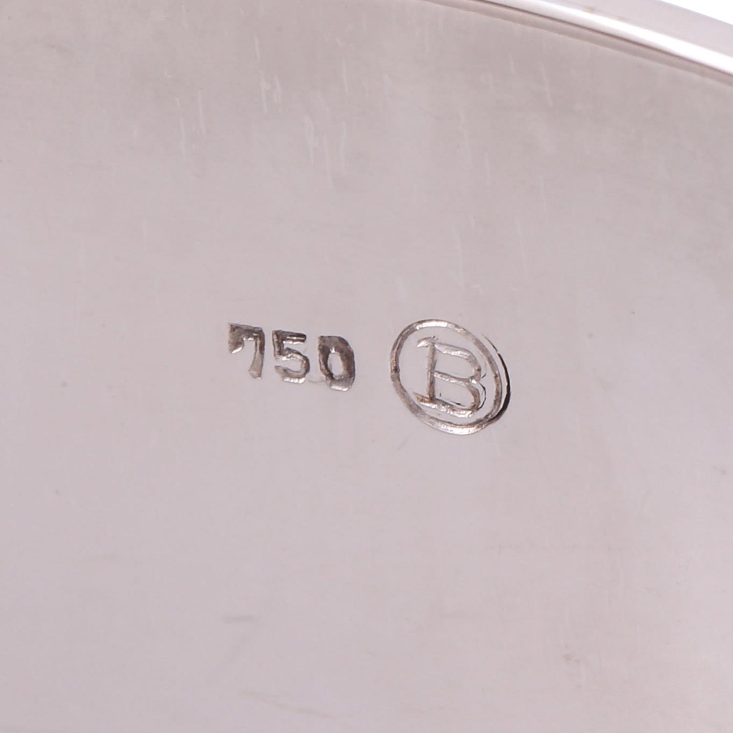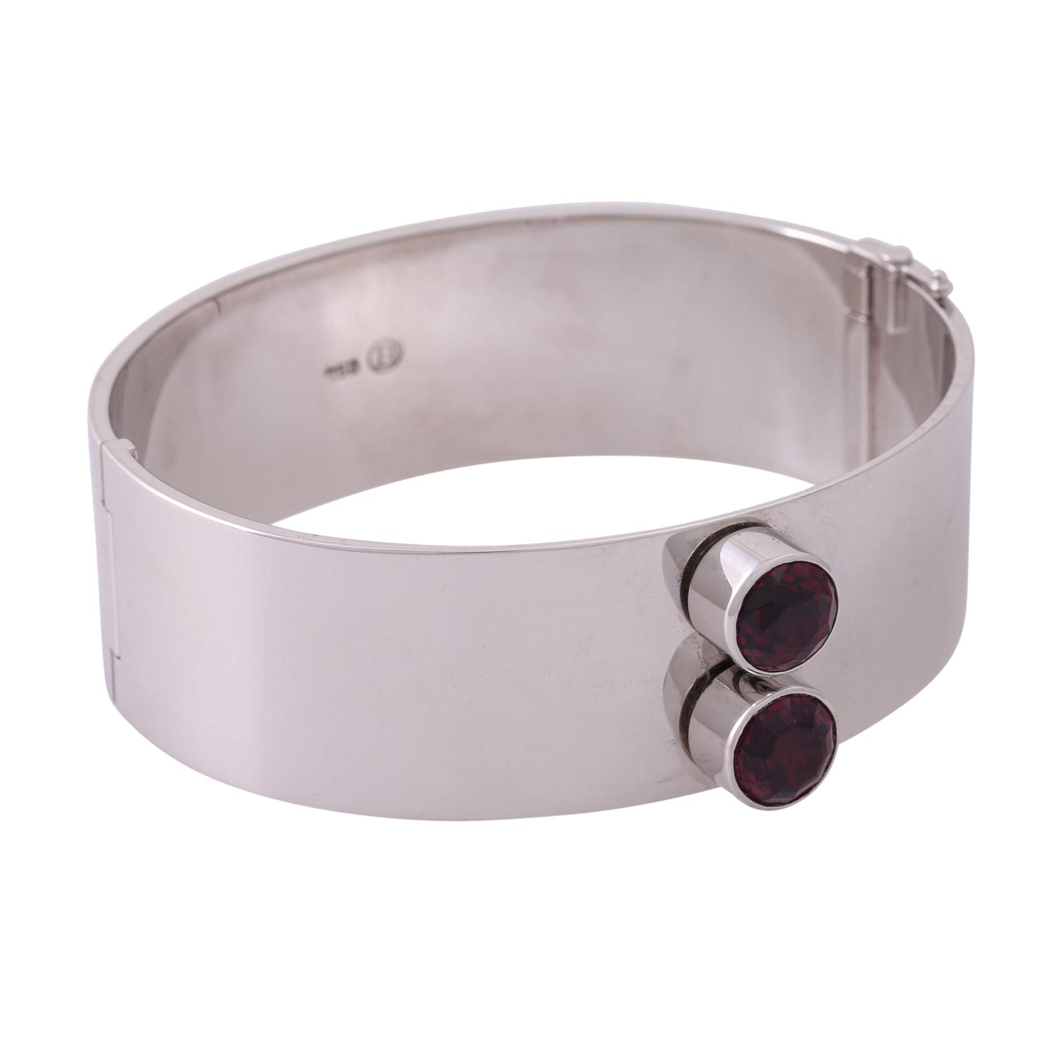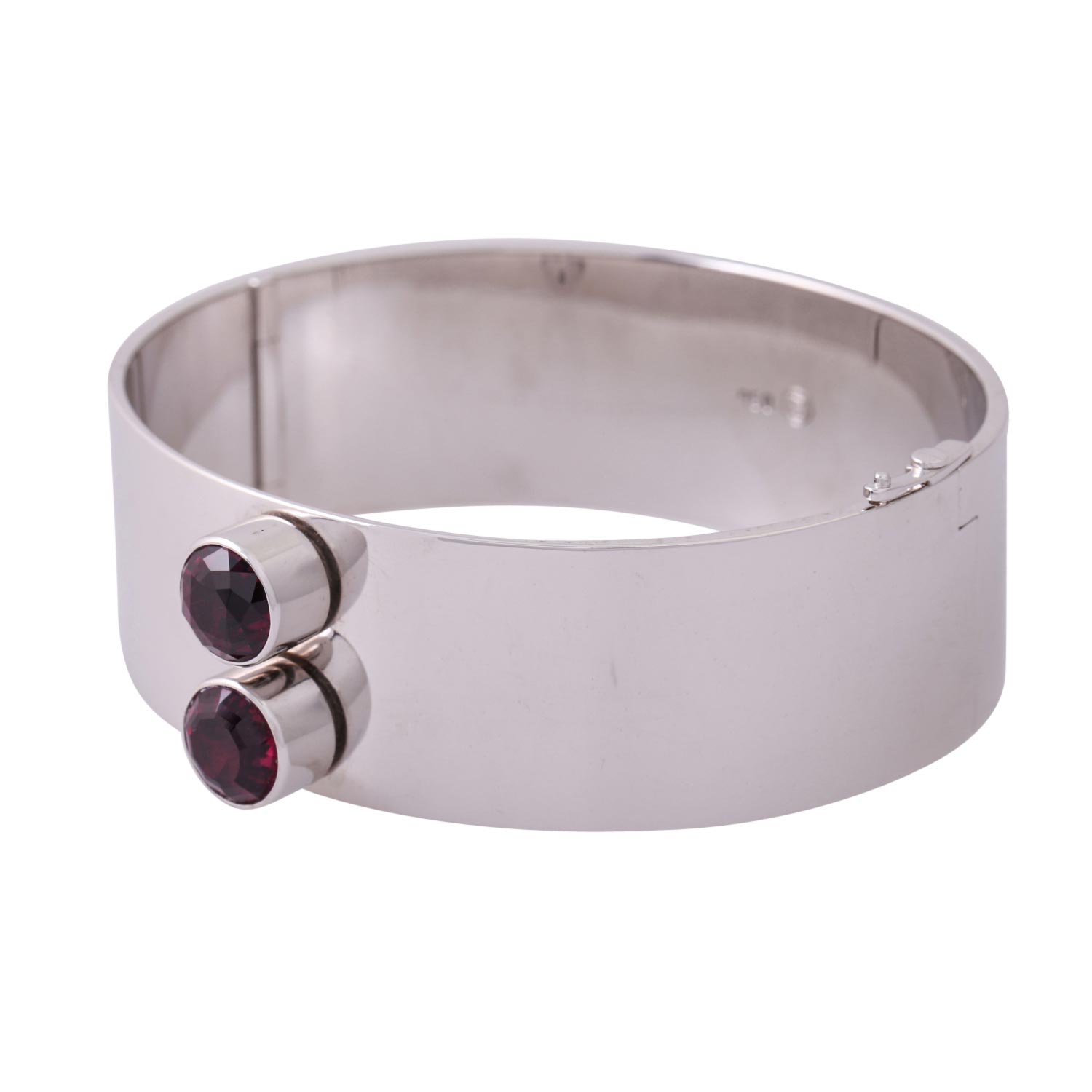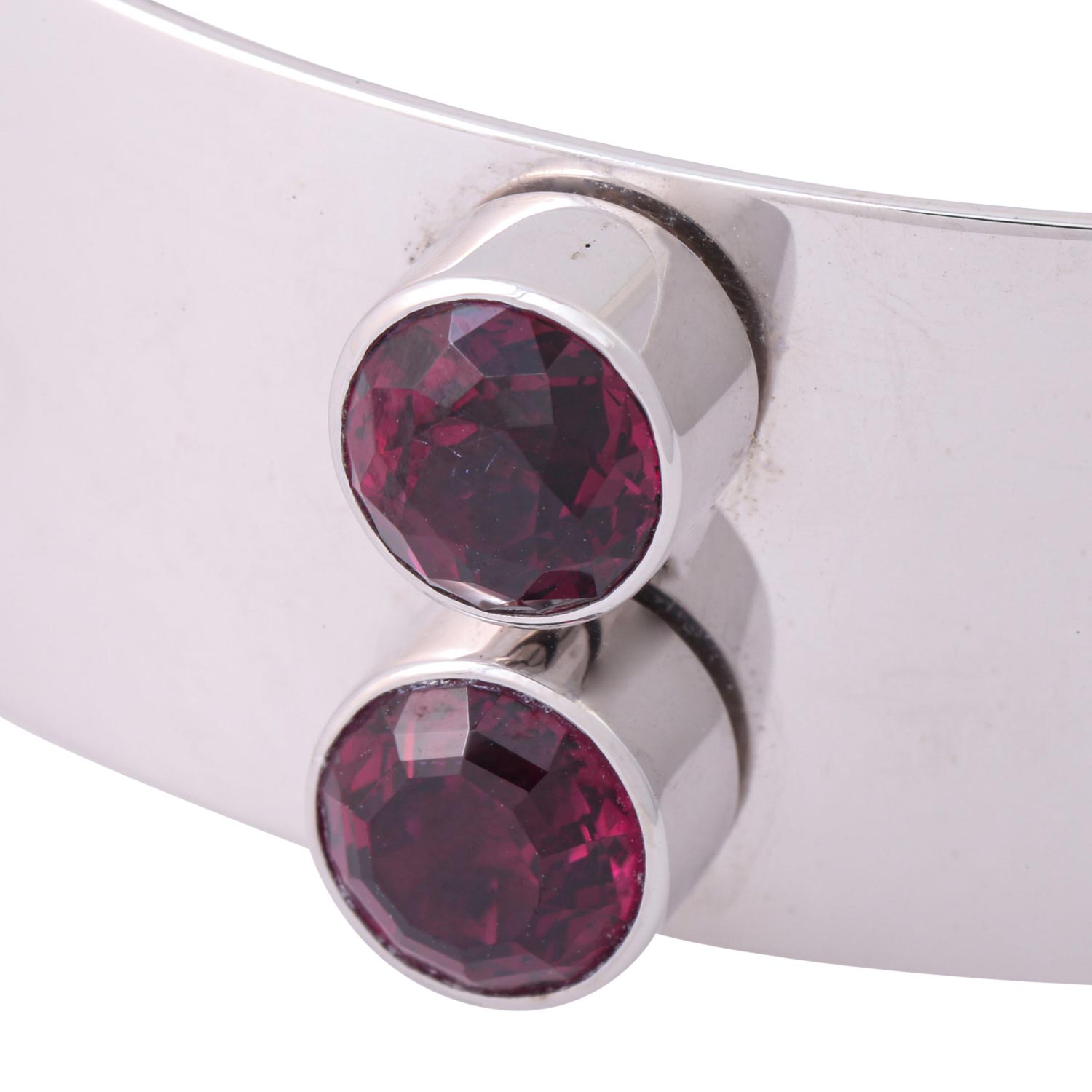 Bangle with 2 fine rhodolites, 18K WG, 89.1 gr, inner circumference ca. 17.5 cm, width ca. 2 cm, 20th/21st century, mint condition, maker's mark 'B'.