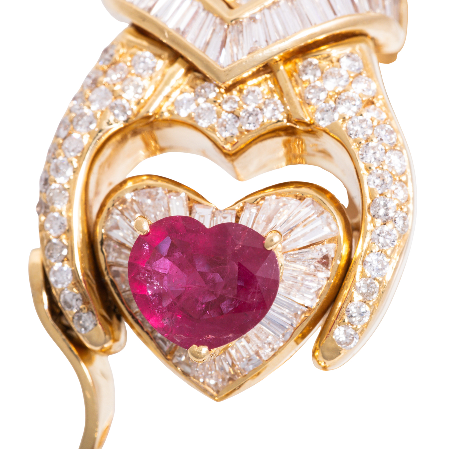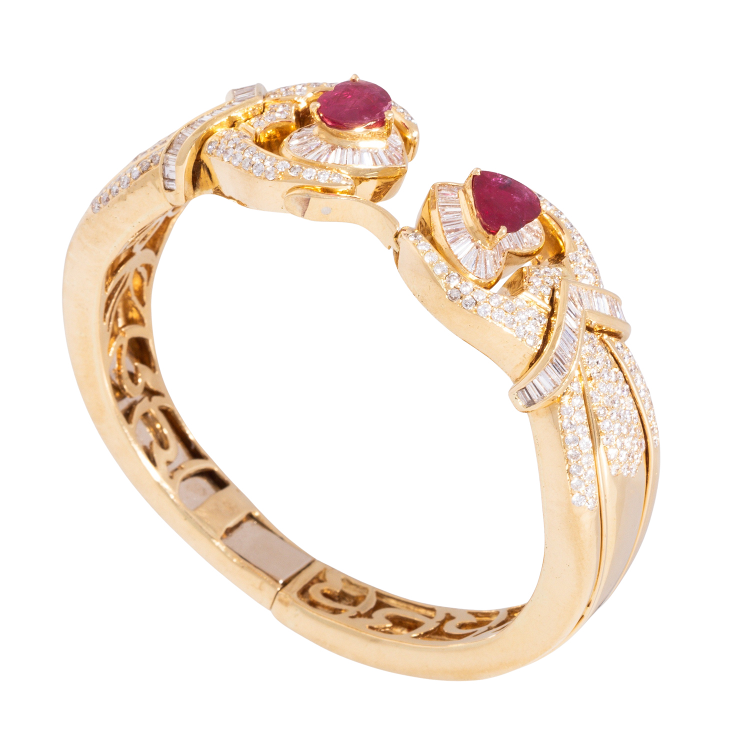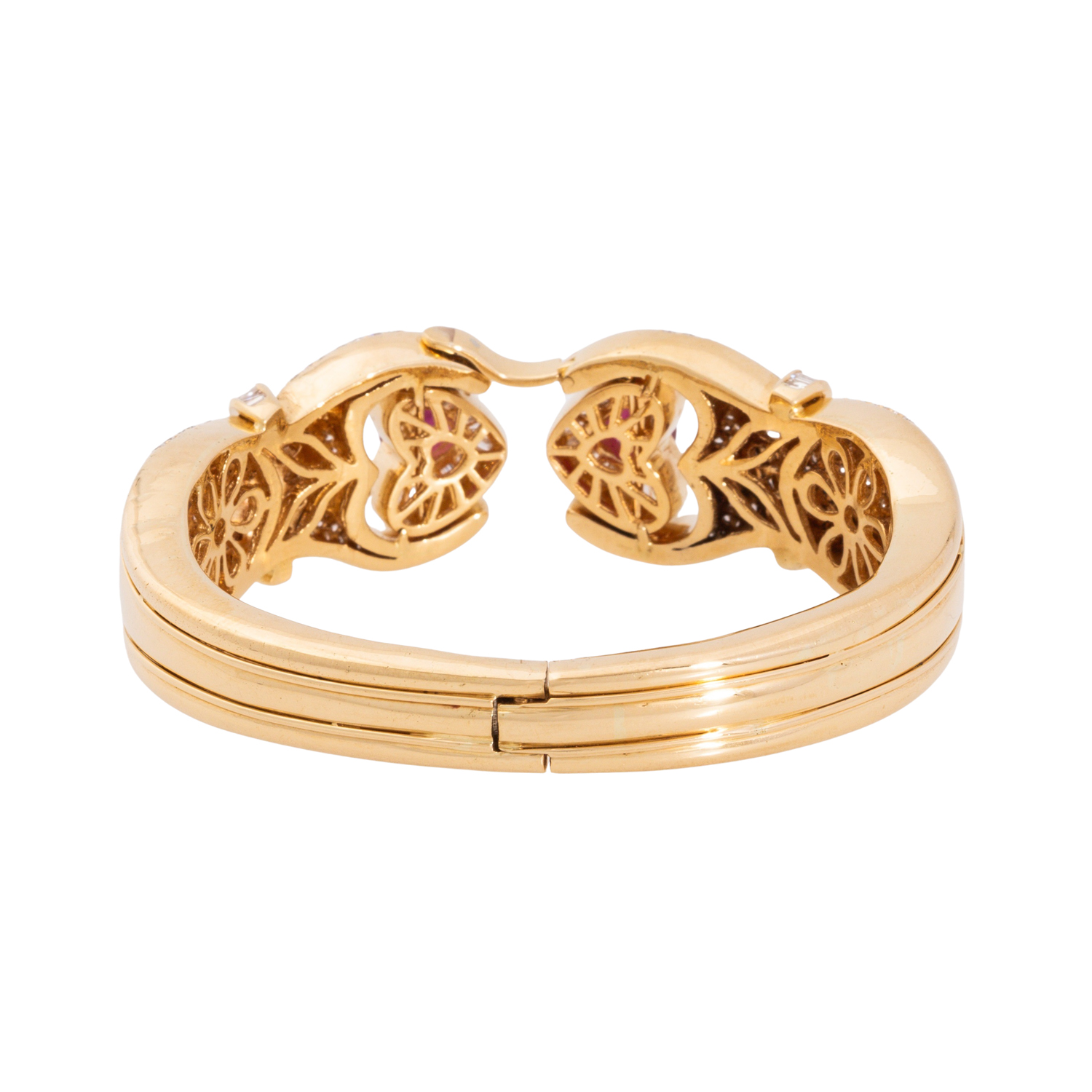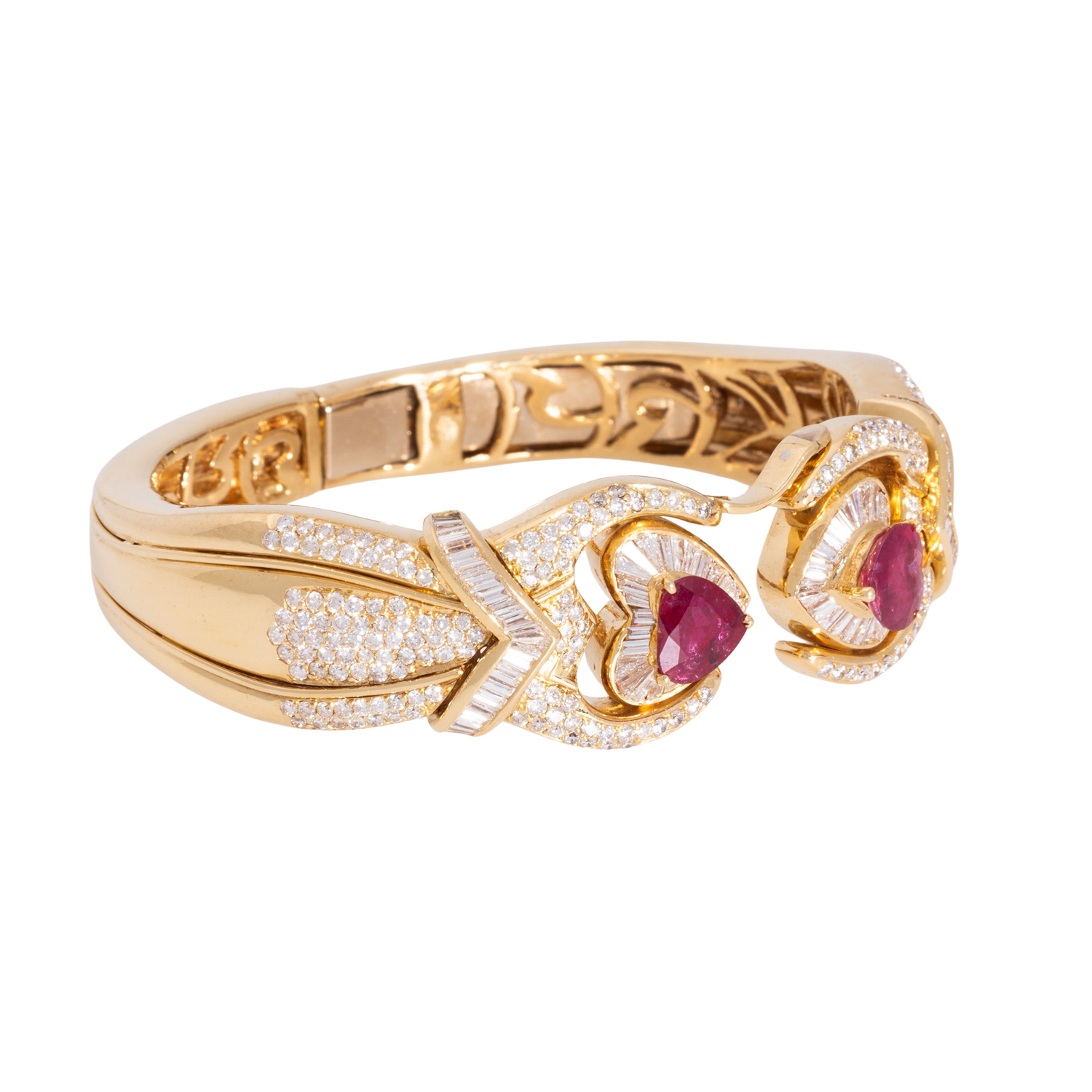 Bangle with 2 heart-shaped rubies, approx. 8 x 7 mm, heated, brilliant-, baguette- and trapeze-cut diamonds, total ca. 8.5 - 10.0 ct, good to very good colour, medium to very good clarity, isolated stones with small chips, YG 18K, 71.4 g, ca. 17 cm, 20th century, good condition.