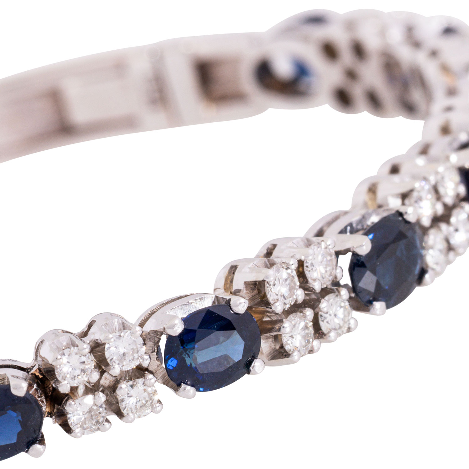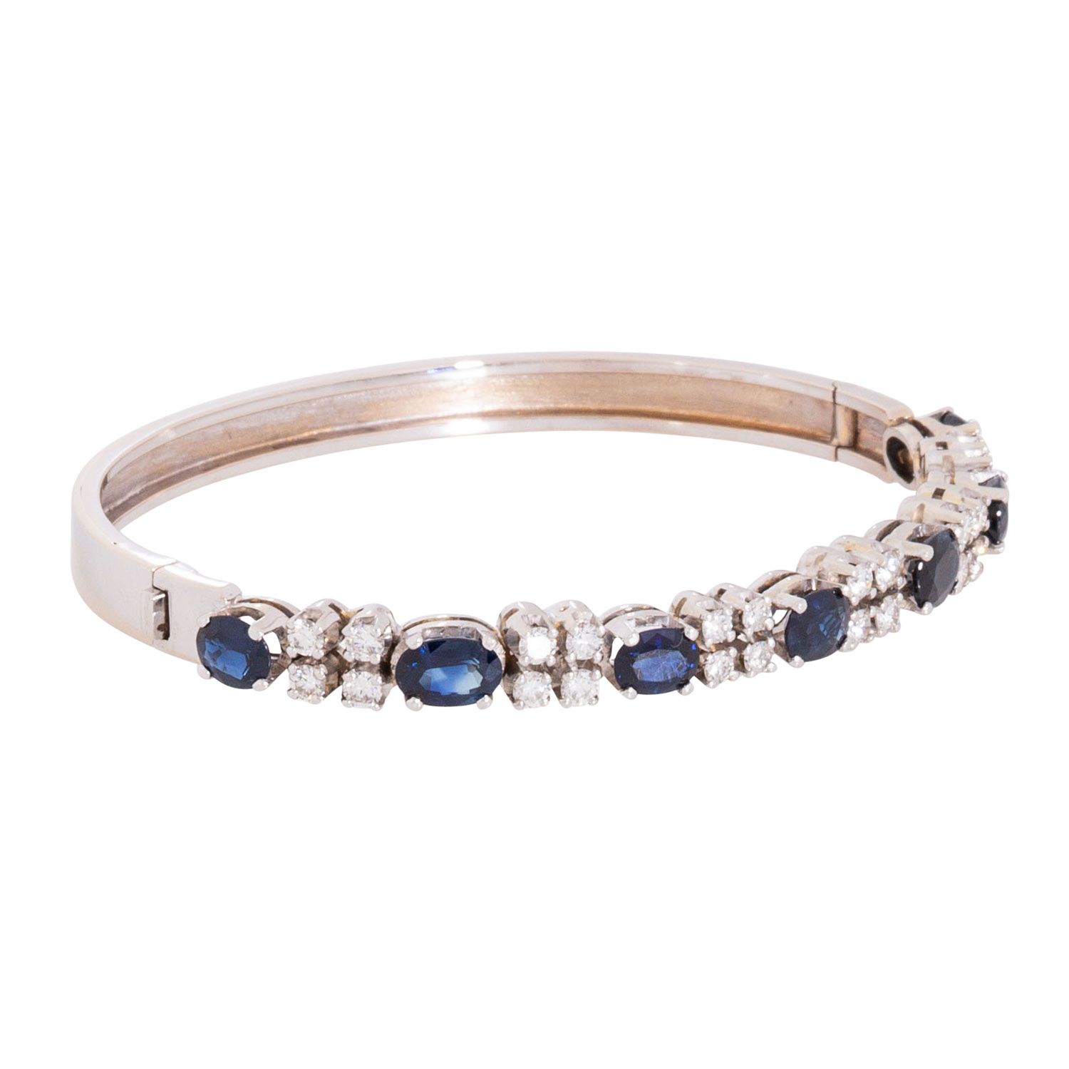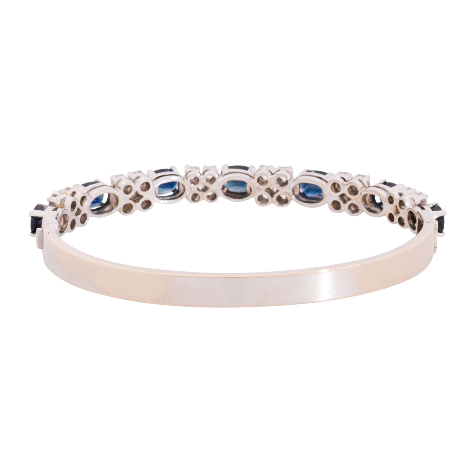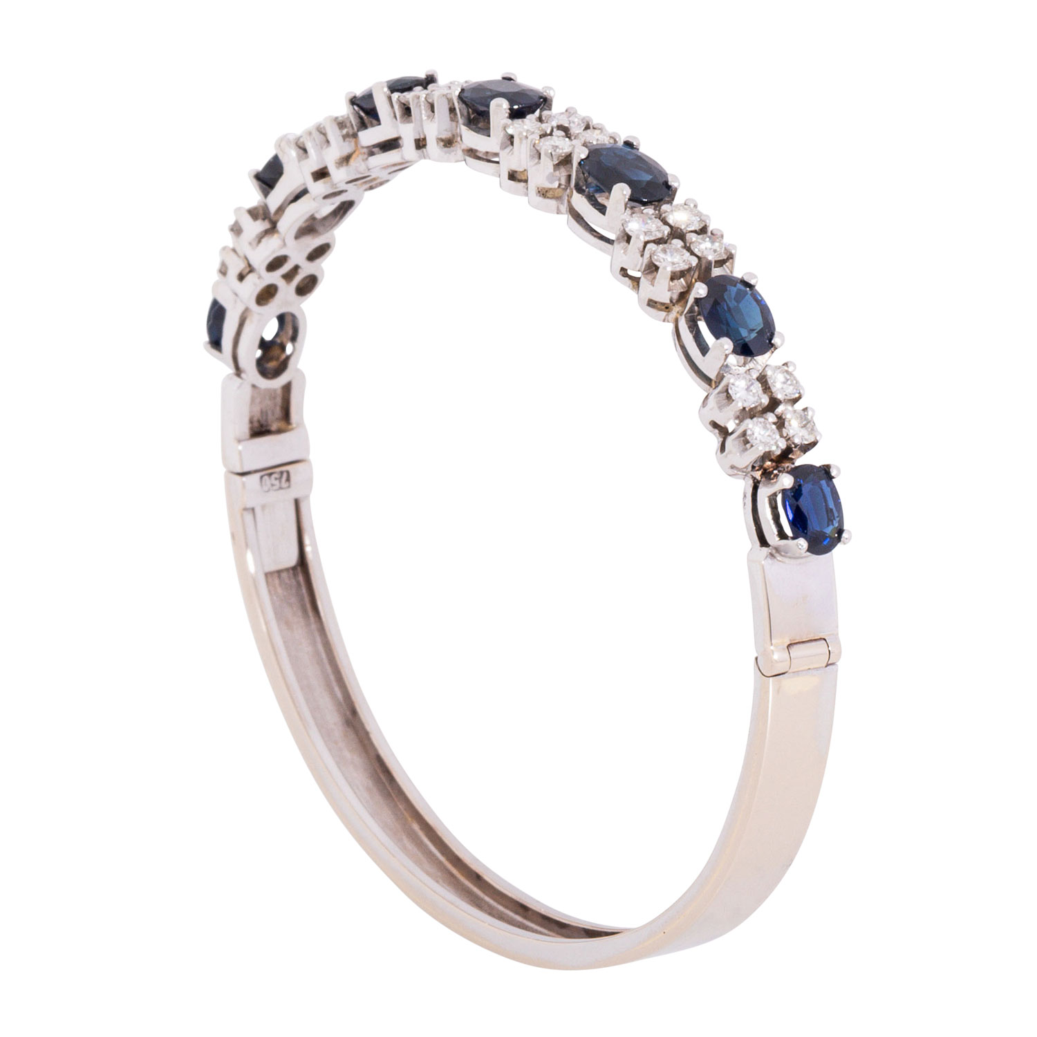 Bangle with 7 oval faceted sapphires, ap. 5.5 x 4.5 mm, 24 brilliant cut diamonds, totalling ap. 0.72 ct, good colour and clarity, 18K white gold, 16,9 g, inner circumference 15,7 cm, W: 5 resp. 6 mm, box clasp, late 20th century, minimal signs of wear.