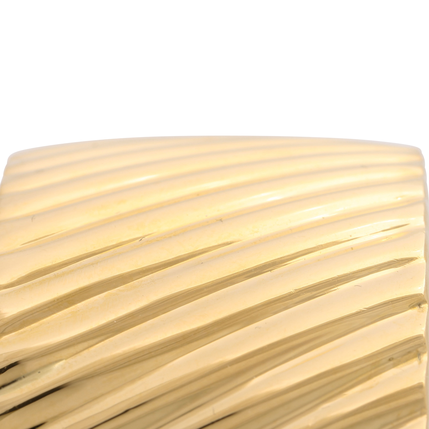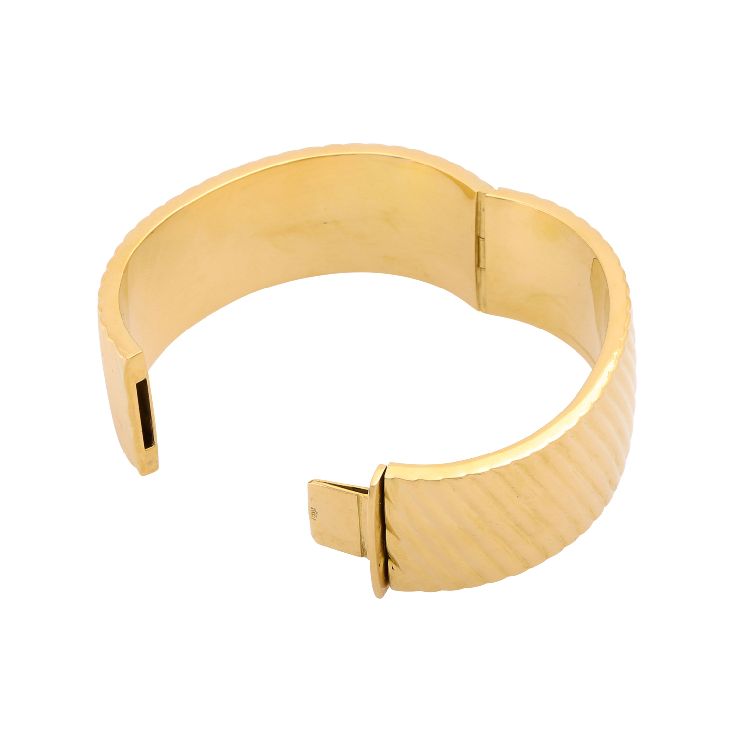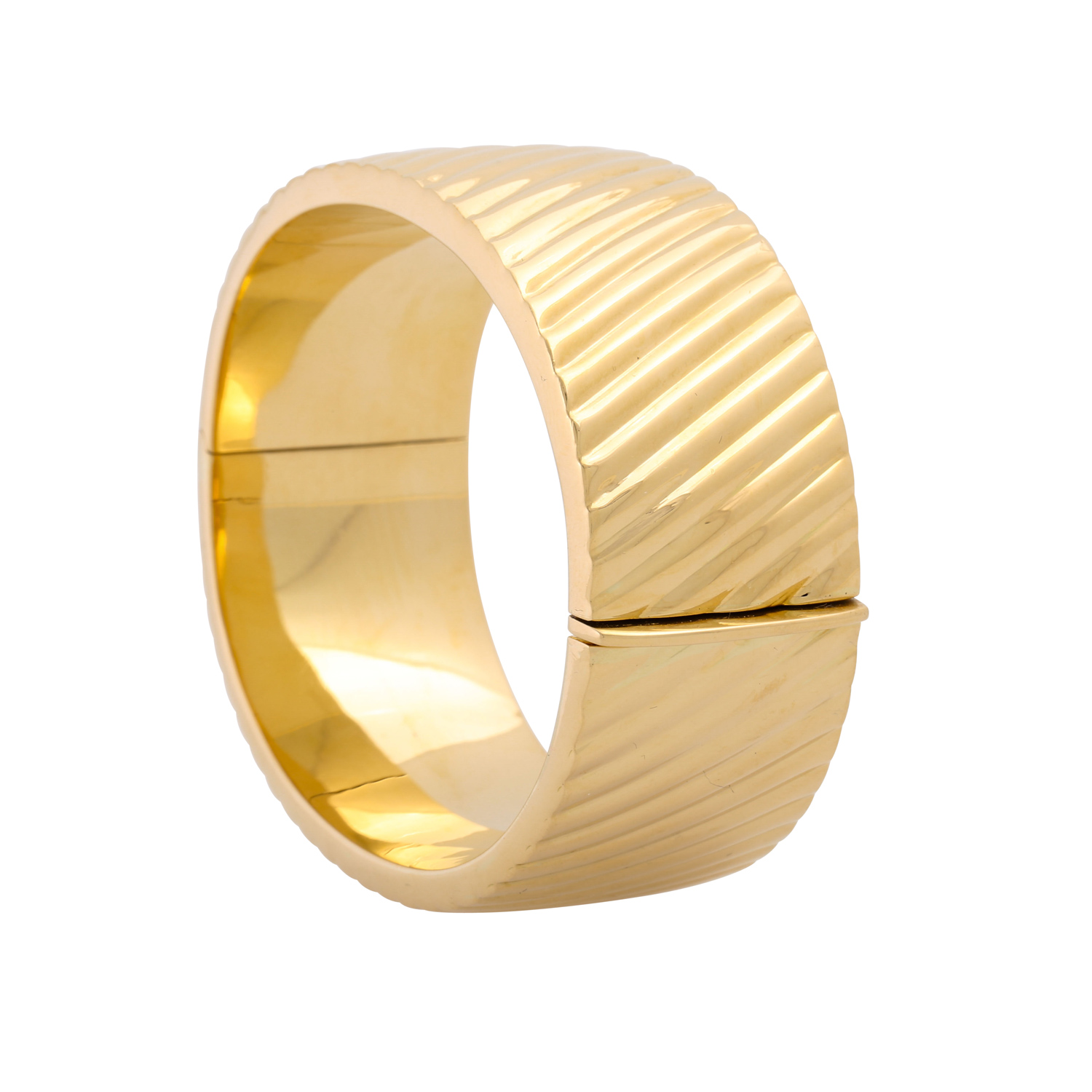 Bangle with finely structured surfache, 18K yellow gold, 70.8 g, W: 25.3 mm, inner circumference 17.5 cm, box clasp with double latch, late 20th century, minimal signs of wear.