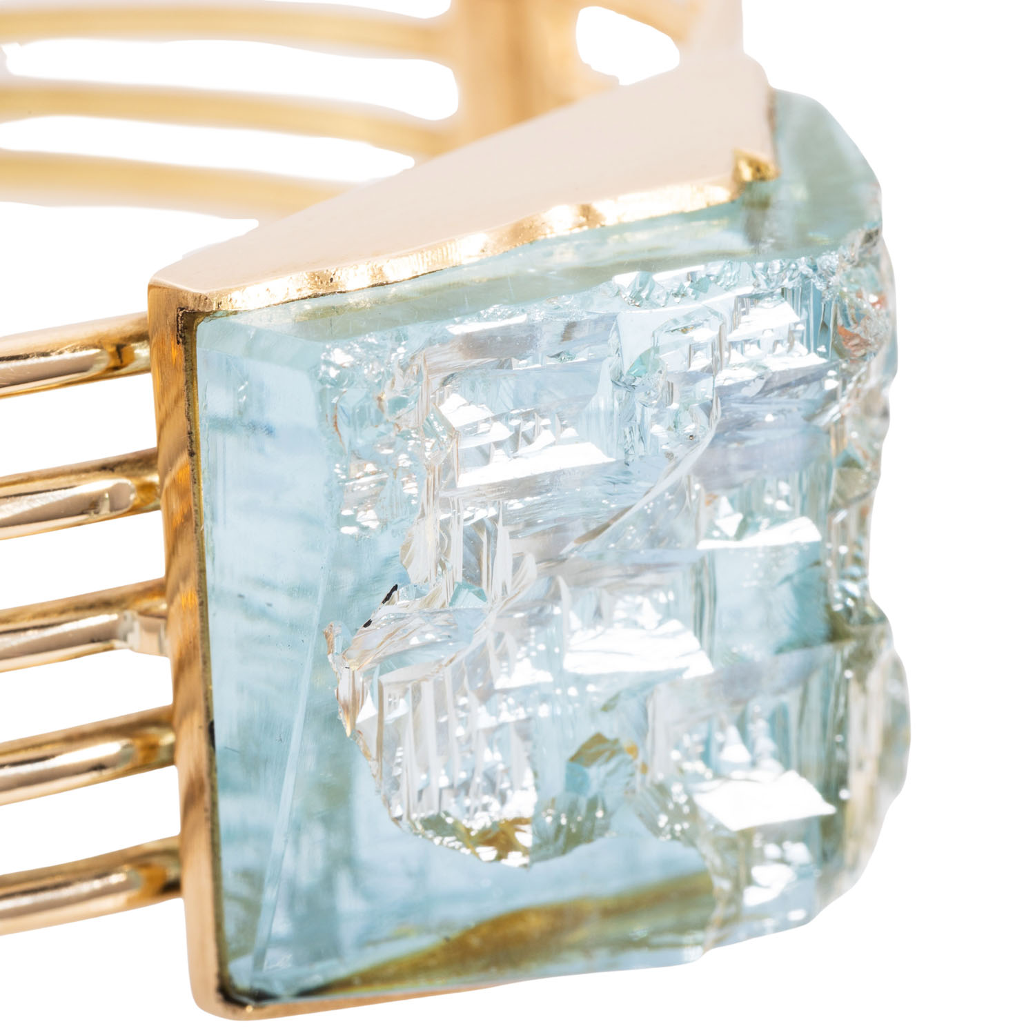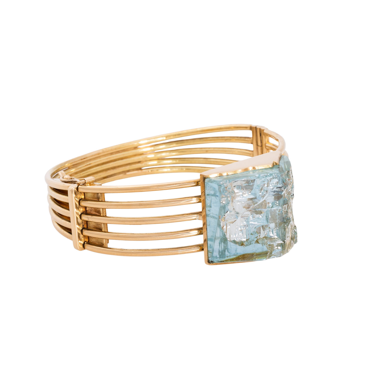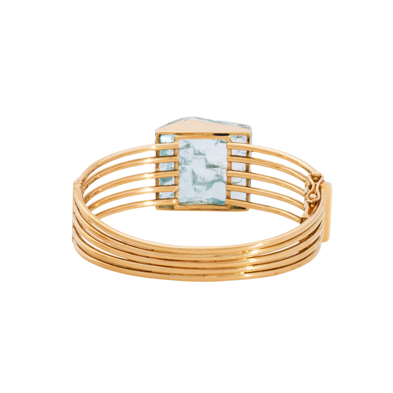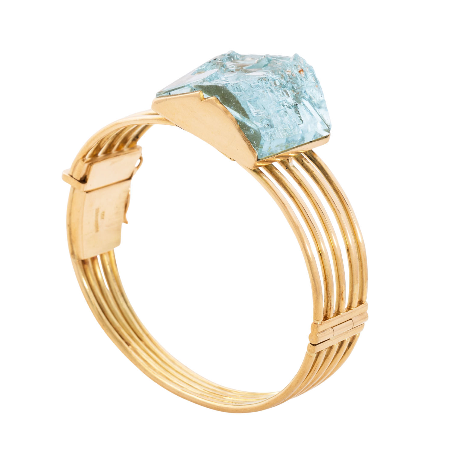 Bangle with aquamarine, measurements from approx 28.3 x 23.2 x 14.6 gr, front natural, 18K YG, 85 gr, fits wristsize up to approx 19 cm, late 20th century, slight signs of wear, handicraft unique.