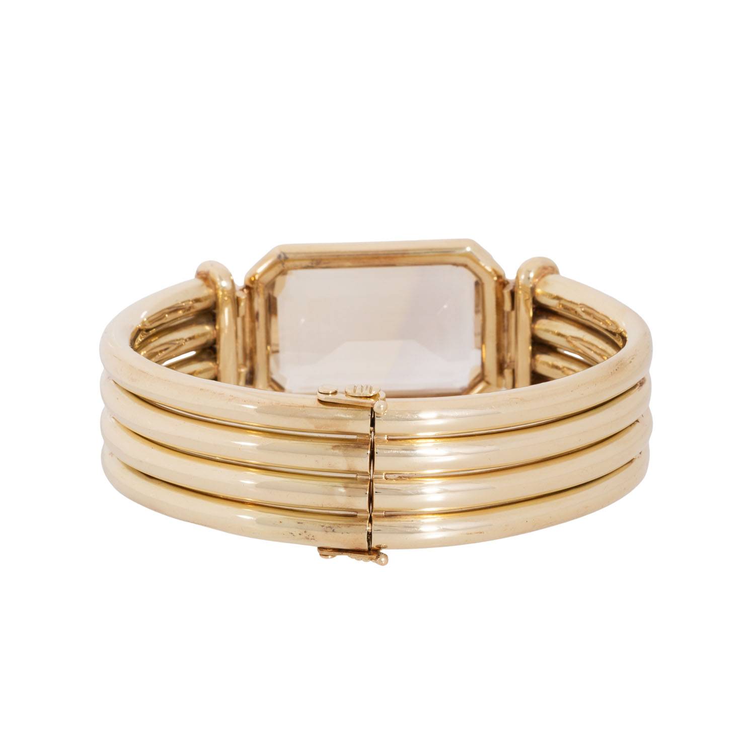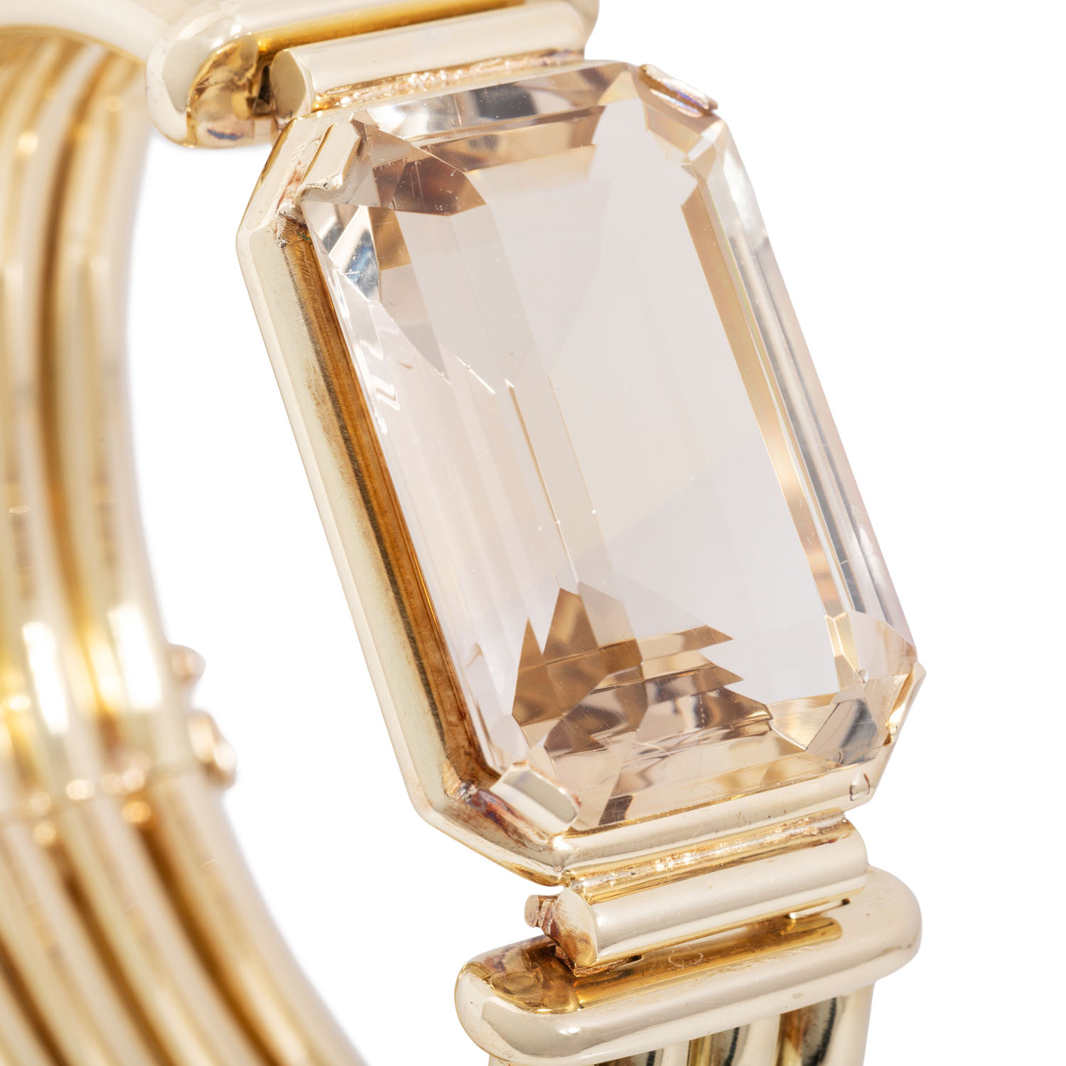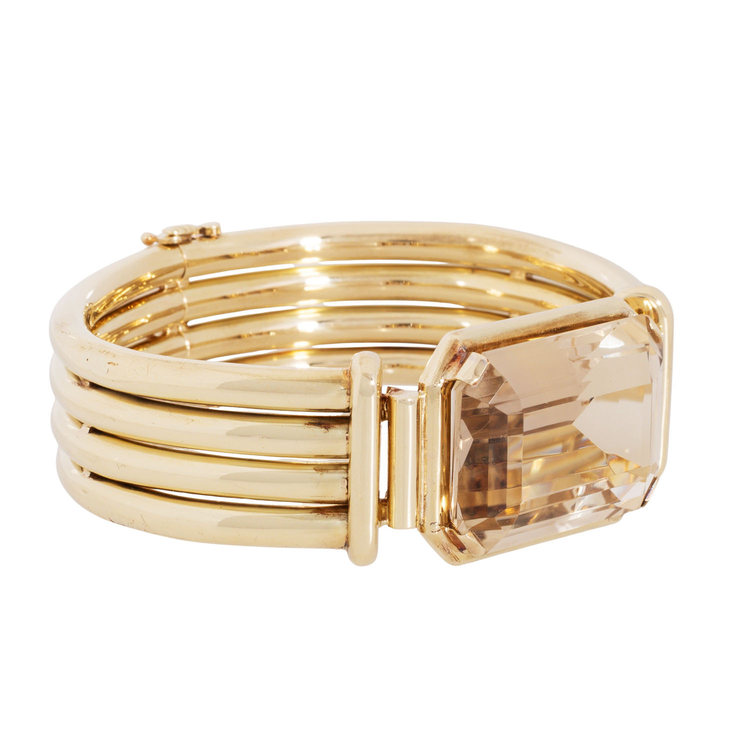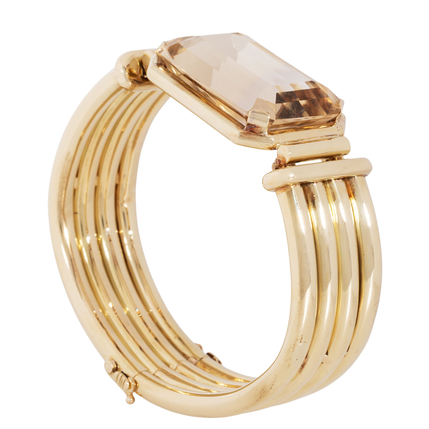 Bangle set with octogonal-cut citrine approx. 60.0 ct, 14K YG, 65,6 g, inner cercumference approx. 17 cm, middle of 20th century, signs of wear, slightly dented.
