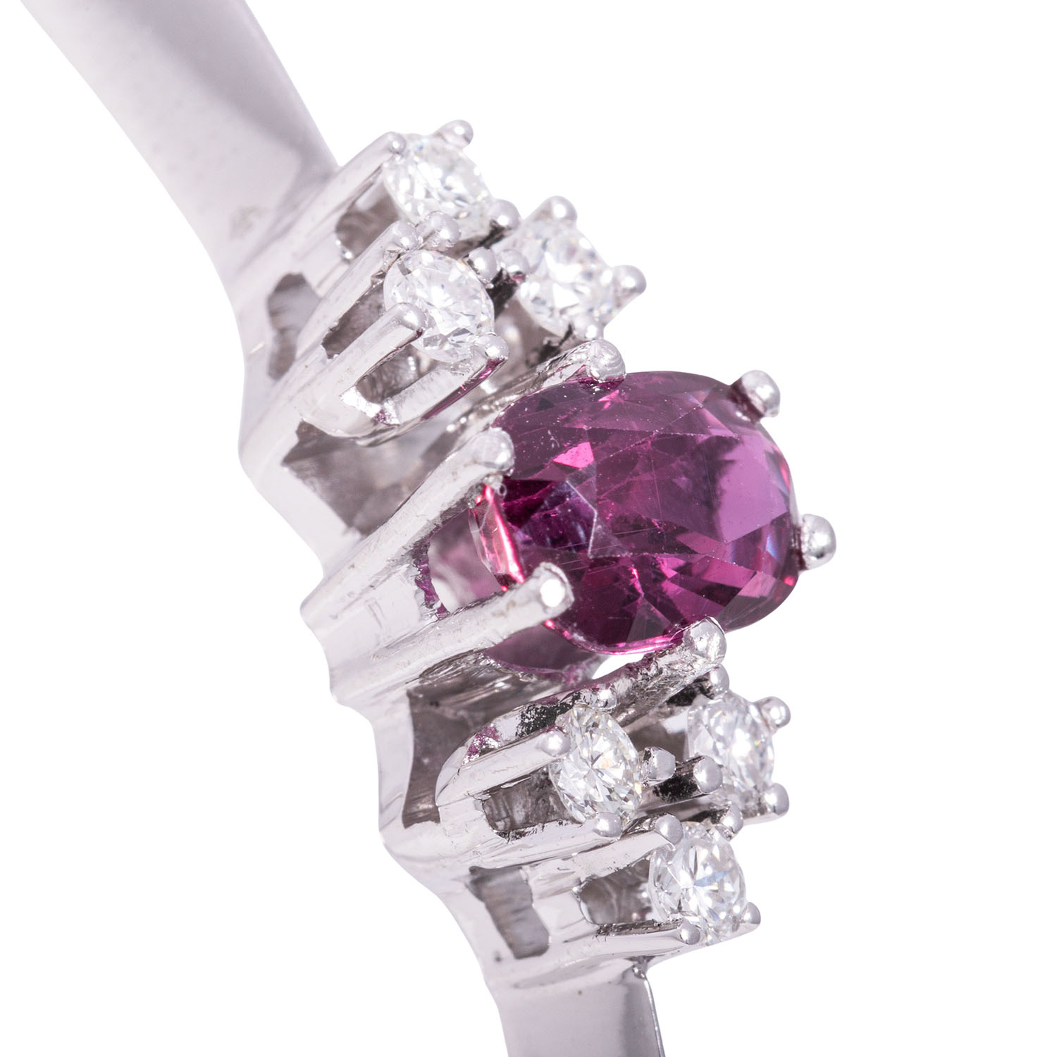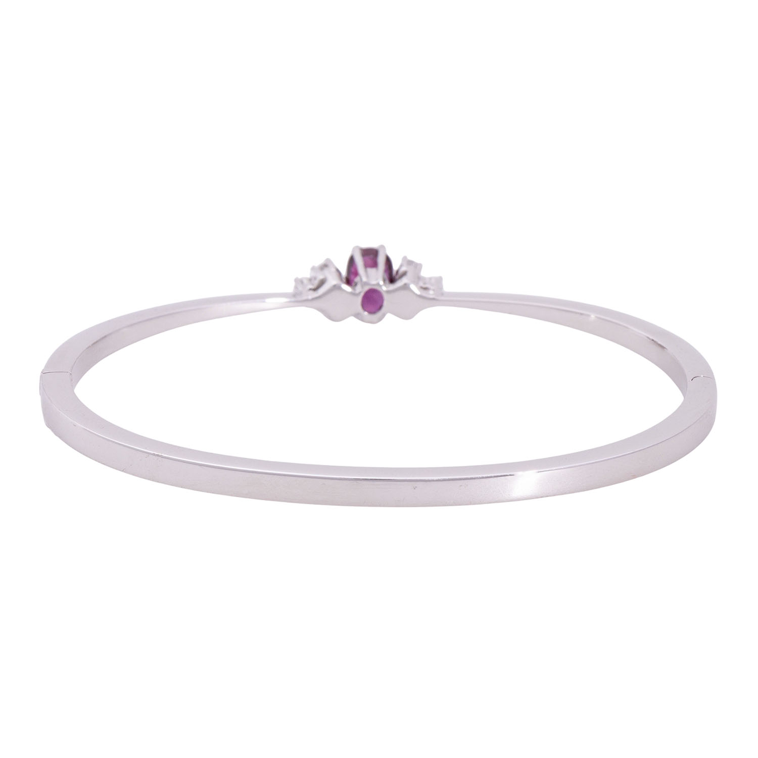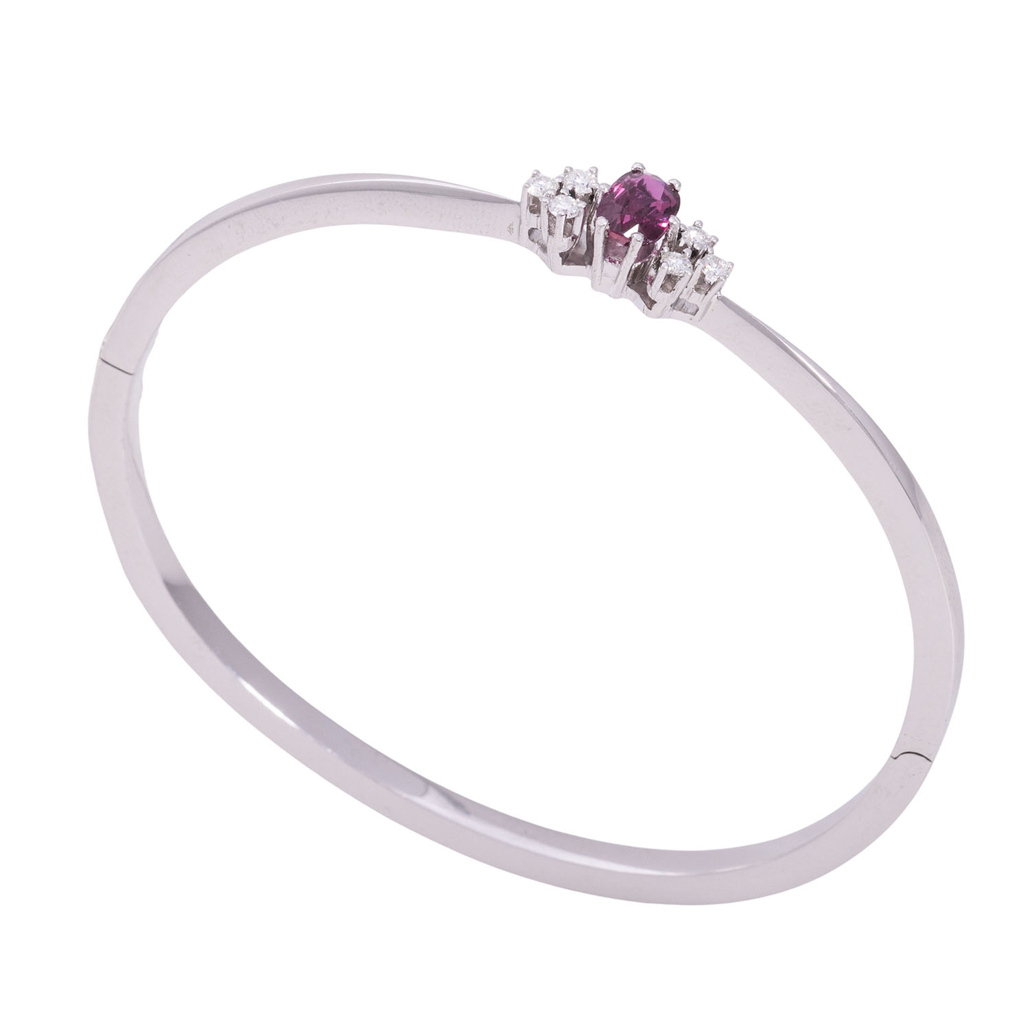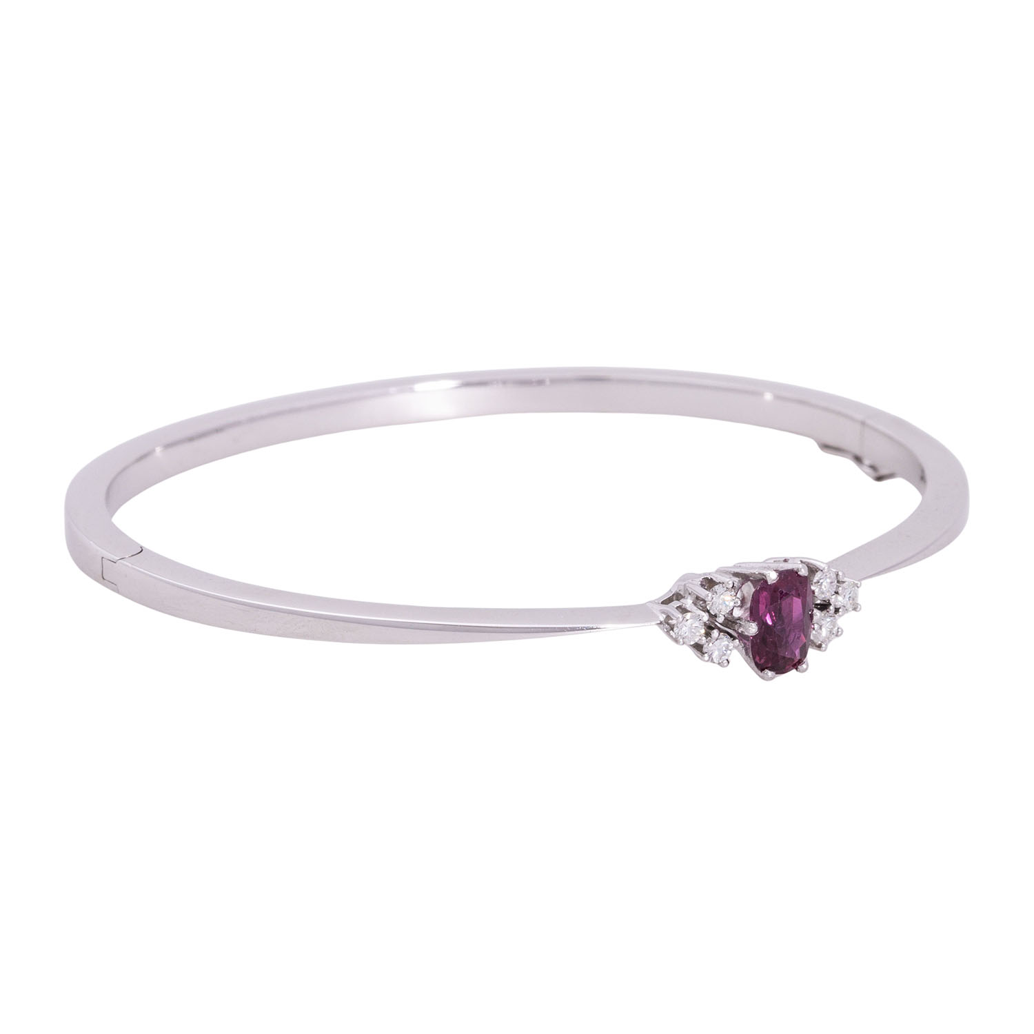 Bangle with ruby ??and 6 brilliant-cut diamonds totalling 0.27 ct (engraved), RW (F-G)/VVS, faceted oval-cut ruby ??approx. 1.20 ct, 18K white gold, 15.9 g, inner circumference: approx. 17 cm, W: approx. 3.1 - 7.8 mm, around 1970, minimal signs of wear, with hallmark.