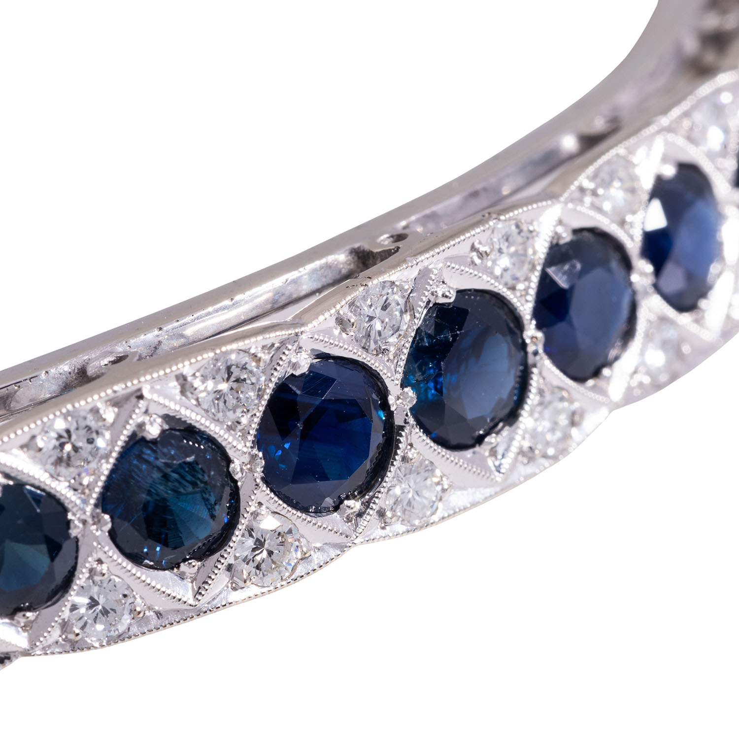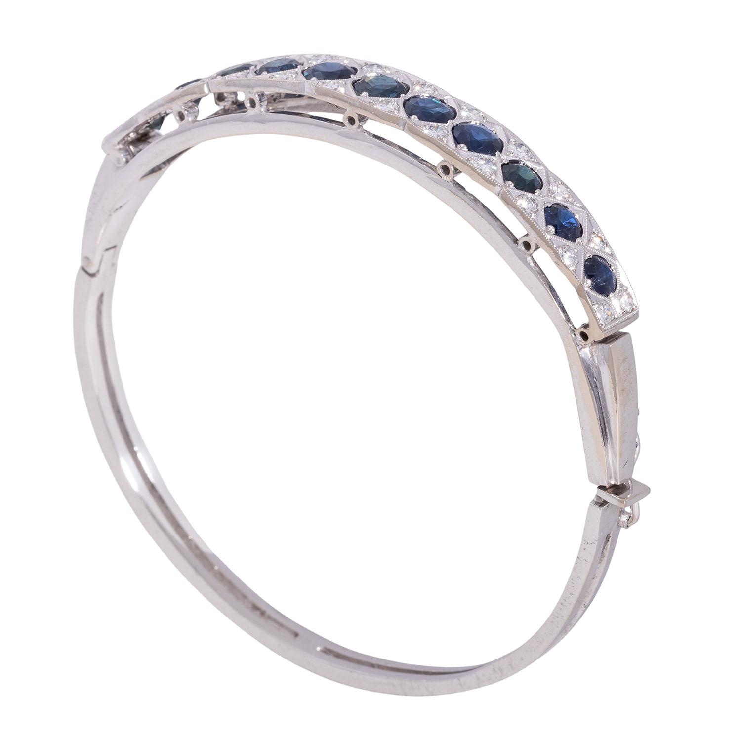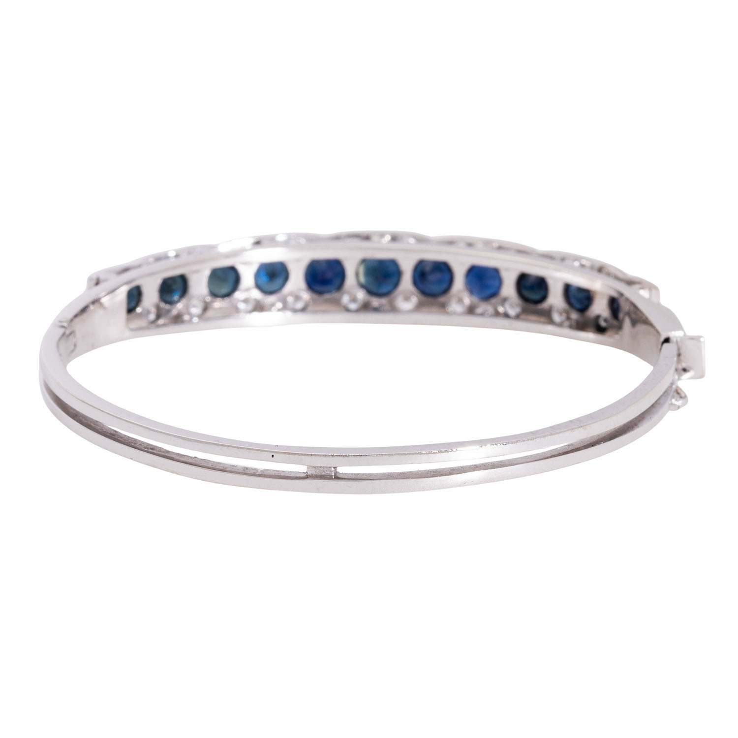 Bangle with 11 round faceted sapphires totalling ca. 4.8 ct, graduating in size and 24 brilliant-cut diamonds totalling ca. 0.9 ct, ca. WHITE-TIW (H-K)/VS-SI in nice setting with millegriffes decorations, 14K white gold, 22 g, inner circumference 17 cm, ca. 1950s, with signs of wear and work, clasp slightly wound.