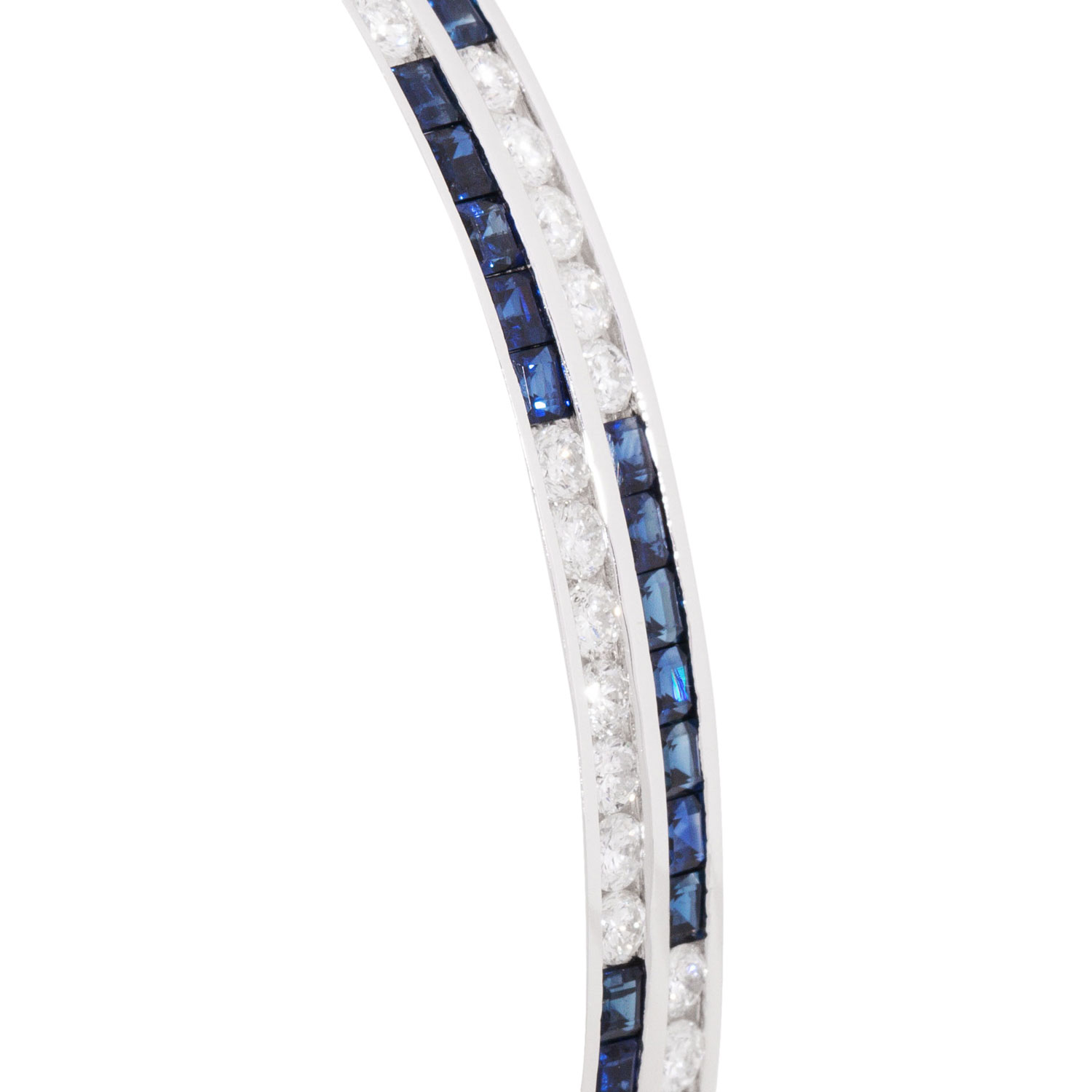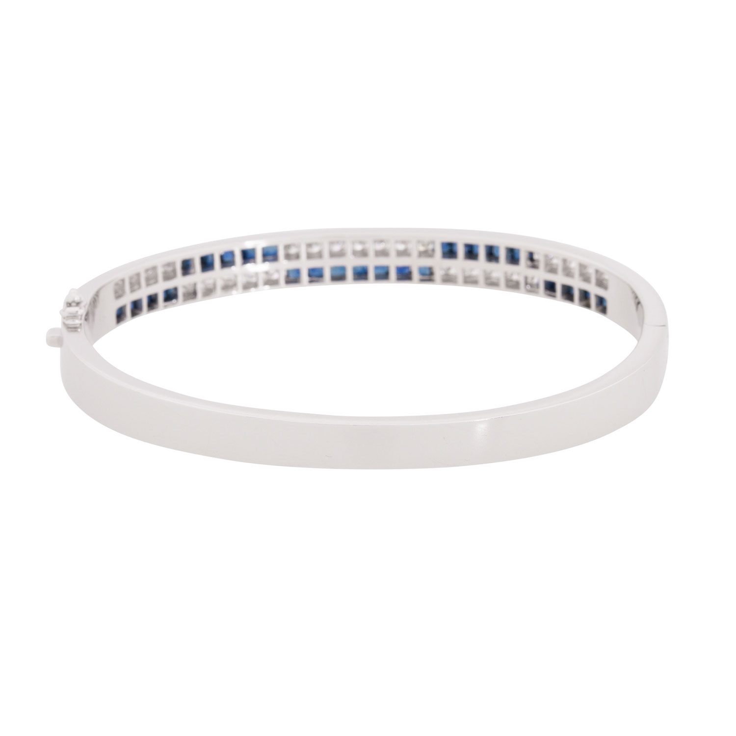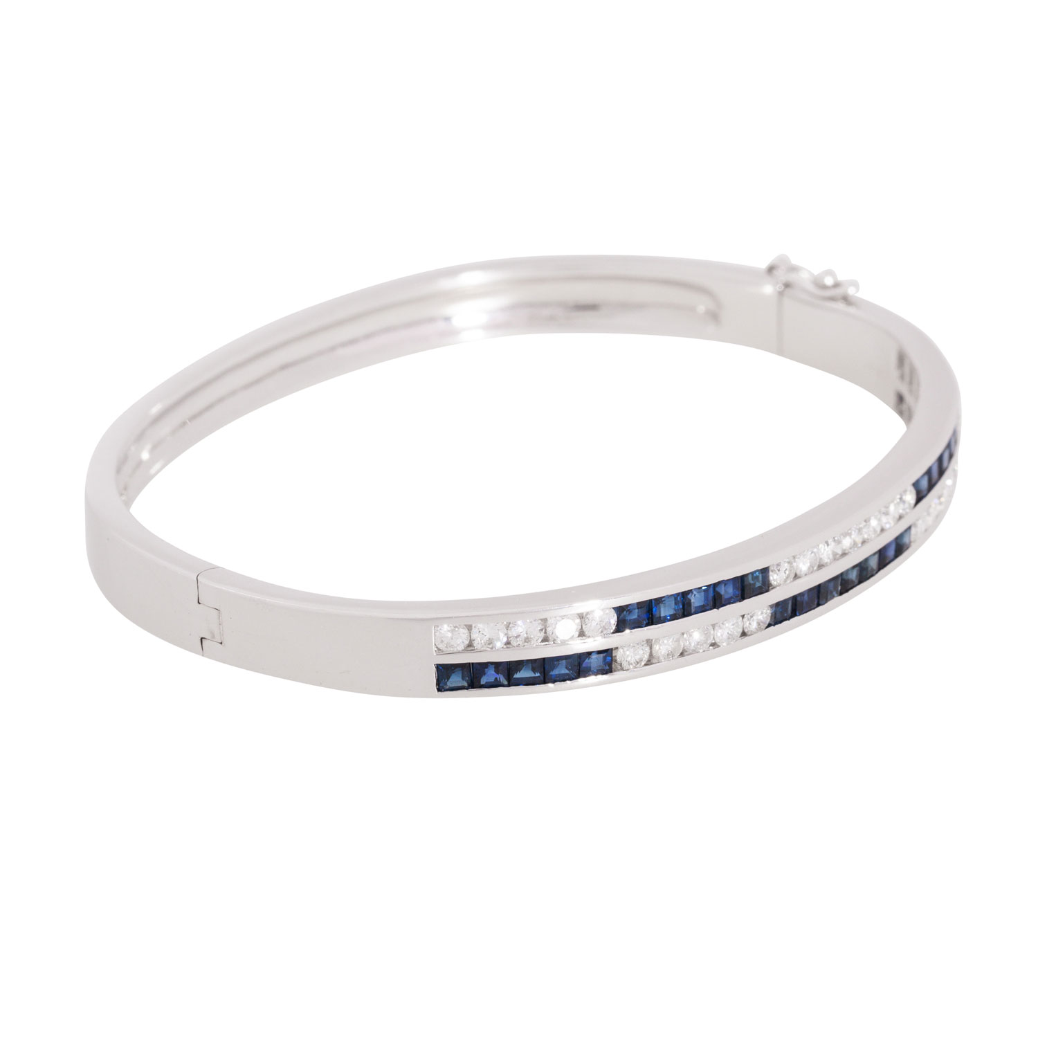 Bangle with brilliant-cut diamonds totall. ca. 1.37 ct, good colour and clarity, saphires totall. ca. 2.73 ct, 18K white gold, 28,1 g, inside circumference: ca. 17 cm, late 20th century, minor signs of wear, box clasp with safety catch.