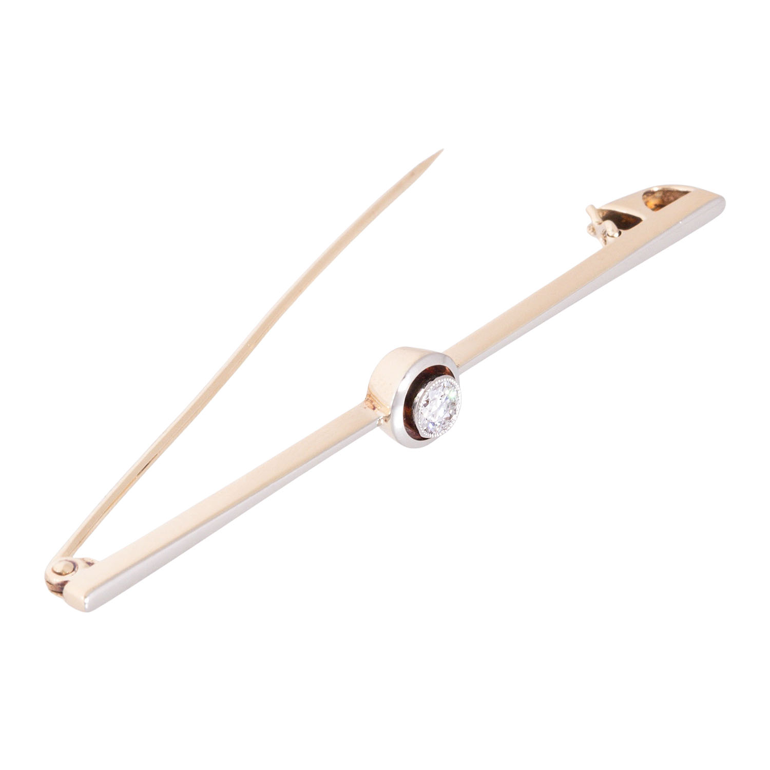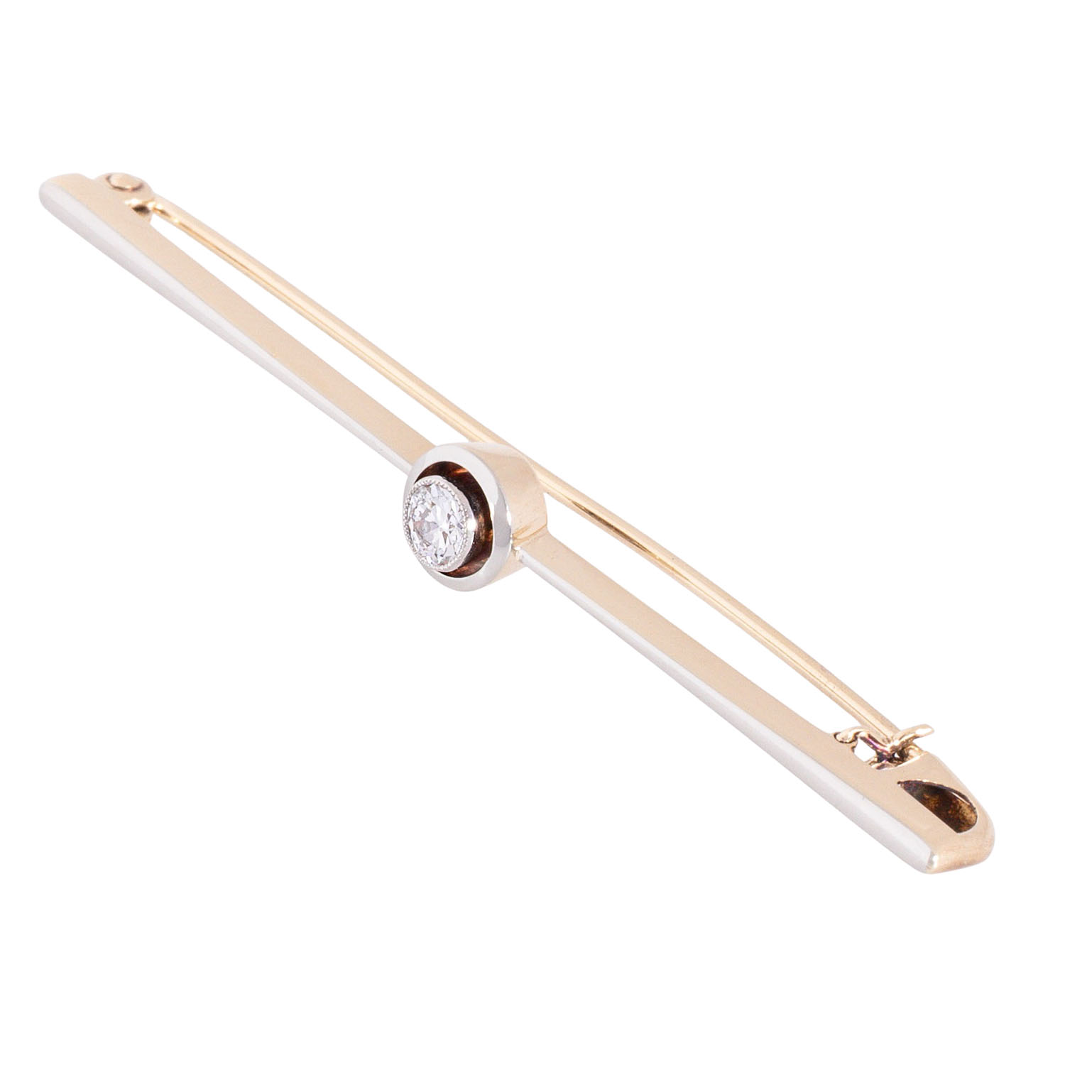 Bar brooch with old-european-cut diamond approx. 0.10 ct, WHITE (H)/SI, 14K yellow gold/white gold, 2.7 g, L: approx. 53.8 mm, W: approx. 1.1 - 5.9 mm, mid 20th century, minor signs of wear, needle slightly bent, diamond with notch.
