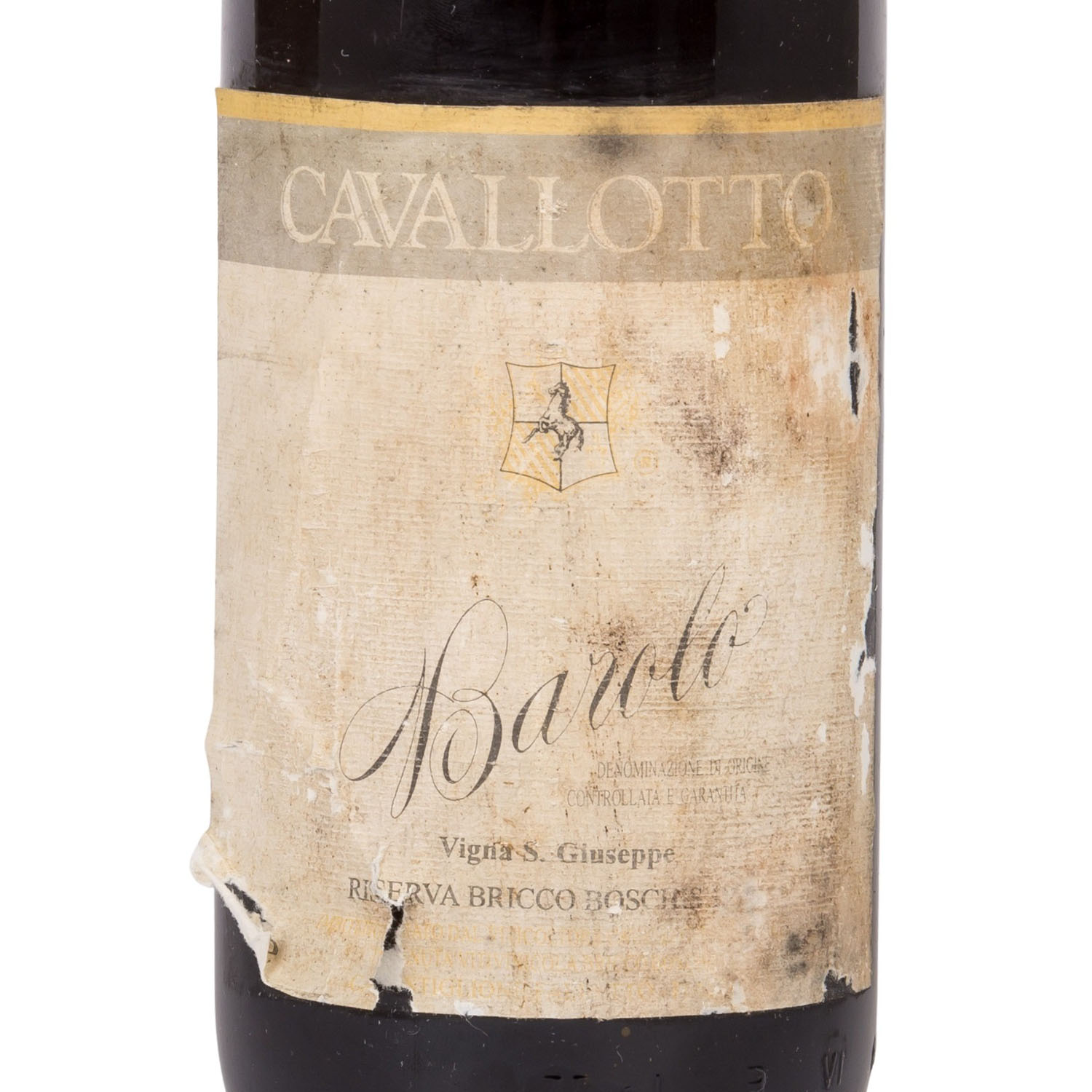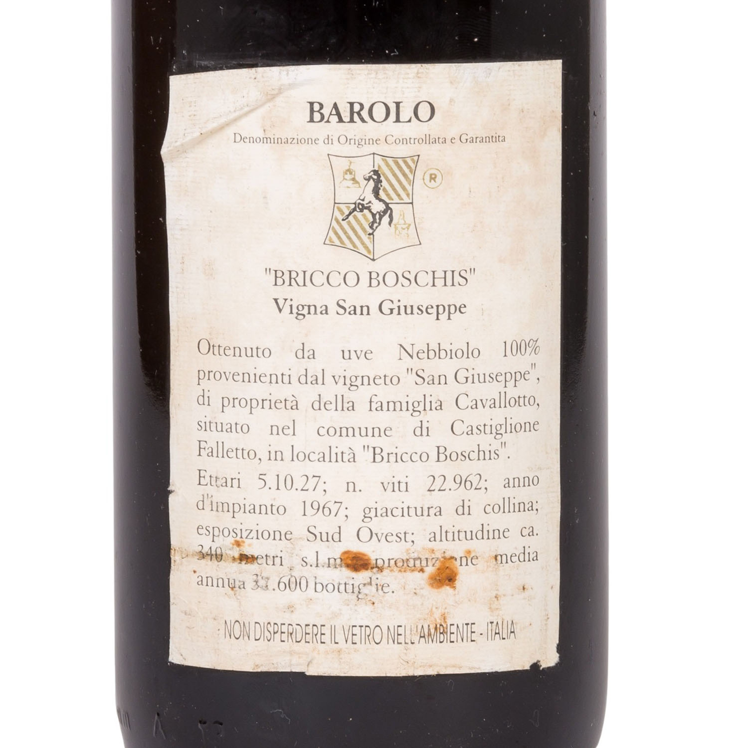 BAROLO RISERVA BRICCO BOSCHIS CAVALLOTTO Vigna San Giuseppe 1 bottle, Piedmont, Italy, 750 ml, 14% vol., level IN (into neck). Signs of age and storage. Label and capsule damaged. Vintage year not verified.