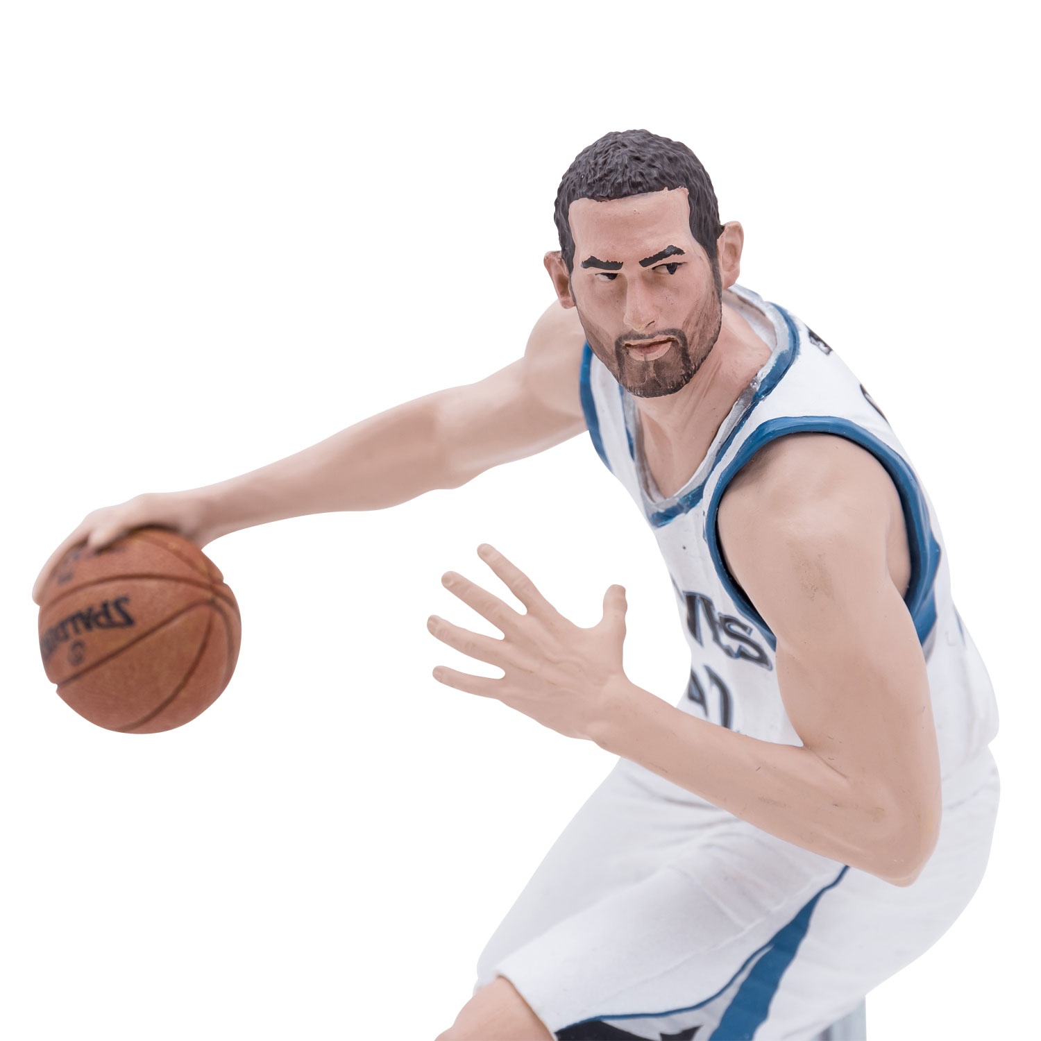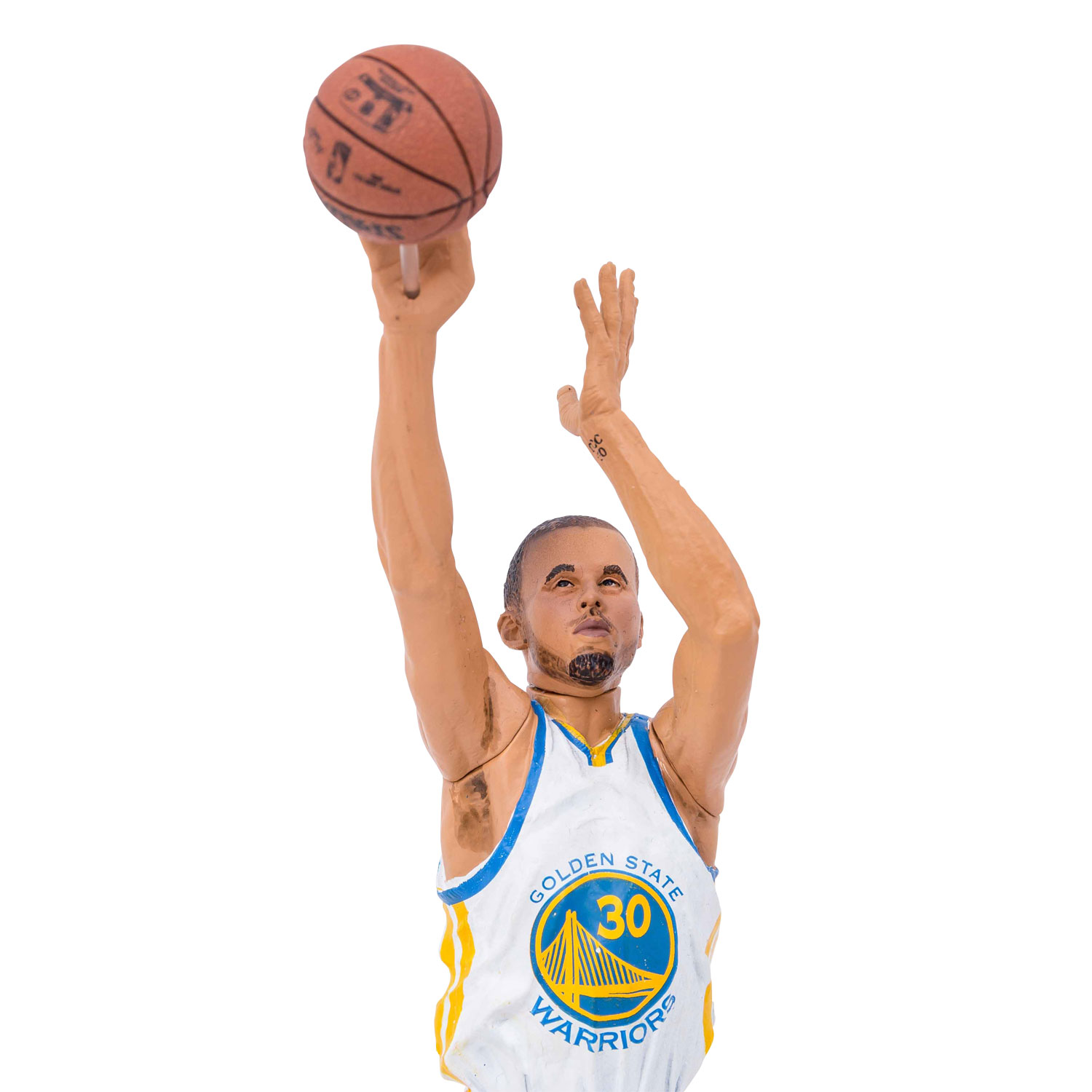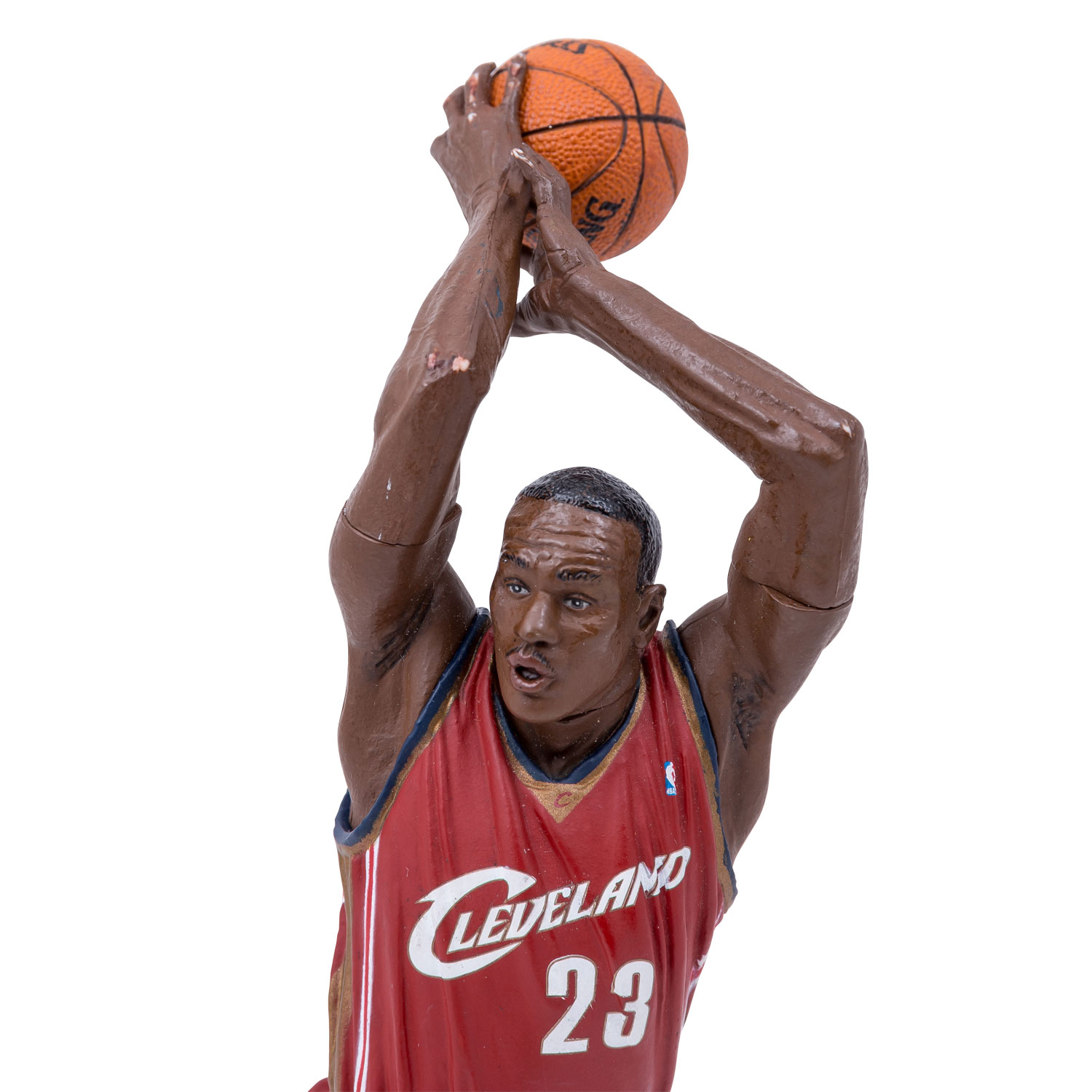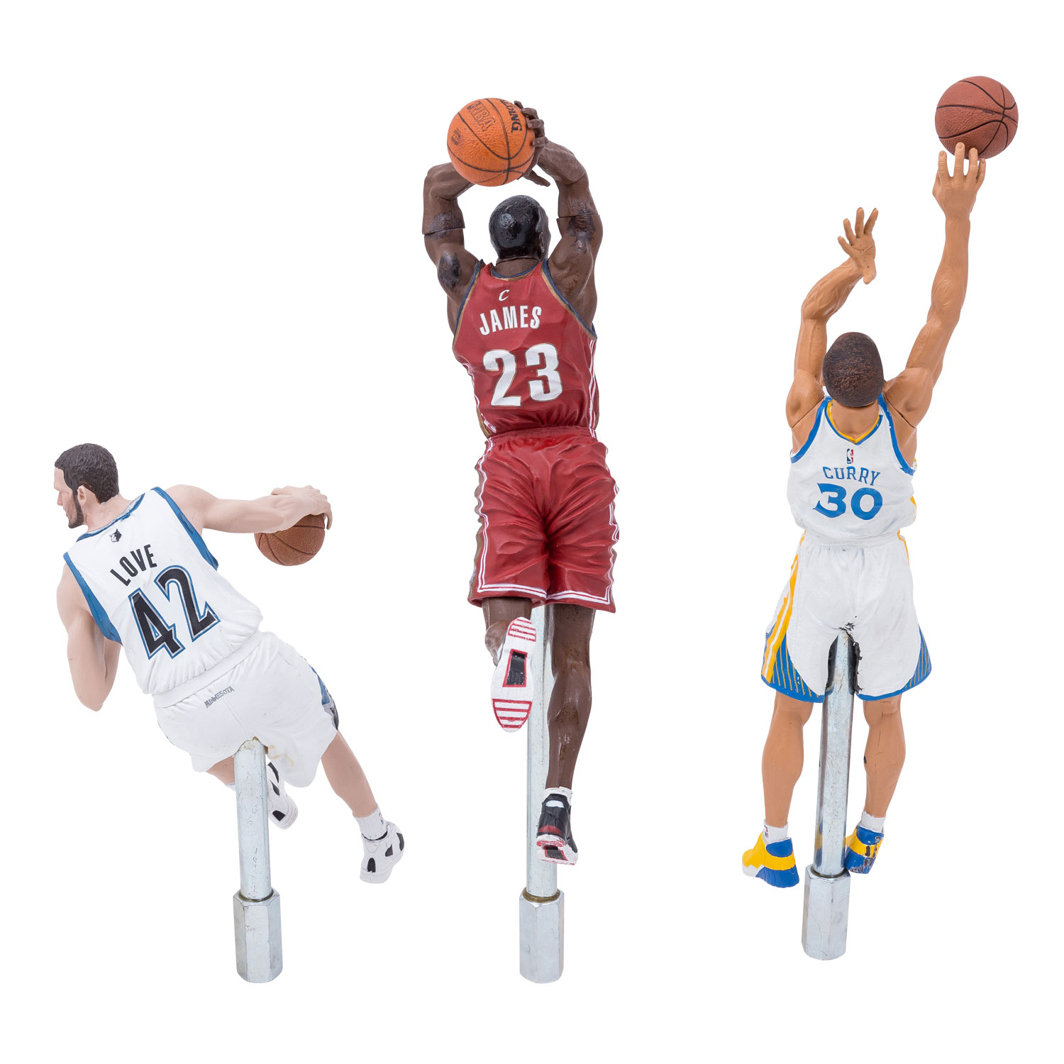 BASKETBALL - 3-piece set with figures of the players James LeBron, Stephen LeBron and Kevin Love. Manufacturer McFarlane, probably with self-attached fixtures for screwing on. H: each approx. 16-25 cm (with thread approx. 17-268 cm). Partly heavily damaged, with traces of glue, discoloration and signs of age and storage.