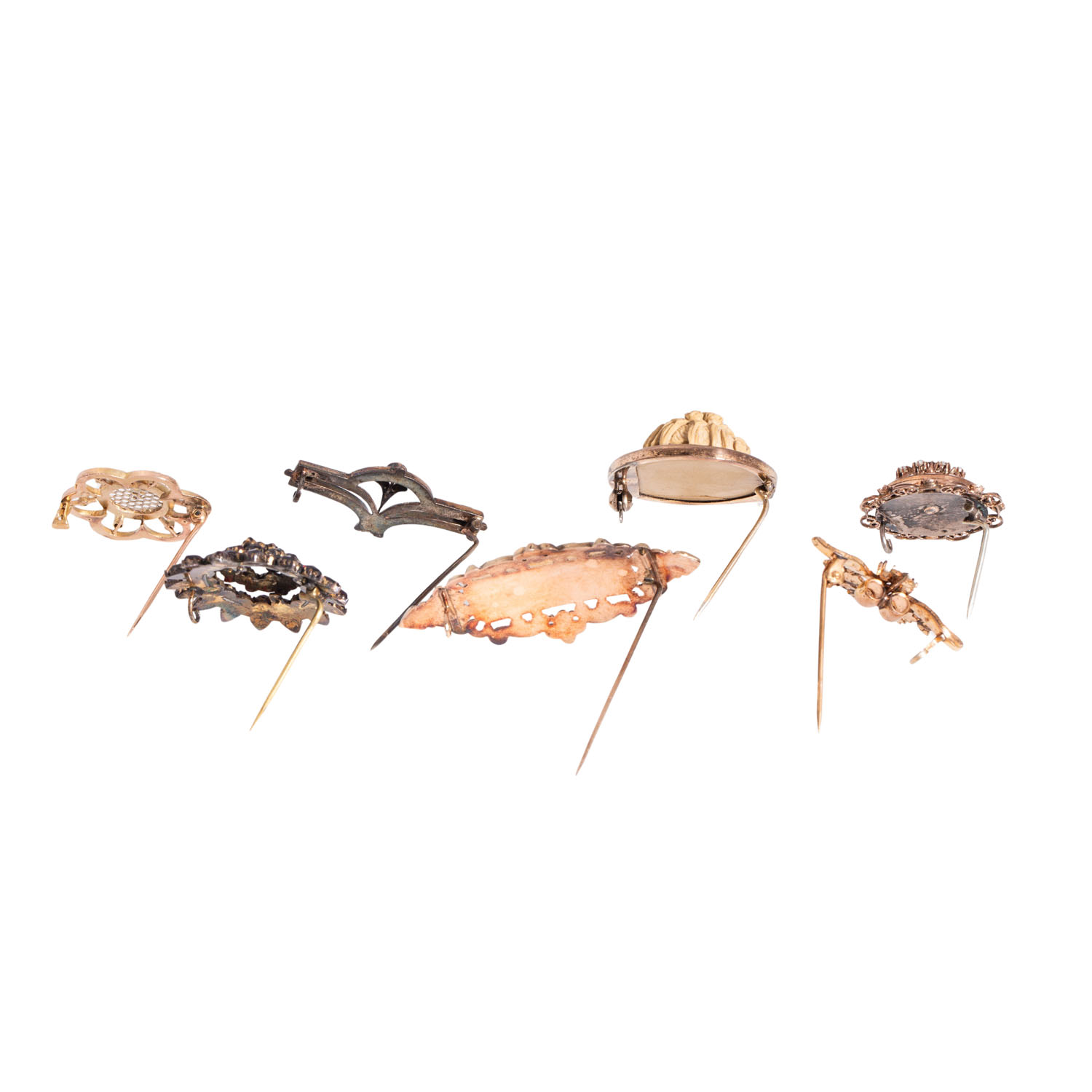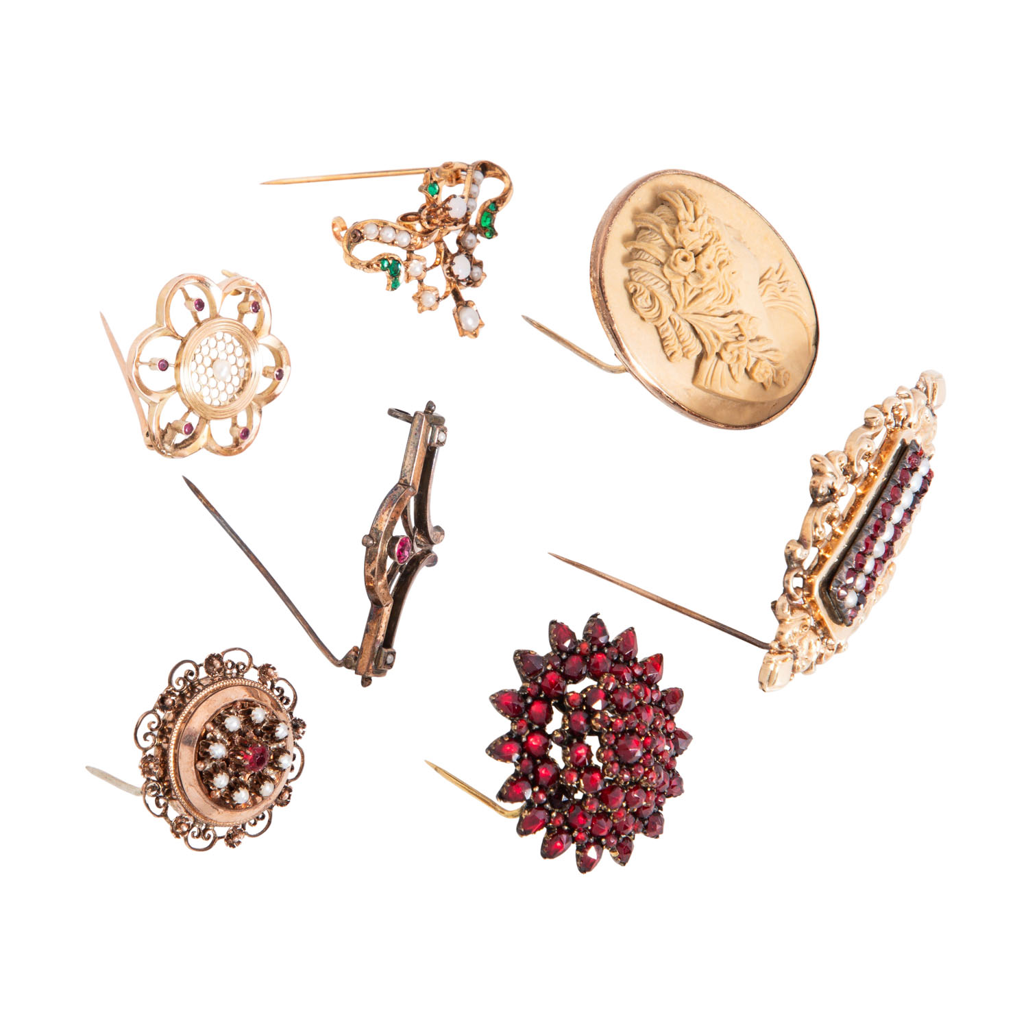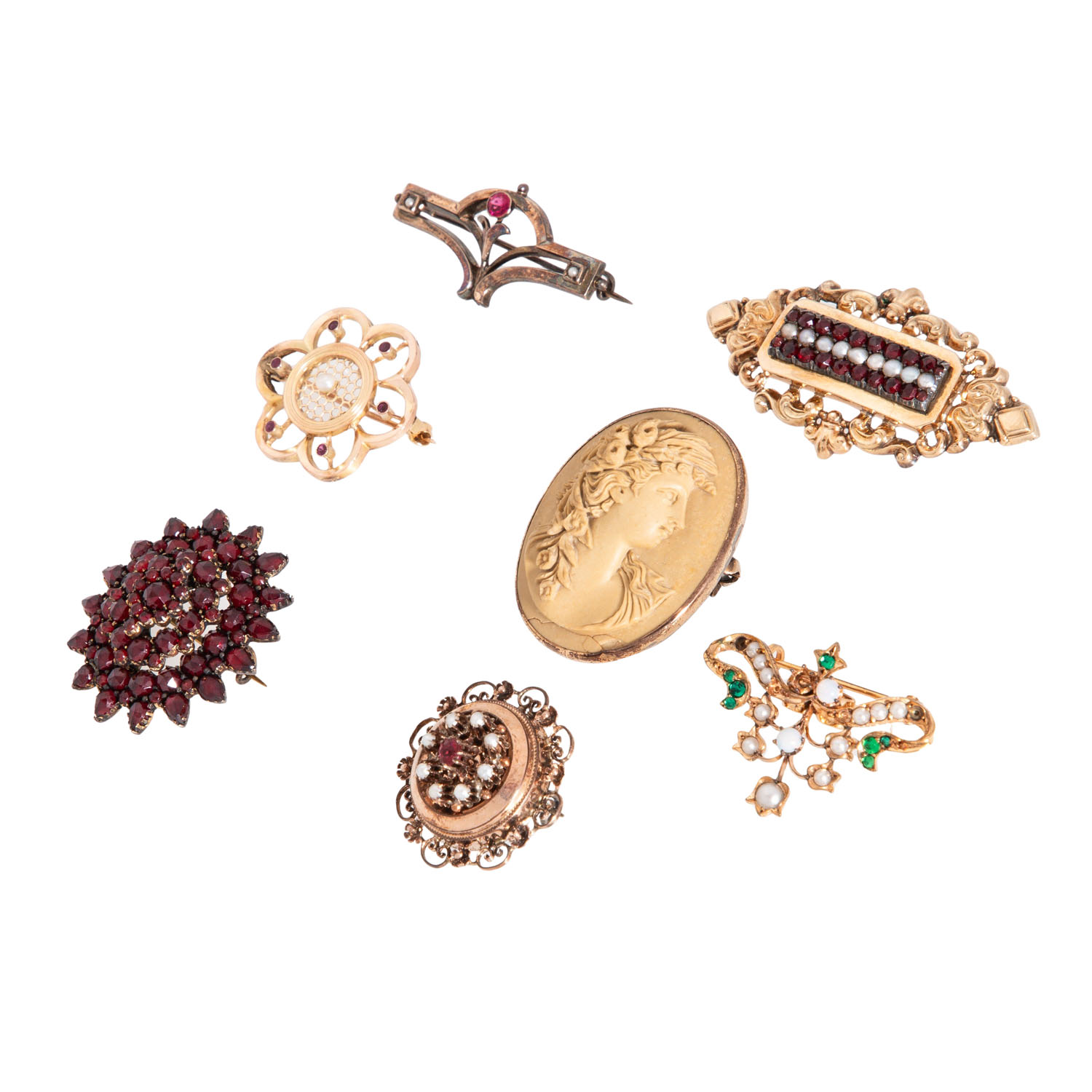 Beautiful antique bundle of 7 fine brooches, partly 14K yellow gold, partly doublé, with different gemstones and pearls, 1 opal and half pearls missing, around 1900, age-relating all in all very good condition.