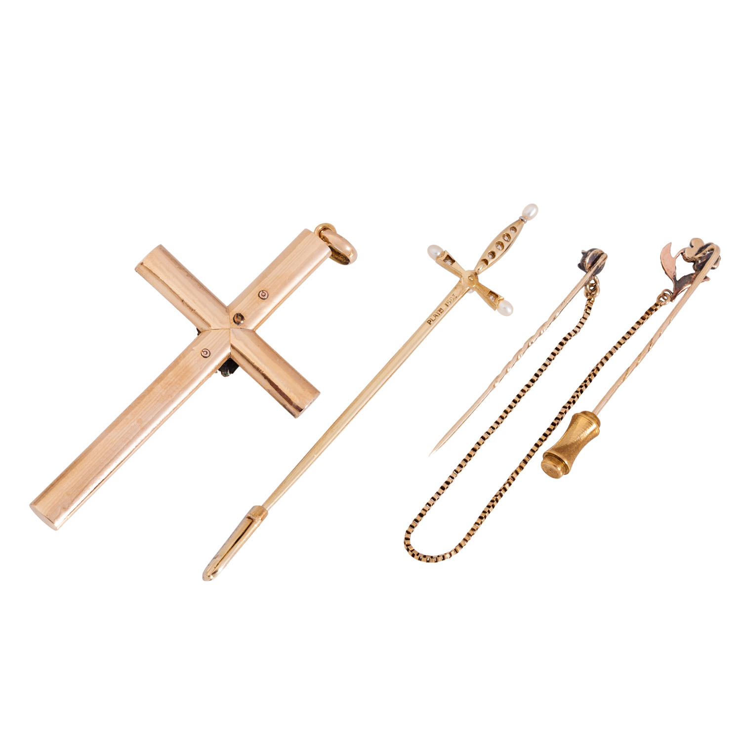Bundle of antique jewellery consisting of cross pendant 8K yellow gold, 3.4 g, needle with pearls and rose-cut diamonds and nice crafted safety catch, ca. 15K yellow gold, face side platinum, 2.8 g, double needle with rose-cut diamonds ca. 12K yellow gold, connecting chain from later times 14K yellow gold, 2 g, safety catch of metal, around 1900-1920, age-relating good condition.
