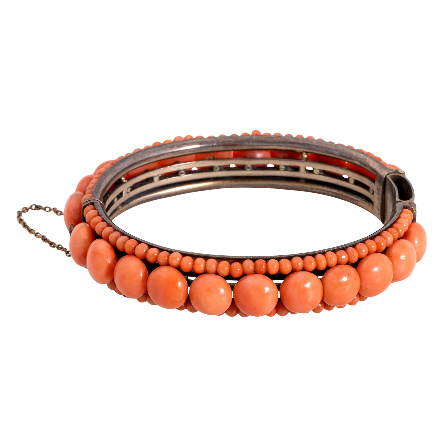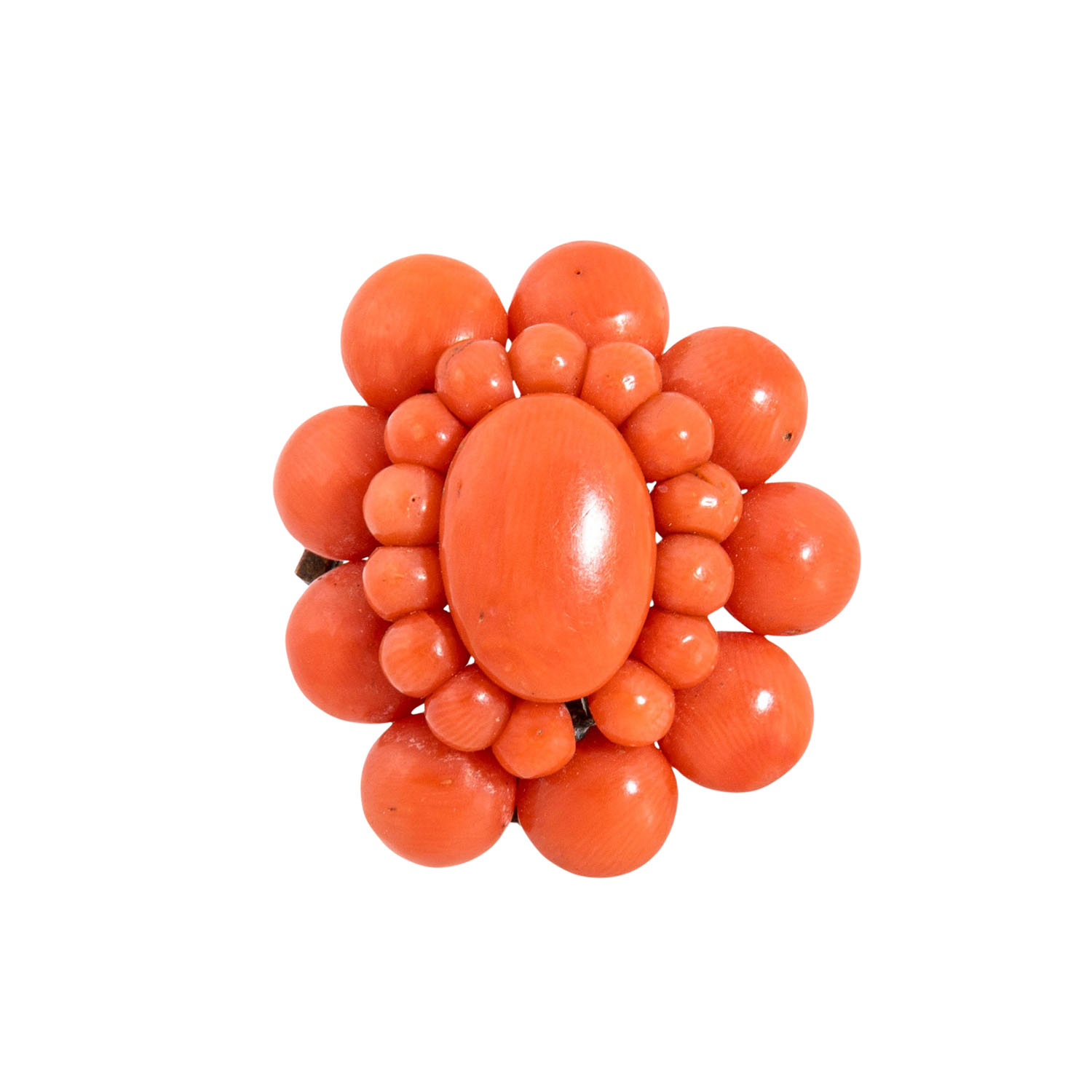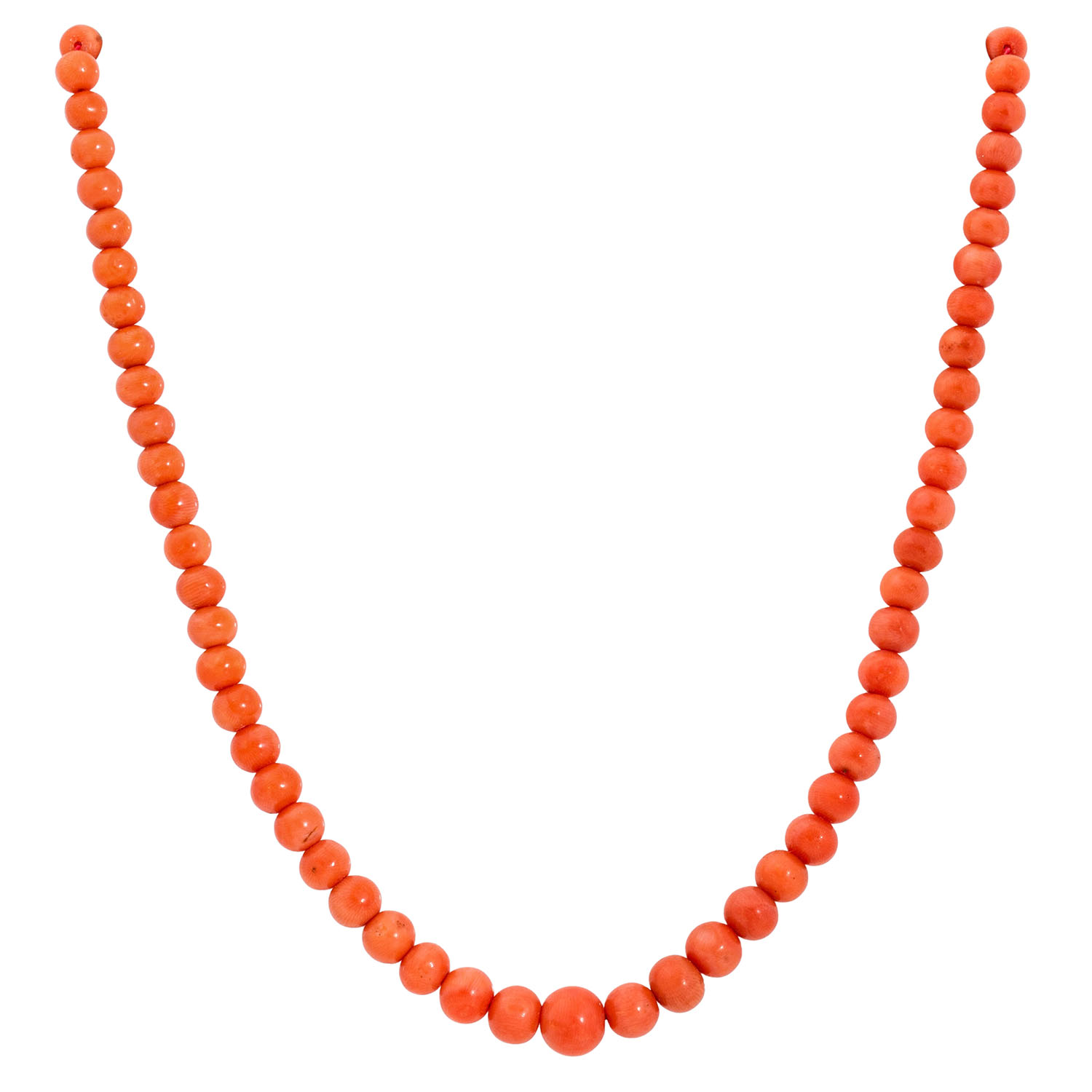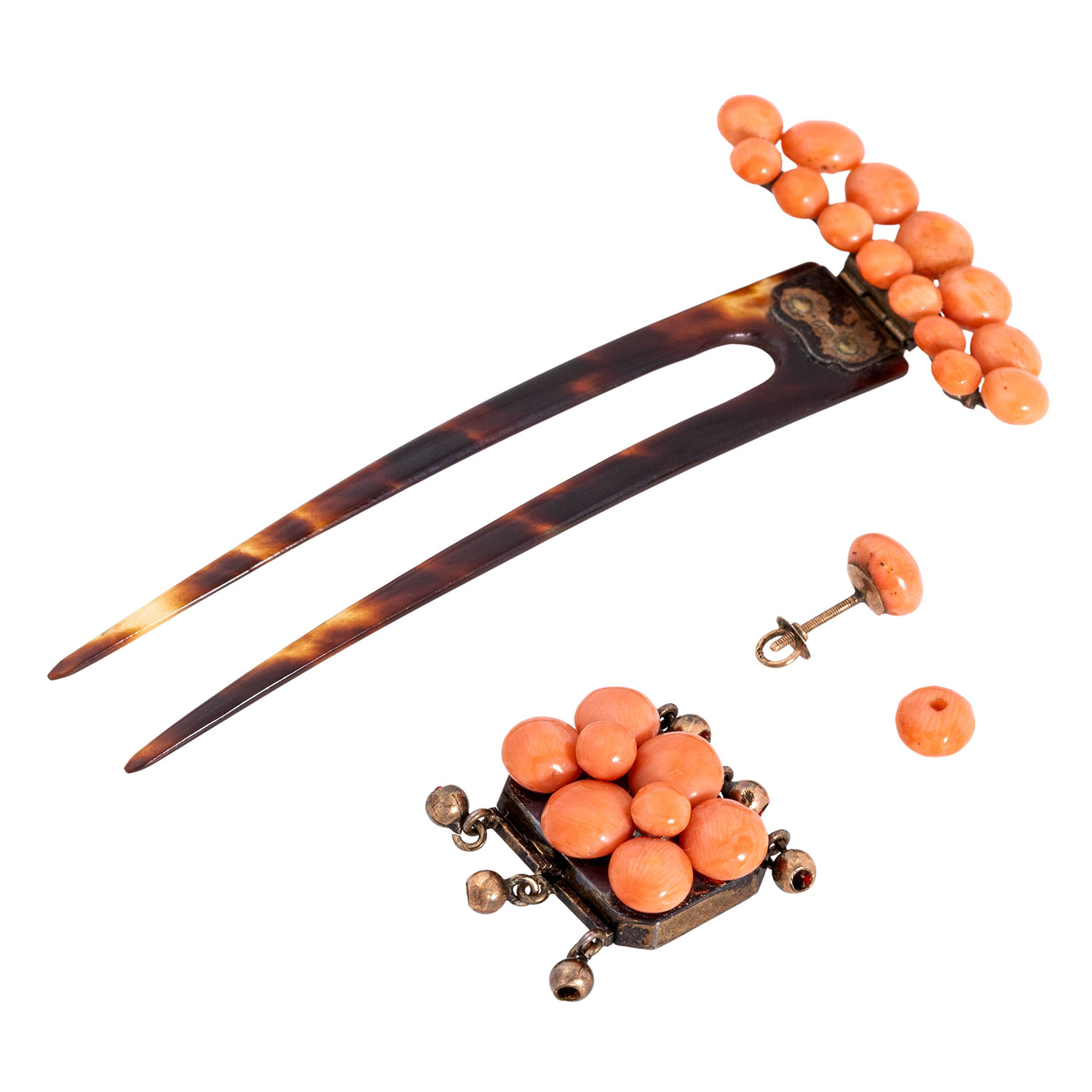 Beautiful set of sardegna coral jewellery, consisting of 1 bangle and 1 brooch with lens, both basemetal, 1 long necklace of spheres graduating in sizes 4.5-9 mm, L: 70 cm and 1 hair comb with lenses, clasp and fittings made of silver, comb of bakelite, 1 loose clasp with lenses of YG 10K, 4.4 g, 1 single ear stud of RG 14K with lens and another loose lens, 19th/20th century, in very good condition in large parts, beautiful coral quality. NO SHIPPING OUTSIDE THE EU!