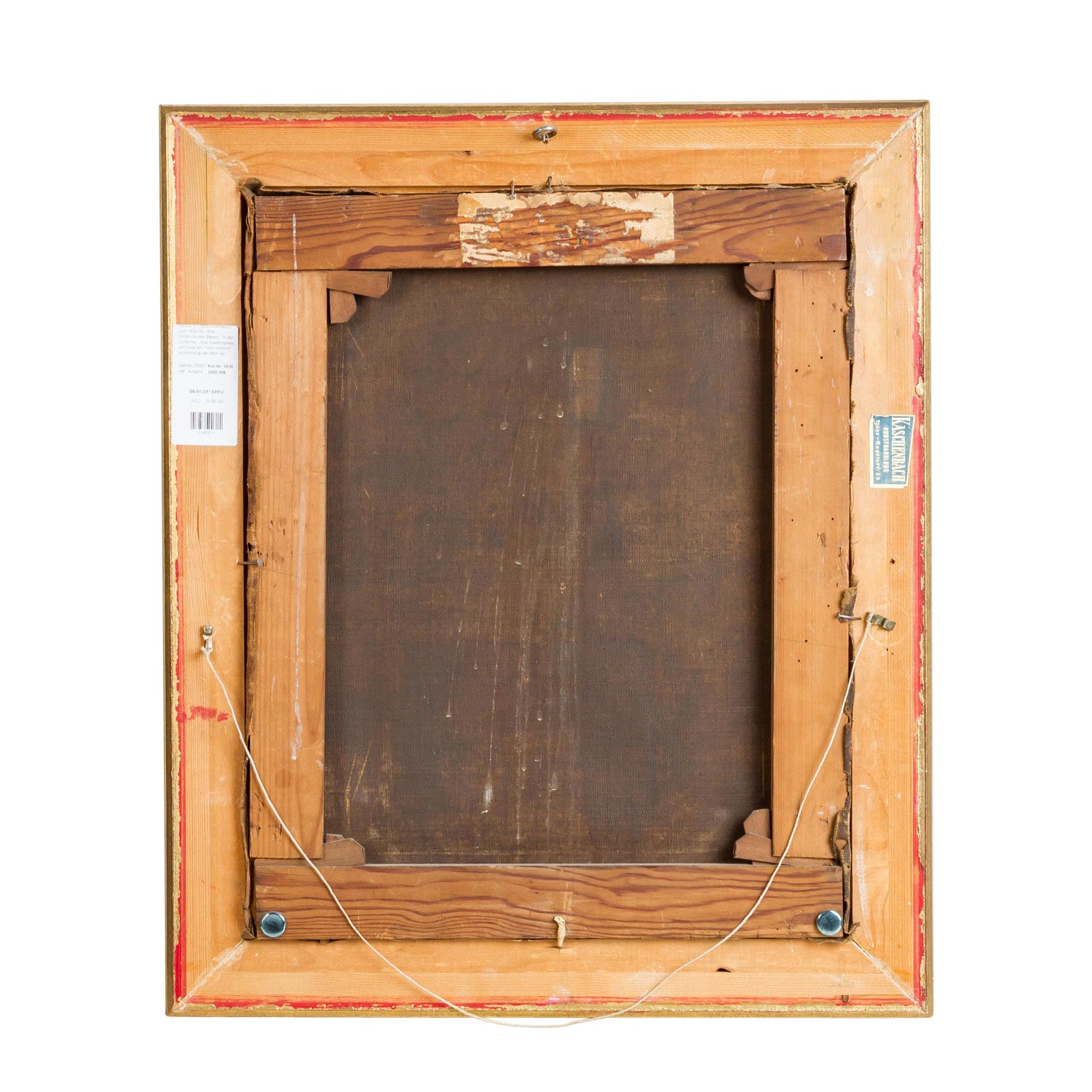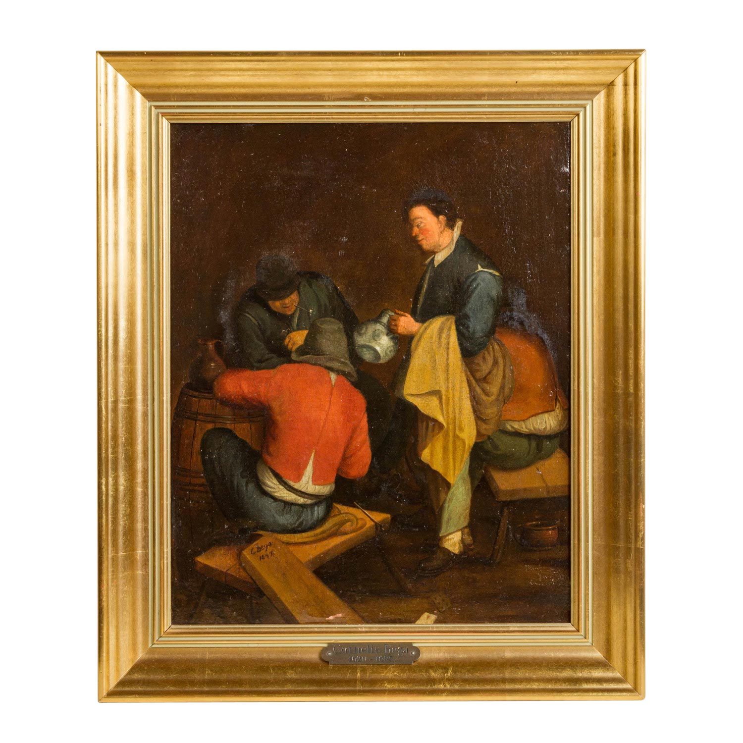 BEGA, C., probably CORNELIS (around 1620 / 32-1664, Dutch painter), 'In der Schenke', two card players using a barrel as a table, on the right the landlord with a beer mug, below left inscribed and dated 'c. bega 1657 ', oil / canvas relined, HxW: approx. 50x40 cm (62x52 cm with frame). Wear and scratch marks, restored and retouched. With frame, with plaque with artist's name.