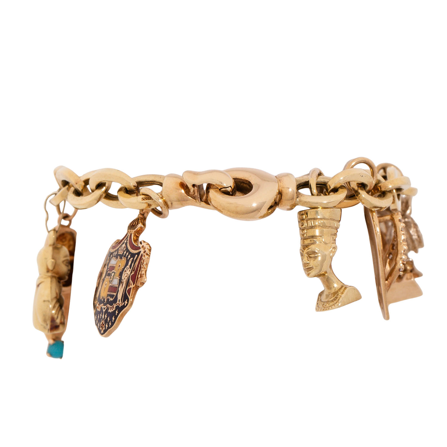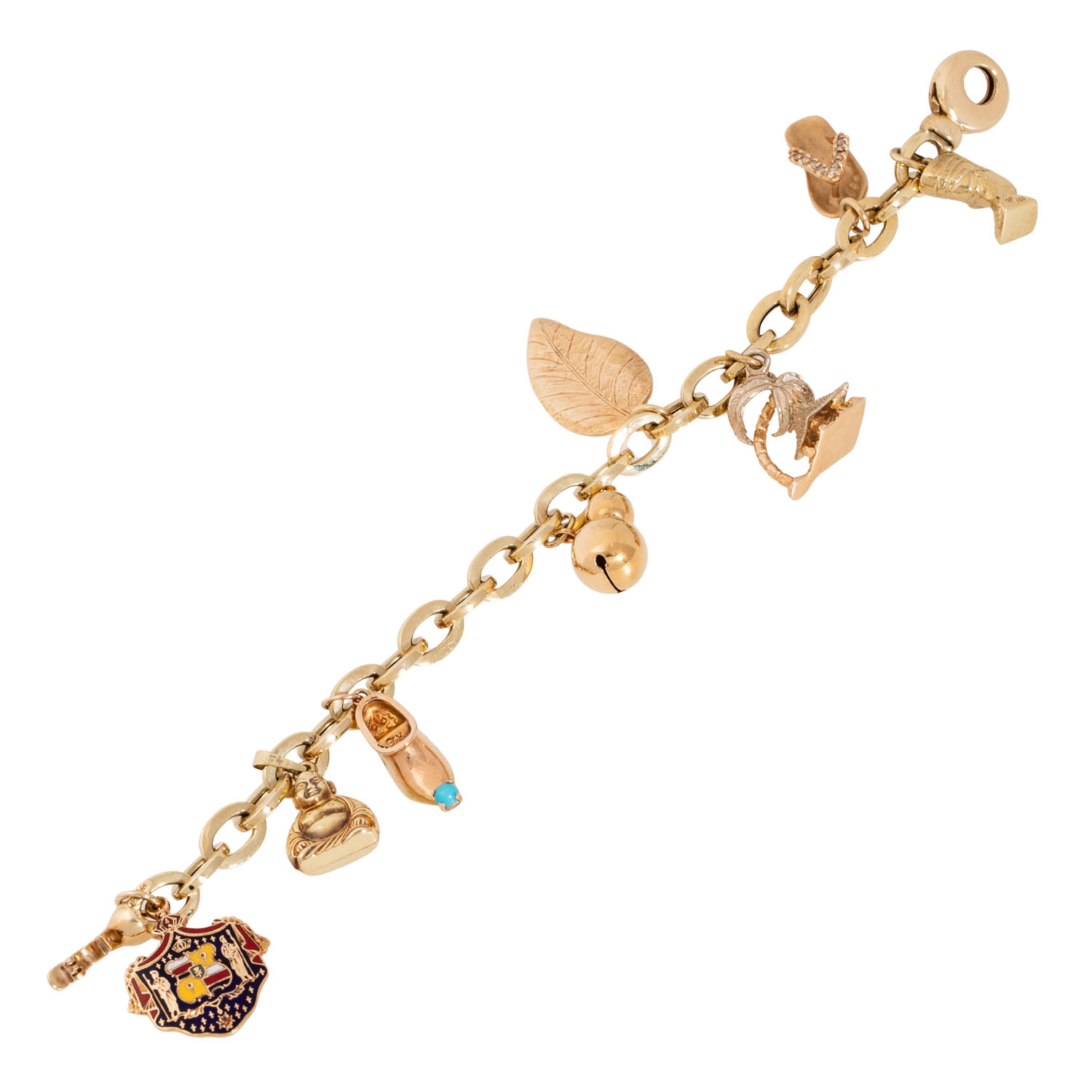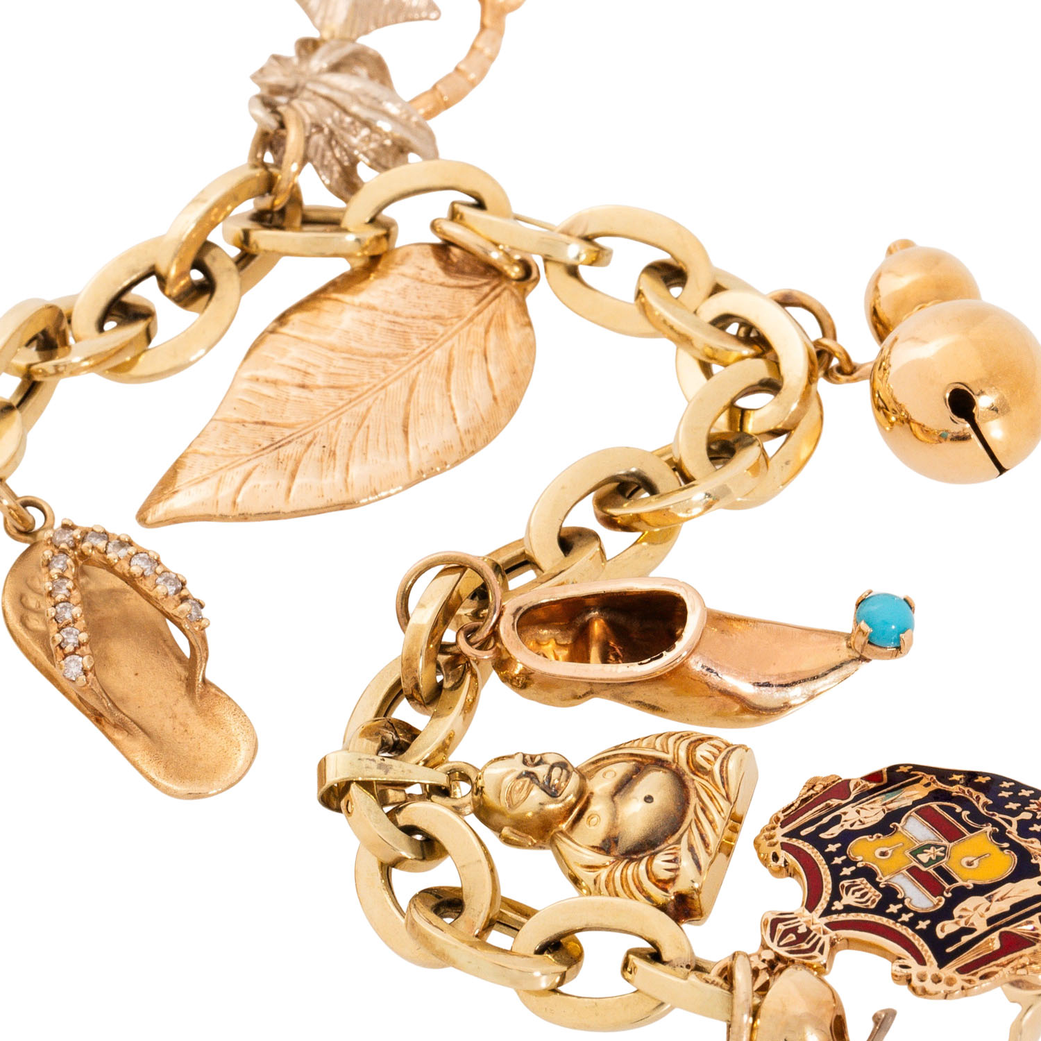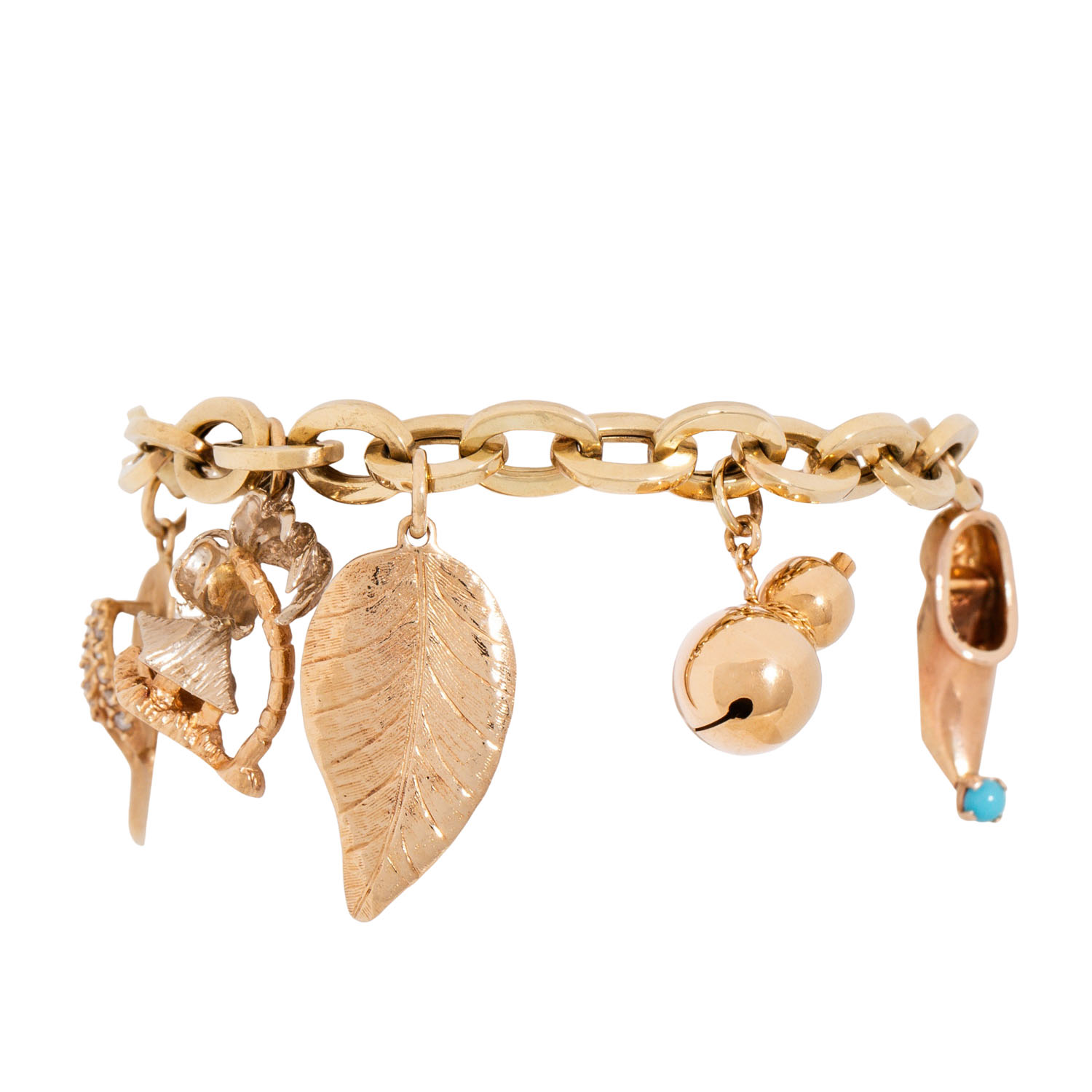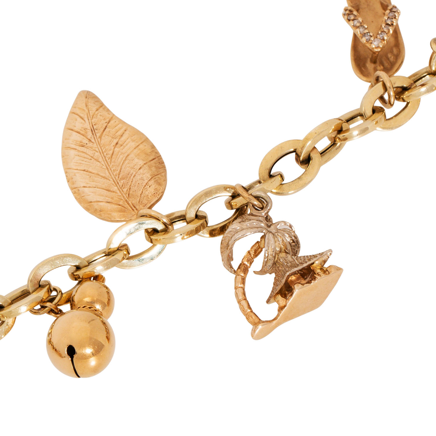 Charm bracelet, 14K yellow gold, with 8 charms (18K, 9K, six in 14K, yellow and white), 1 charm with 11 brilliant cut diamonds, totalling ap. 0.1 ct, totalling 31.9 g, L: 17 cm, carabiner clasp, late 20th century, minor signs of wear.