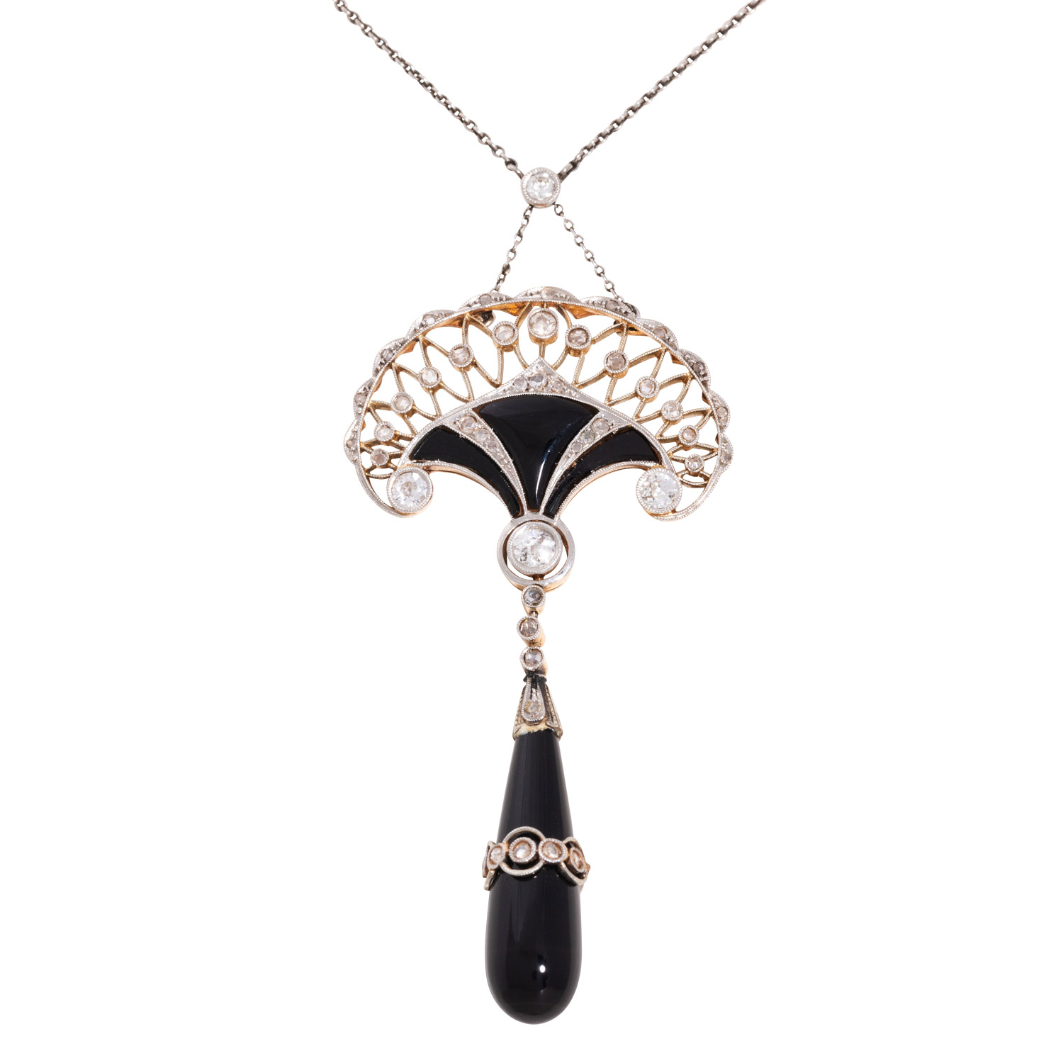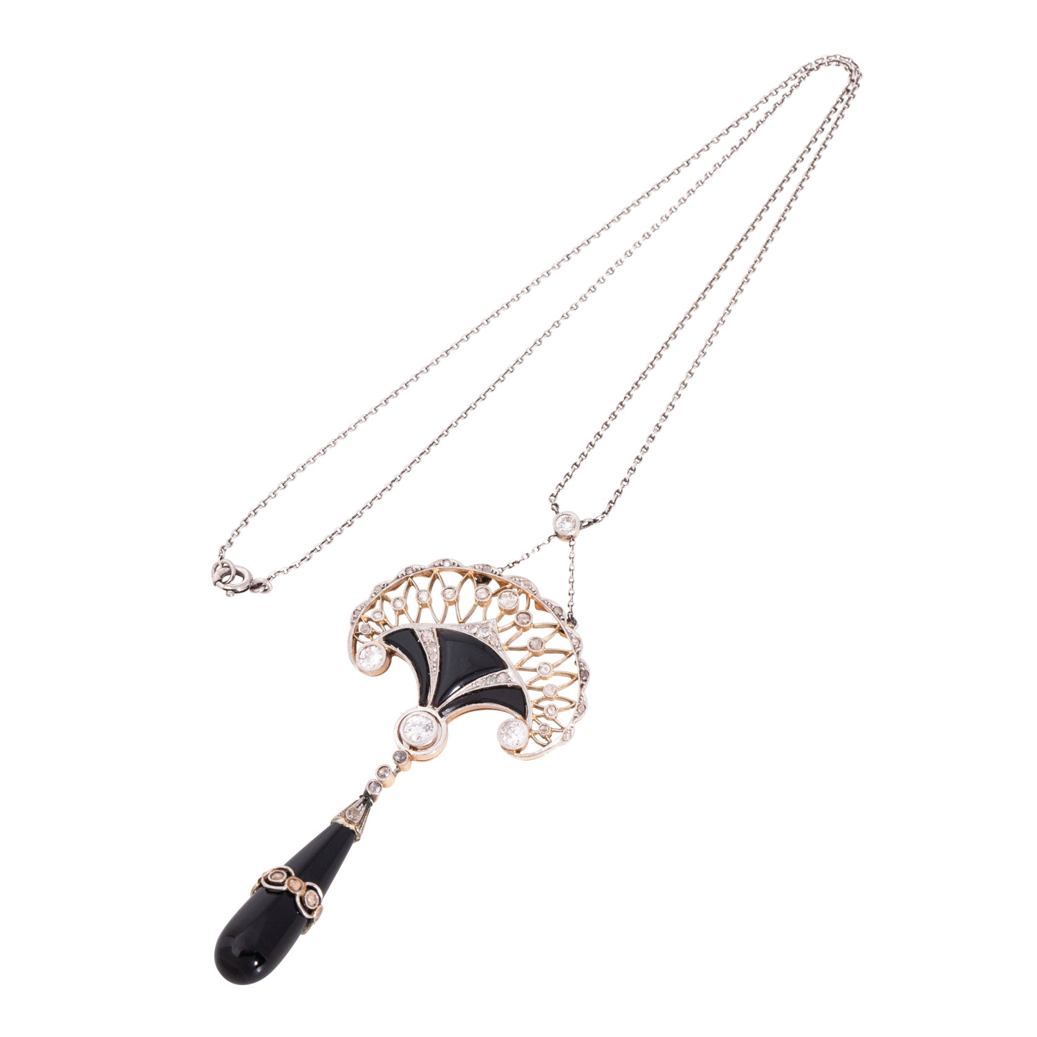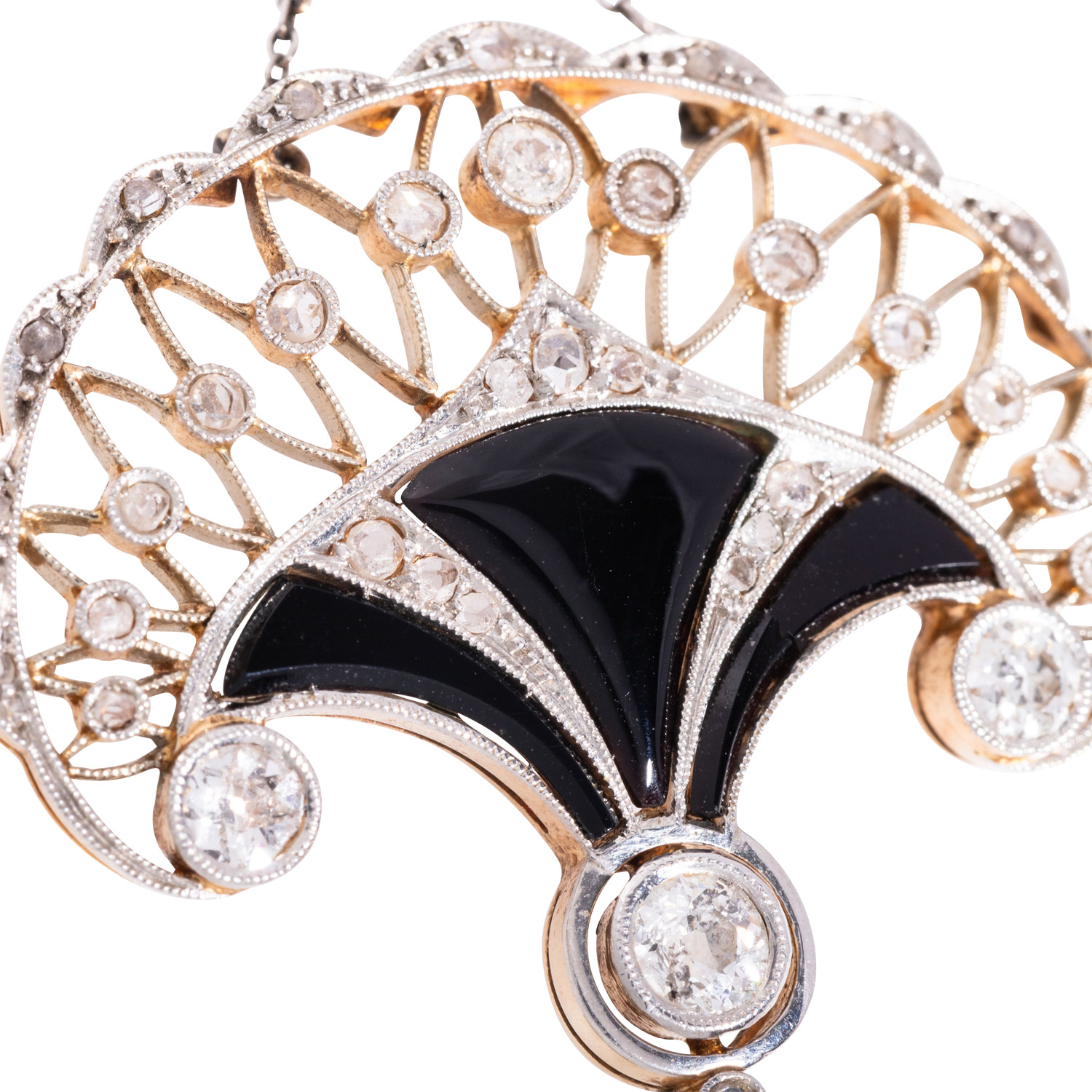 Belle Époque necklace set with old- and rose-cut diamonds totalling approx. 0.70 ct, medium to good colour, low to medium clarity, Onyx, 18K YG and platinum, 10,2 g, l.: 38 cm, ca. 1900, rose-cut diamonds partly chipped, 1 onyx cracked, application loose, very fine ajour and millegriffe.
