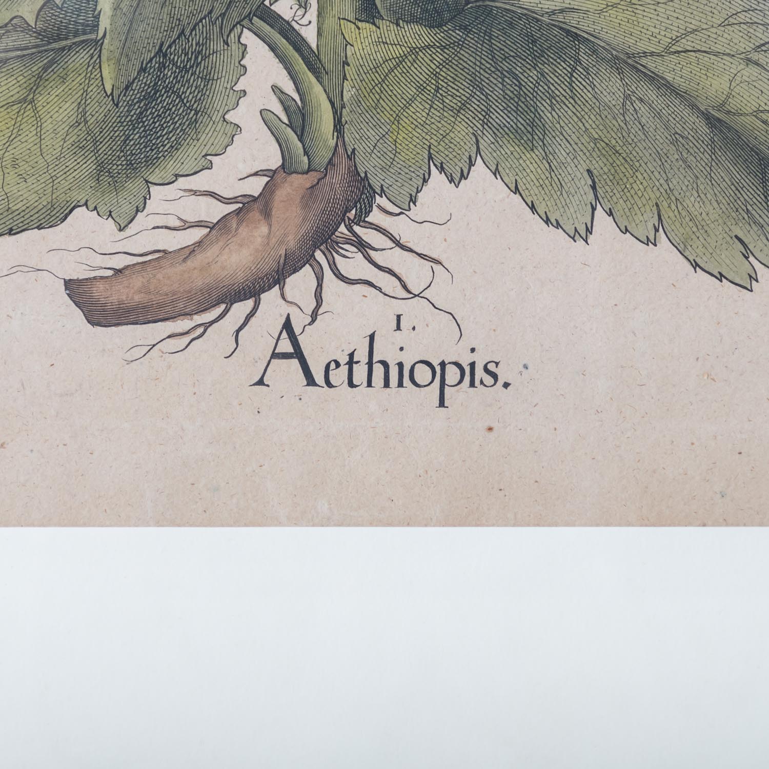 BESLER, BASILIUS, attr./nach (1561-1629), 'Aethiopis' from 'Hortus Eystettensis - Garden of Eichstätt', colored copper engraving / brown-toned paper, titled in the plate, text on the reverse, HxW: mat cutout approx. 51x40 cm, external dimensions Frame approx. 65x52 cm. Slight crease from pressure, curled and browned, stains. Framed behind glass in a passe-partout. Signs of age.