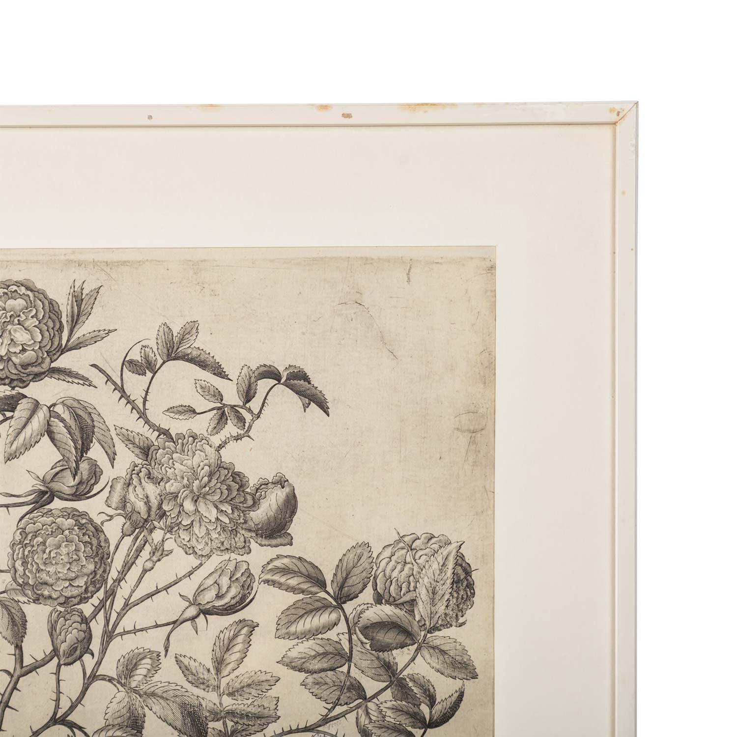 BESLER, BASILIUS, attr./nach (1561-1629), 'Rosa Damascena flore pleno' from 'Hortus Eystettensis - Garden of Eichstätt', Copper engraving / paper, titled in the plate, HxW: plate approx. 48x39.5 cm, passepartout cutout approx. 49x40 cm, external dimensions frame approx. 65x52 cm. Wavy and browned, slightly stained. Framed behind glass in a passe-partout. Signs of age.