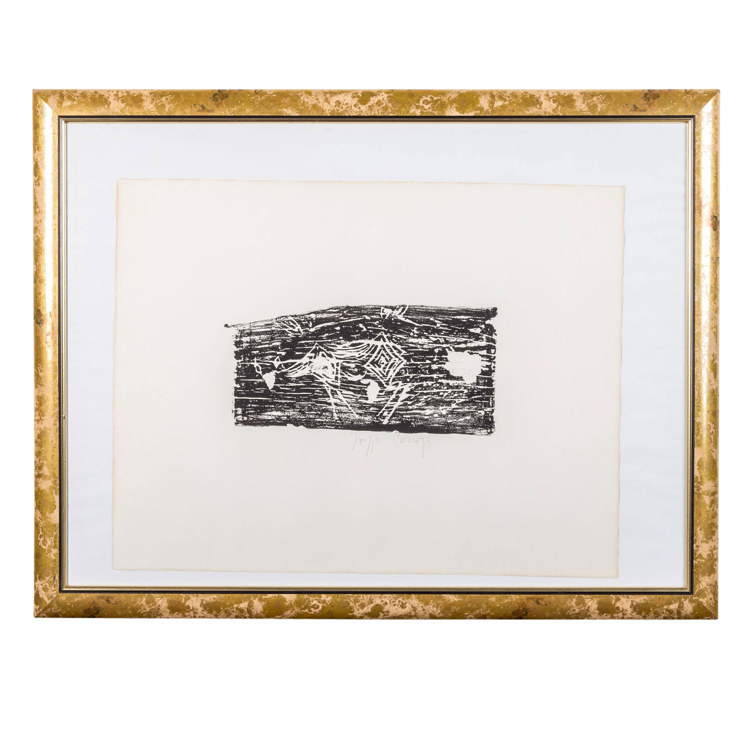 BEUYS, JOSEPH (1921-1986), 'Hirschkuh', linocut/BFK Rives (with watermark), signed by hand in pencil below, HxW: plate approx. 17x25 cm, sheet approx. 50x65 cm, outer frame dimensions approx. 68x88 cm. Signs of age, slightly browned and wavy, the left margin of the sheet markedly browned/lightstain, partially stained. With glazed frame (not mounted).