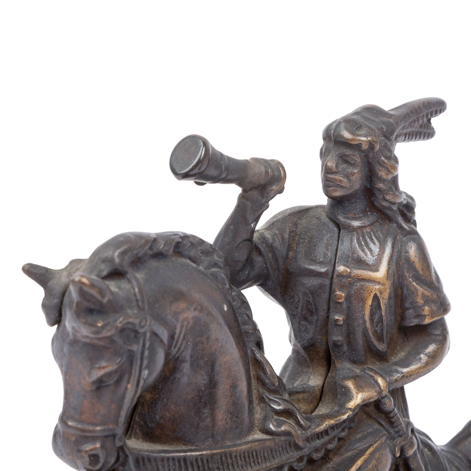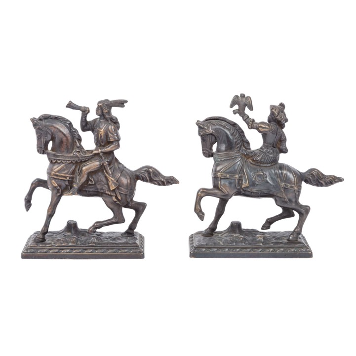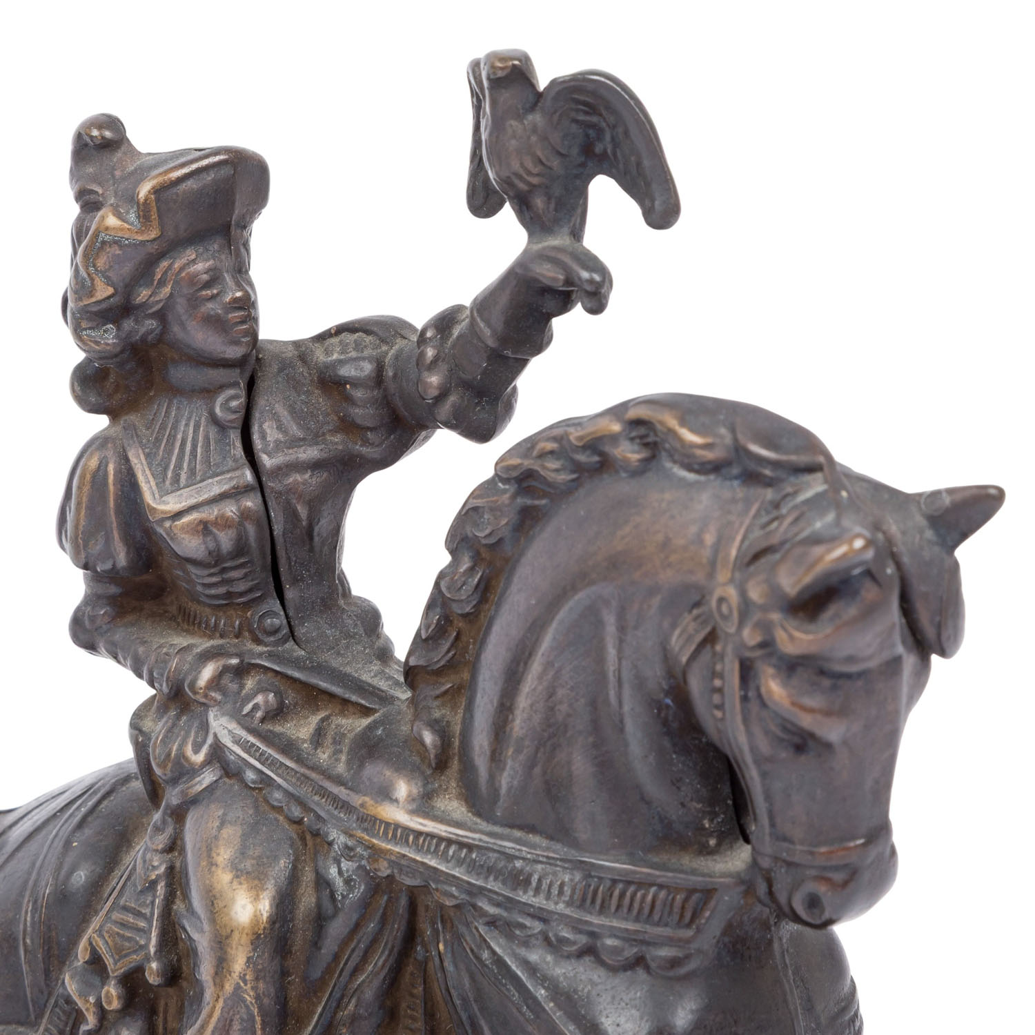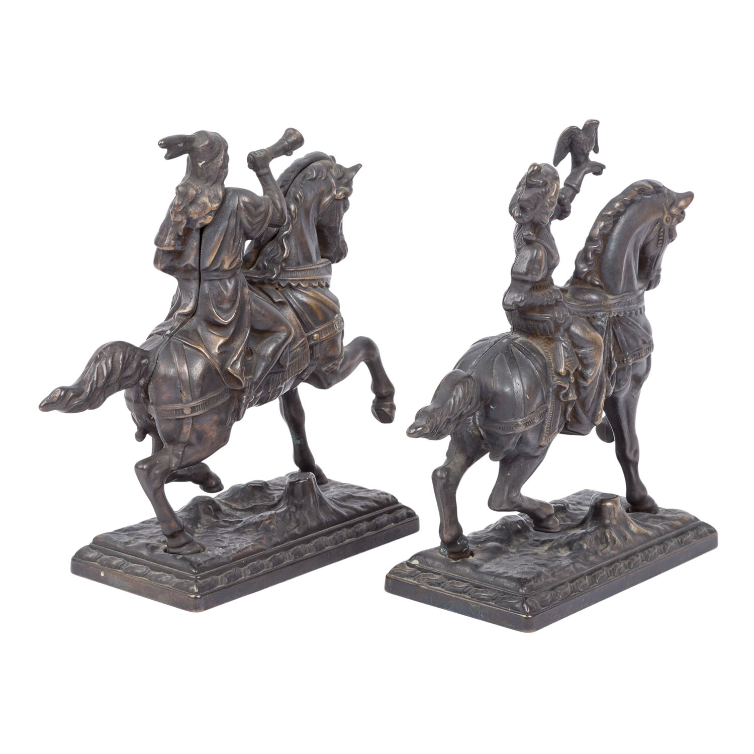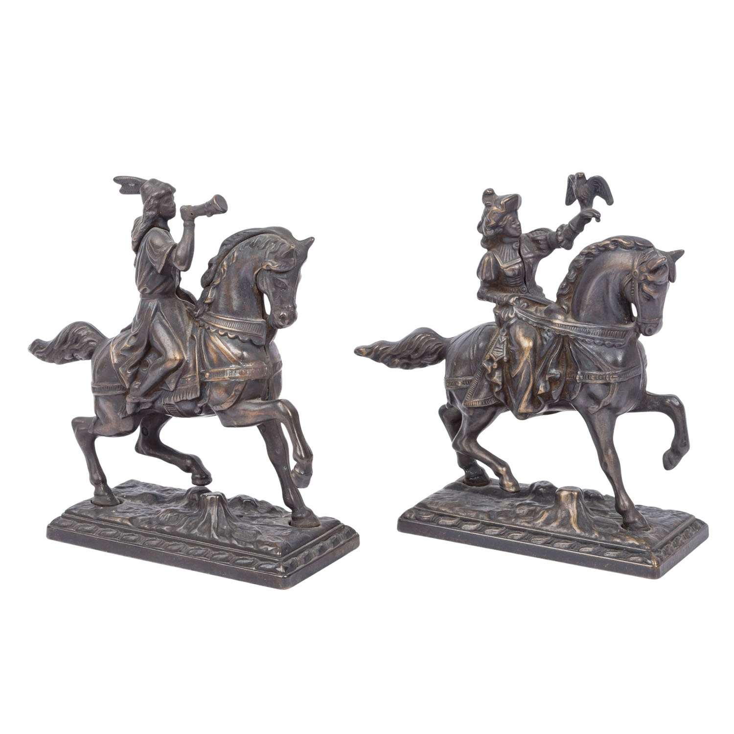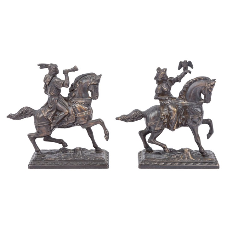 SCULPTOR 19th/20th century, pair of hunter figures ‘Hornblower’ & ‘Falconer’, historicism, cast metal, cast in several parts, patinated in bronze, fully sculpted, naturalistic figures in historical garb, H: approx. 18.5 cm and 19.5 cm, total weight approx. 2.1 kg, Signs of age.