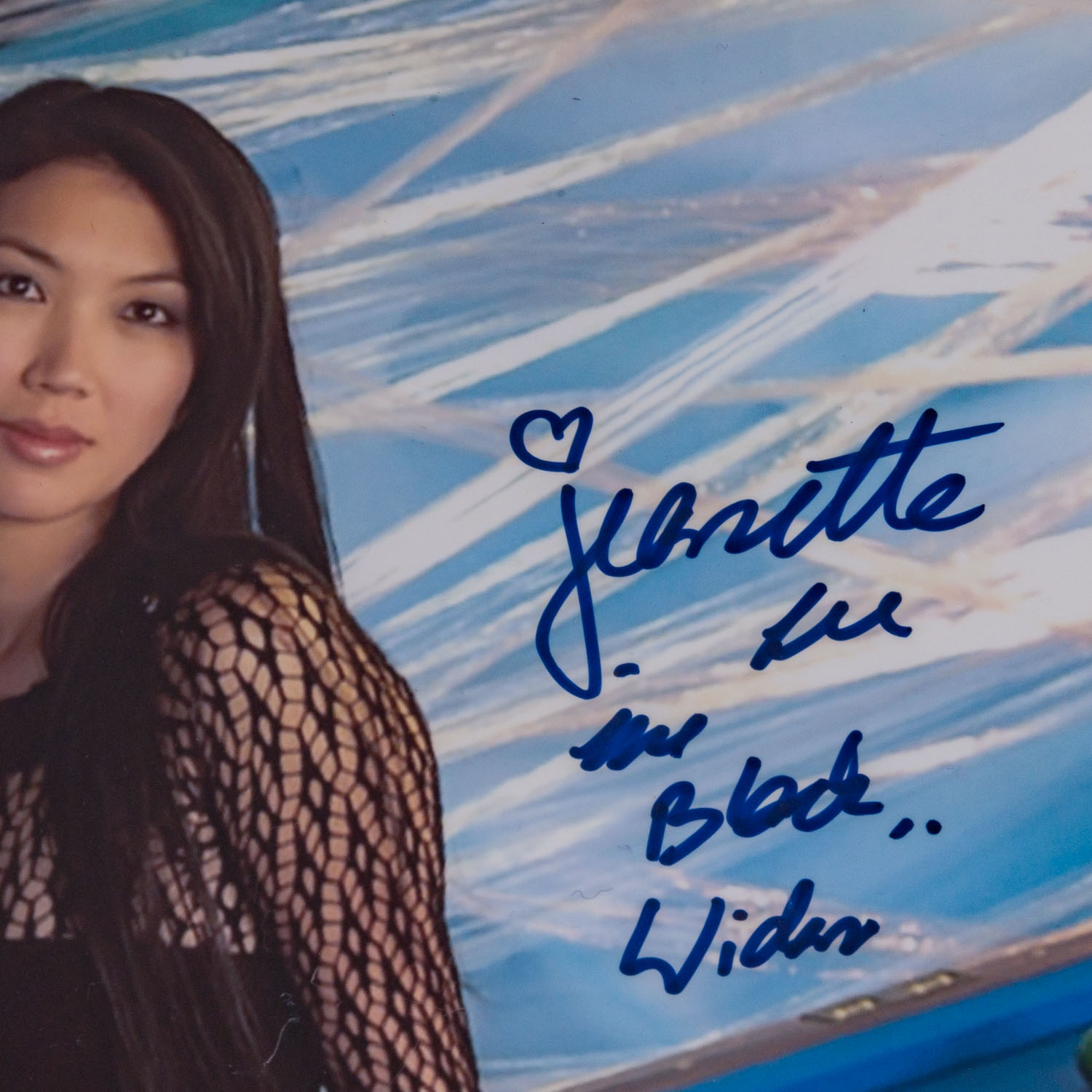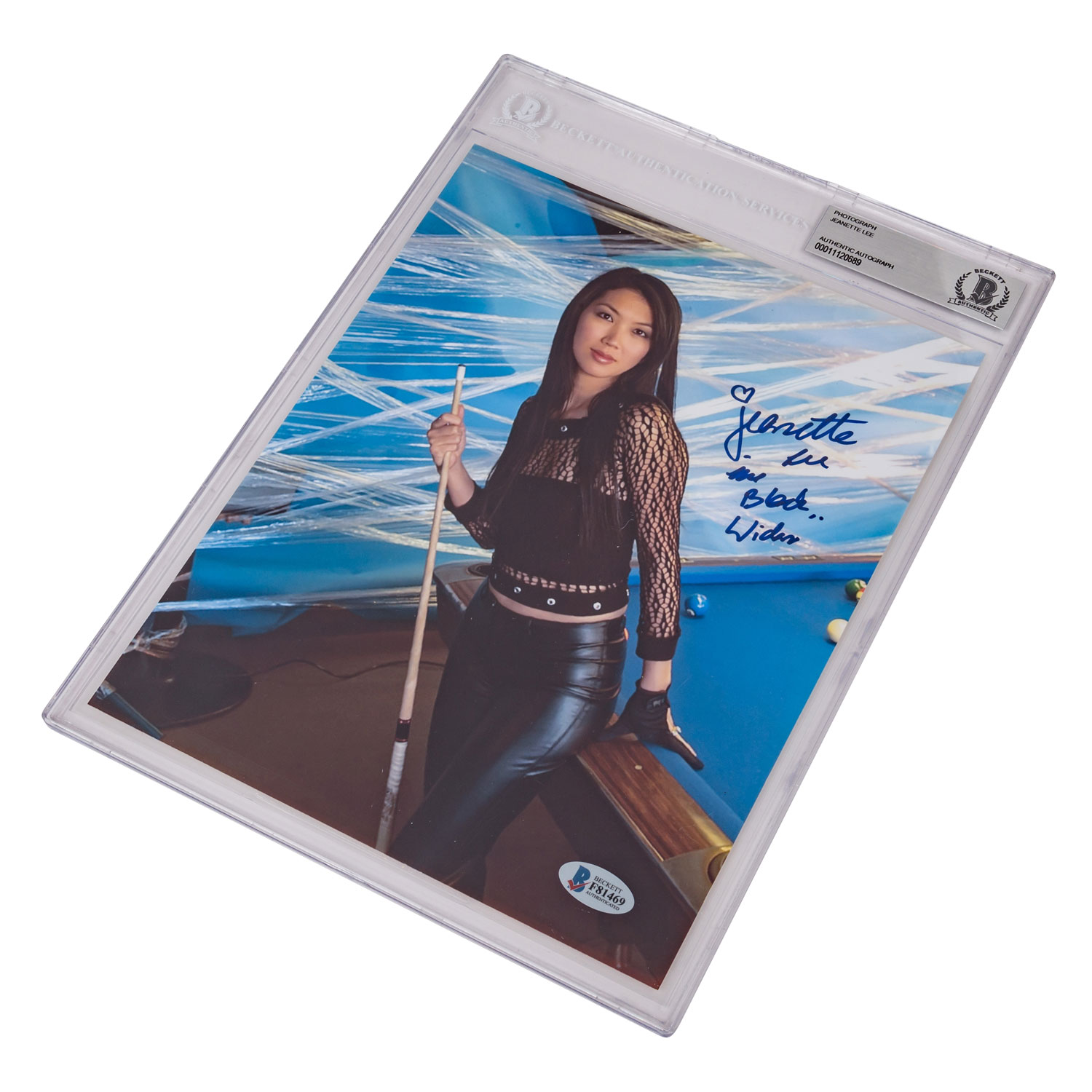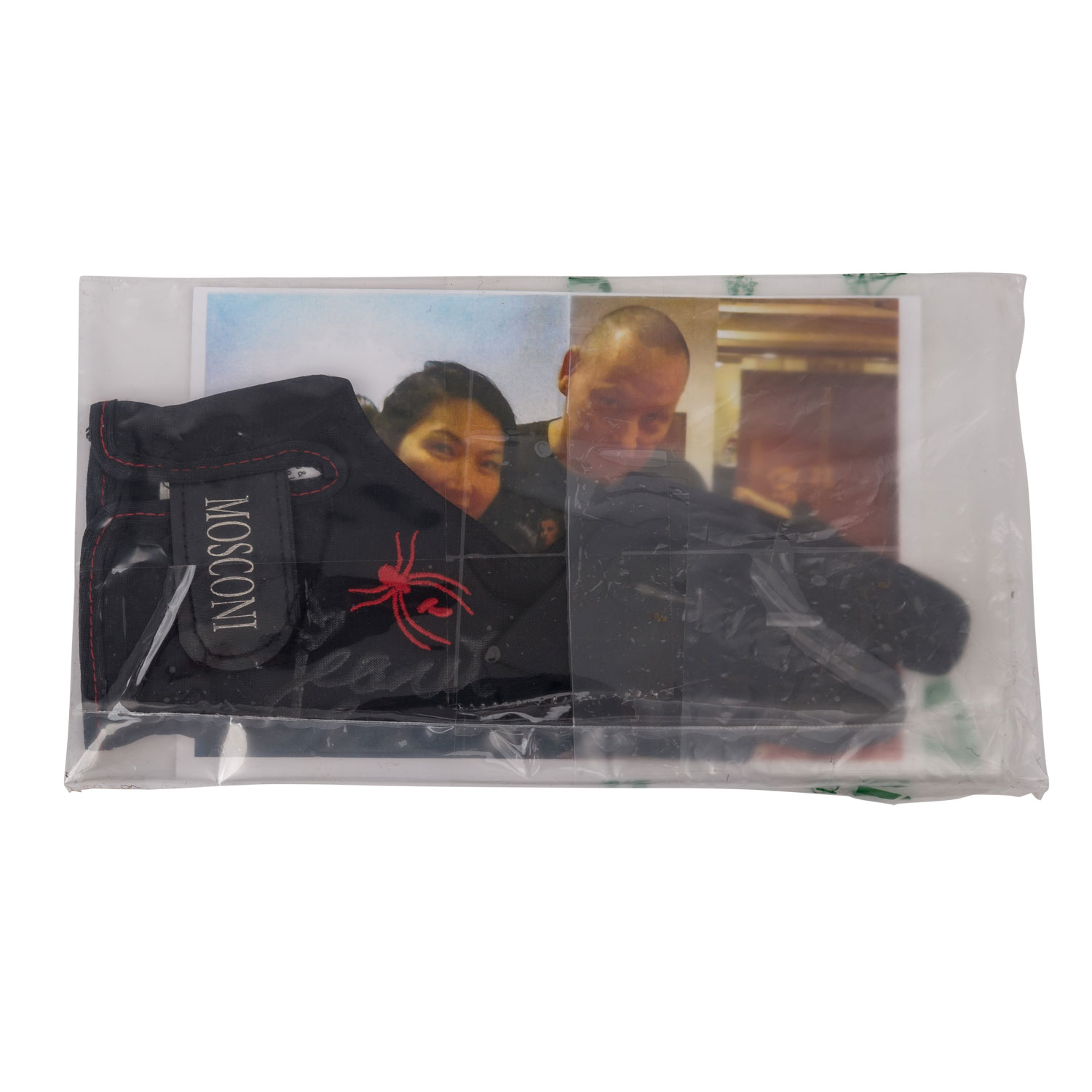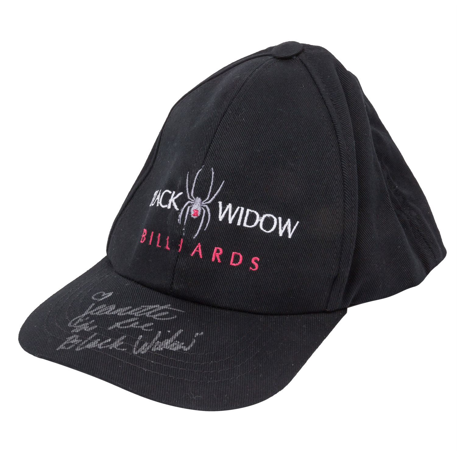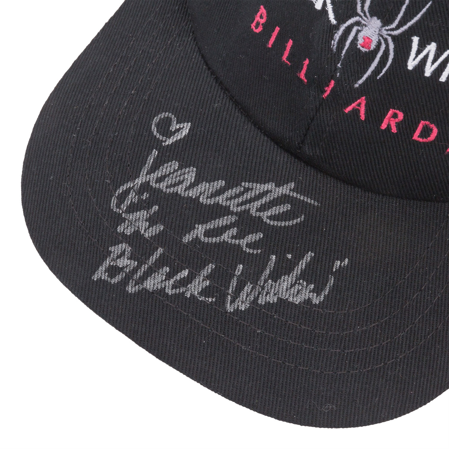 BILLARD - JEANETTE LEE “The Black Widow” set consisting of 2 x caps in black, with embroidered inscription 'Black Widow Billiards' in white/red and white/pink, each signed by the billiard player. 1 x billiard glove in black with red embroidery, autographed. 1 x autograph card, signed, framed in acrylic cassette, with BECKETT certificate and hologram. each with traces of age and storage.