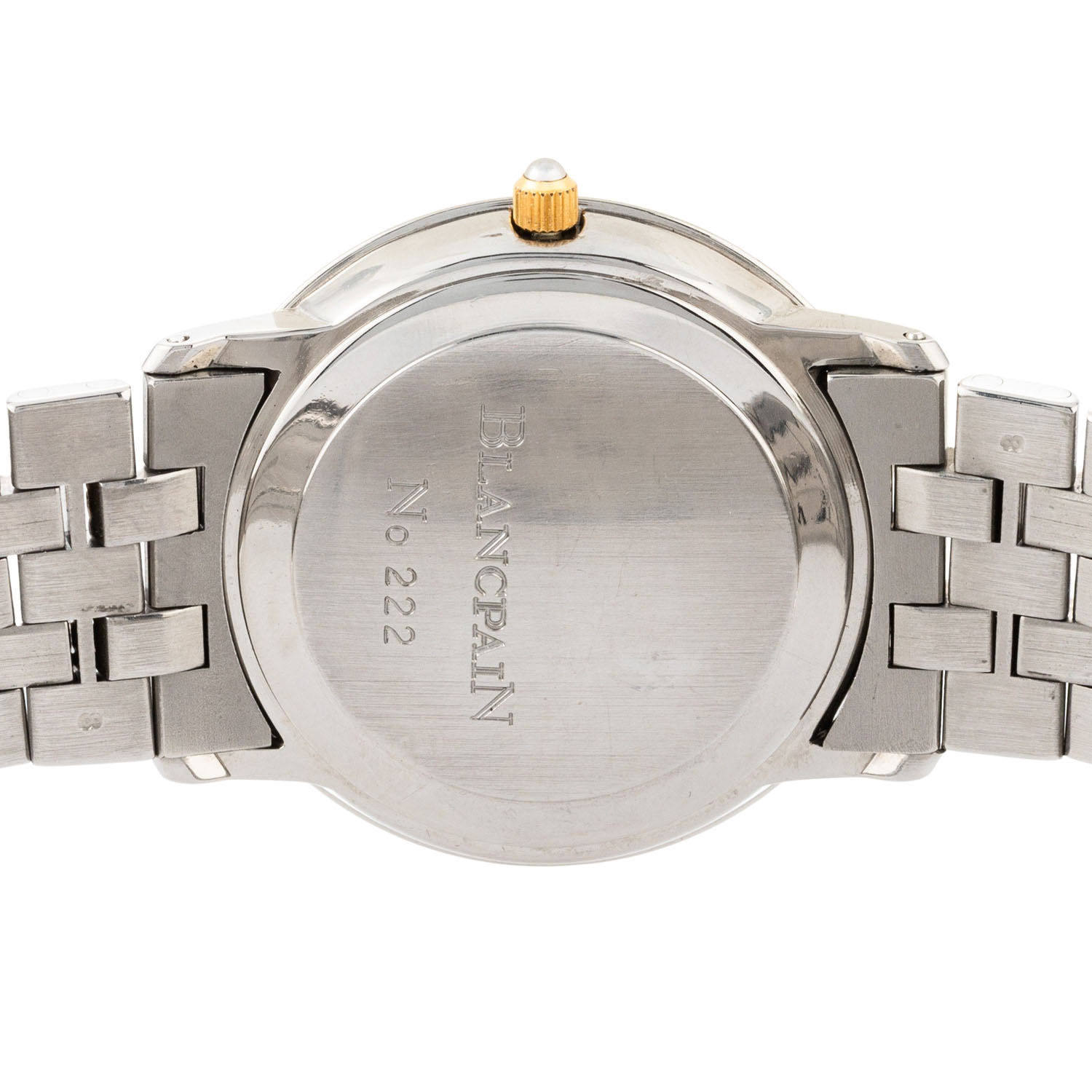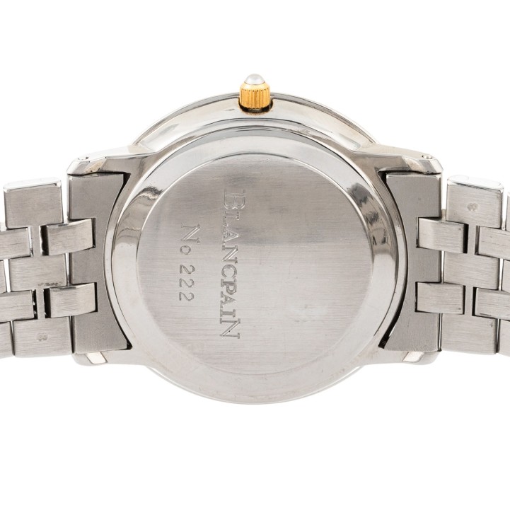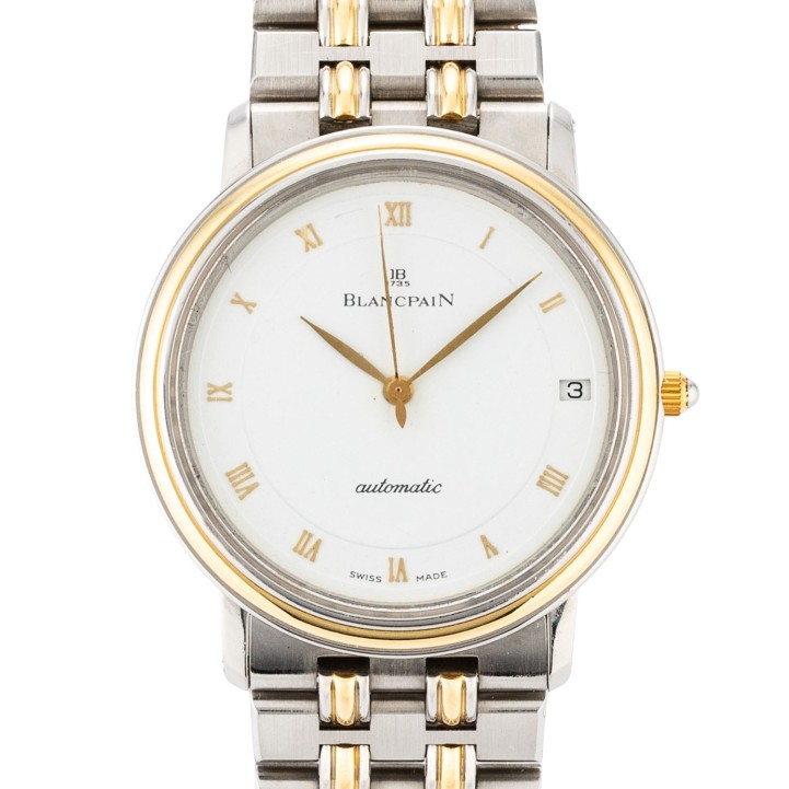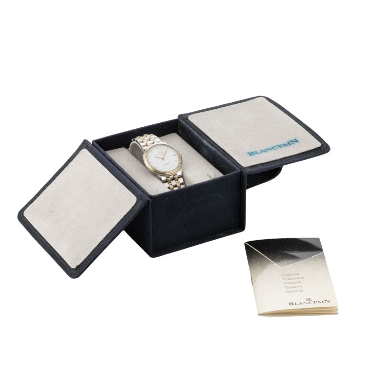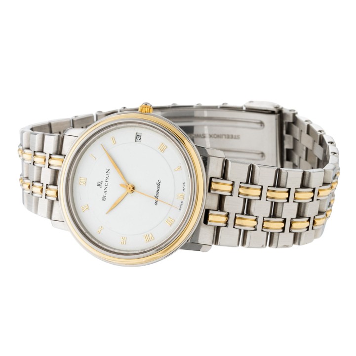 BLANCPAIN Villeret Ref 0095-1318-25 men's watch from 1987. Box and papers. Stainless steel/yellow gold 18K. Serial number 222. Automatic movement caliber 95 with good performance (+7 s/d, 252° amplitude). White dial with applied Roman indices and date display. Blancpain/Gay Freres stainless steel/yellow gold bracelet (with stretch) with folding clasp. Good condition with signs of wear. Blancpain box and warranty booklet included. The watch was purchased in 1987 from jeweler Rüschenbeck in Duisburg. Diameter approx. 34 mm (measured without crown). Suitable for wrist sizes up to approx. 18.5 cm.