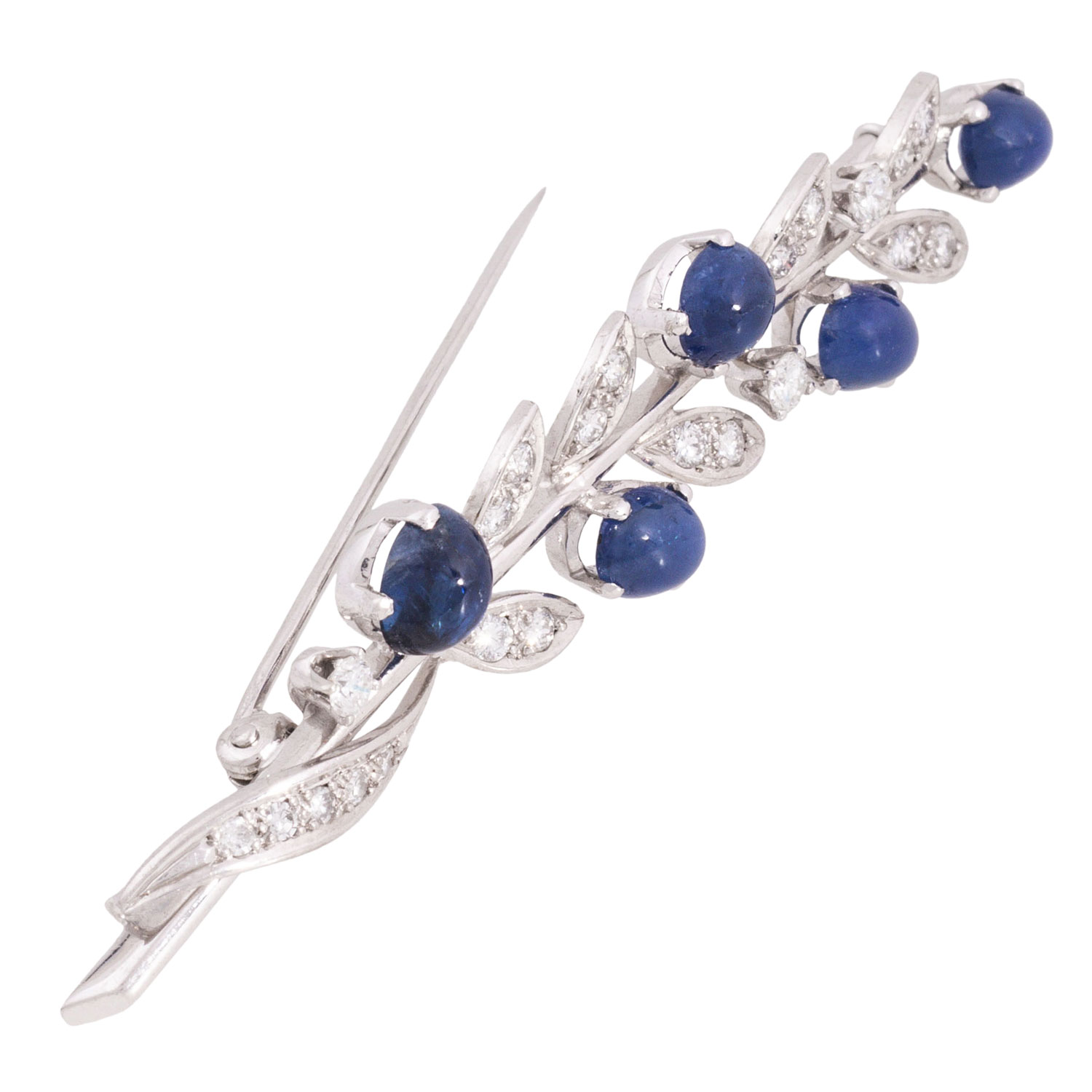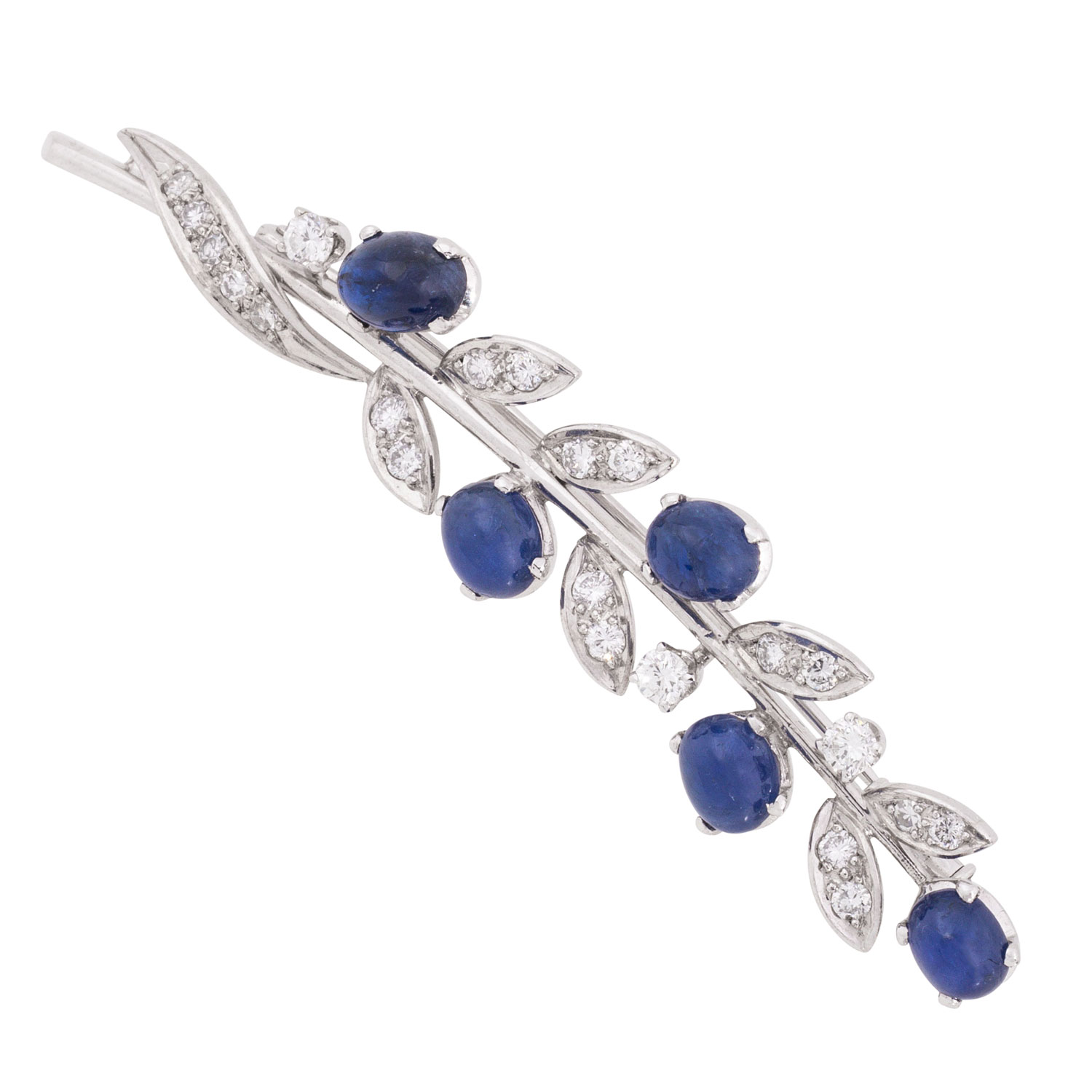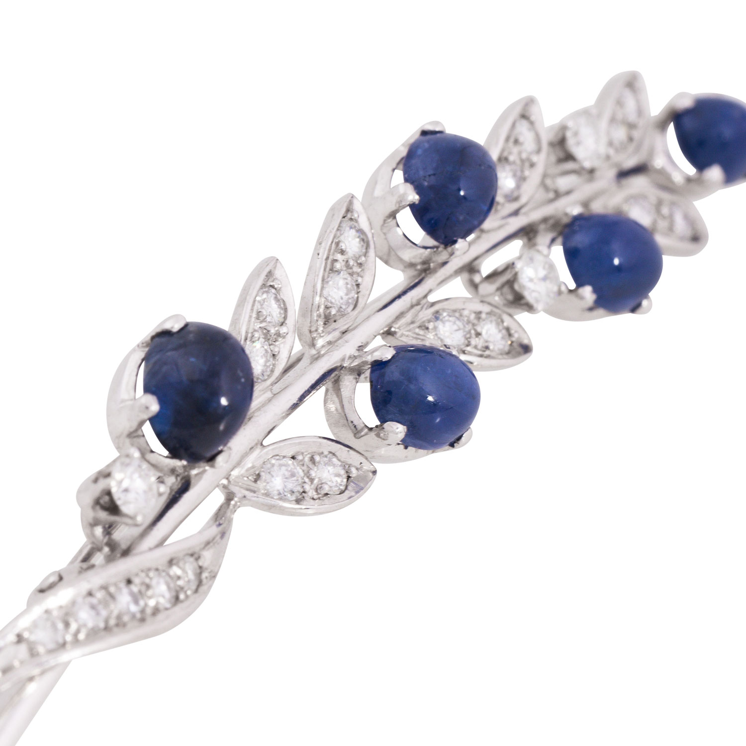 Brooch ' Flowerbranch' with 5 sapphire cabochons, ap. 6 x 5 mm, 17 brilliant and 5 single cut diamonds, totalling ap. 0.74 ct, WHITE-STW(H-I)/VS, 18K white gold, 7.7 g, L x W: 67 x 12 mm, sapphires partly with surface characteristics.