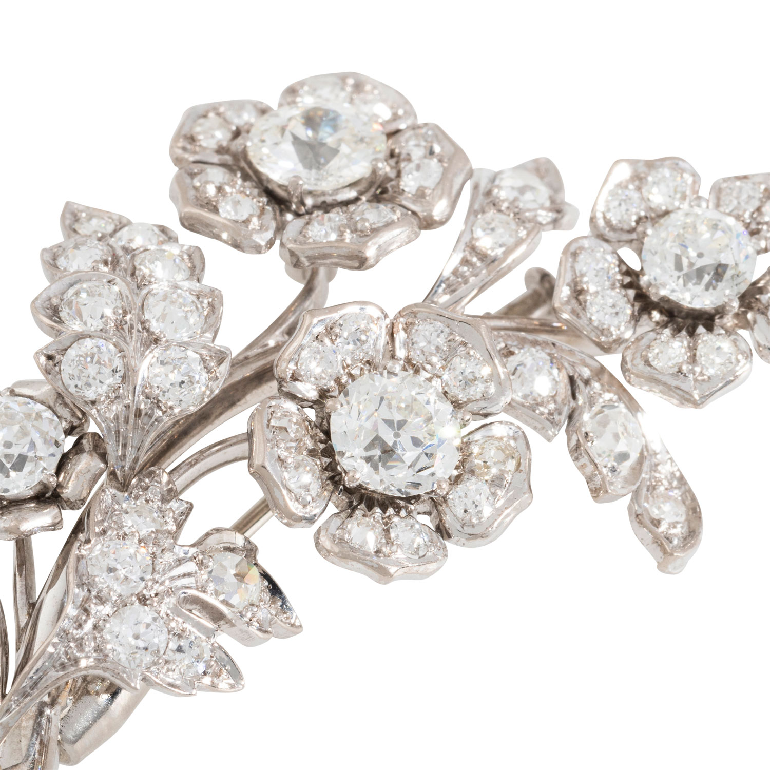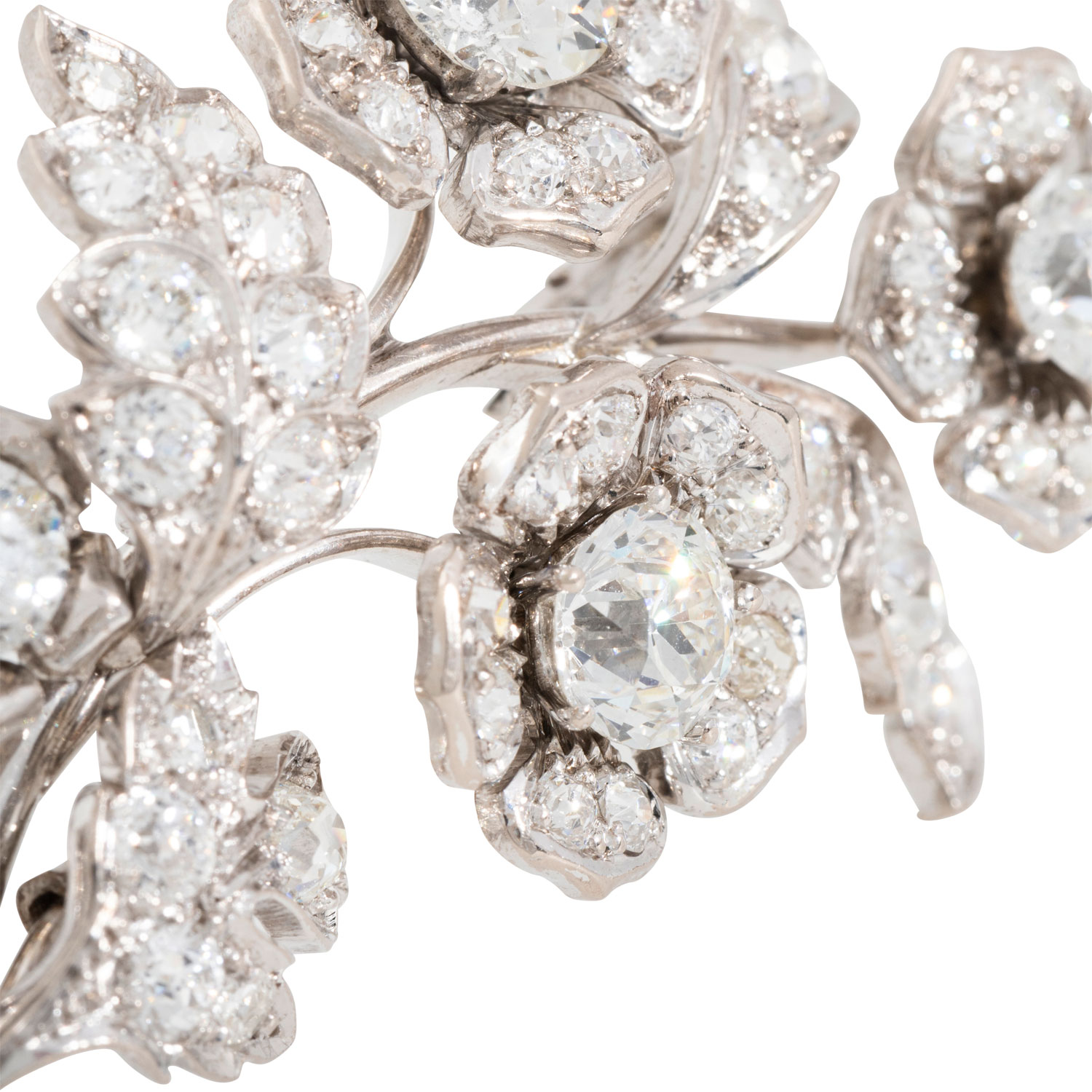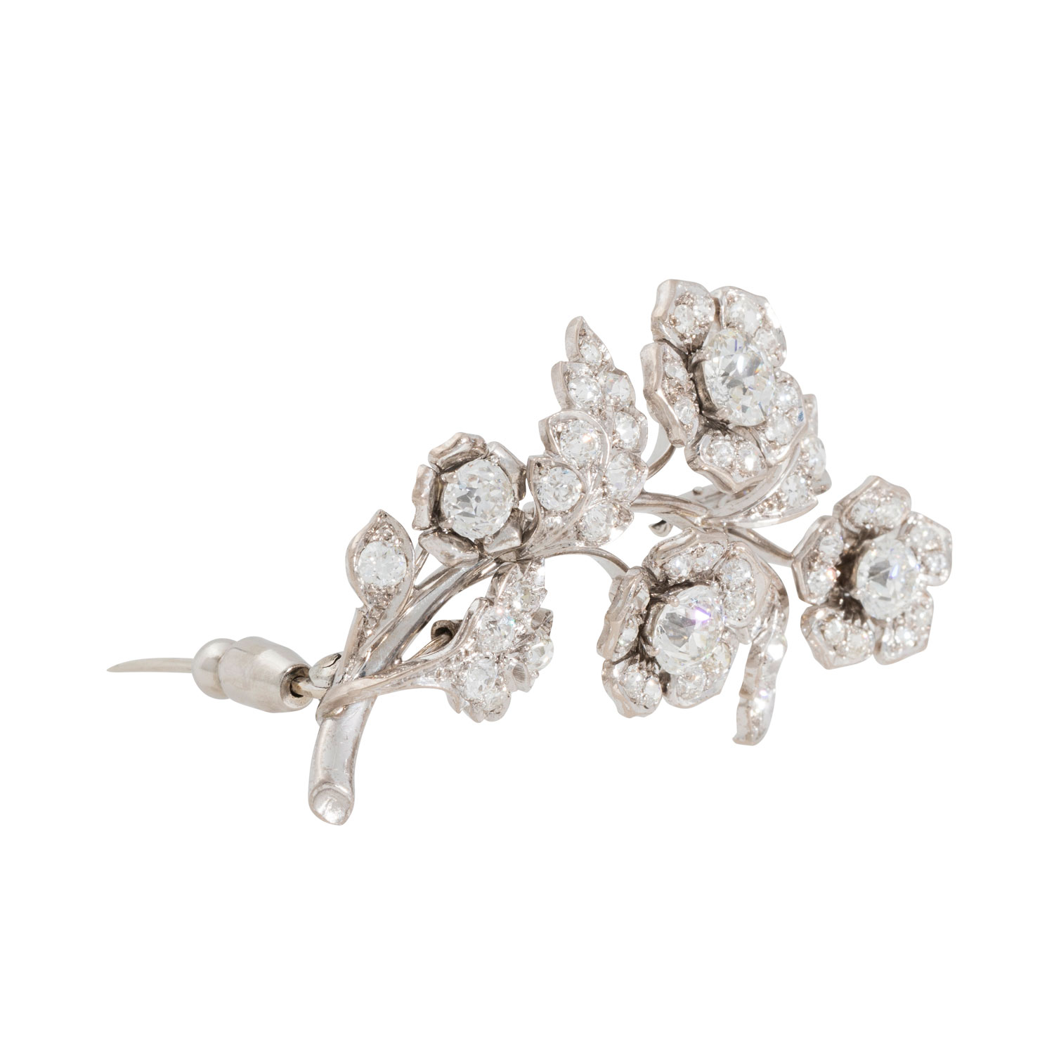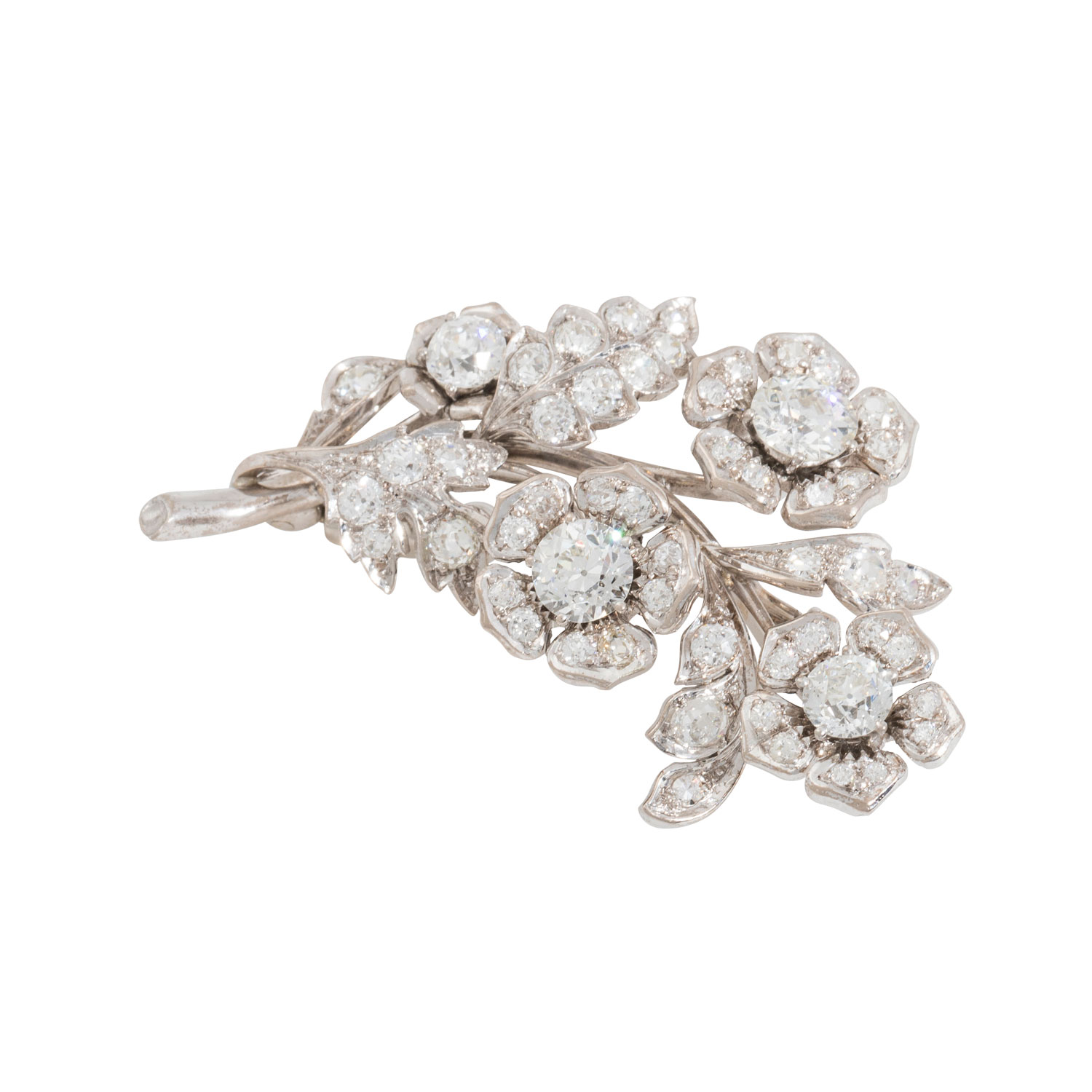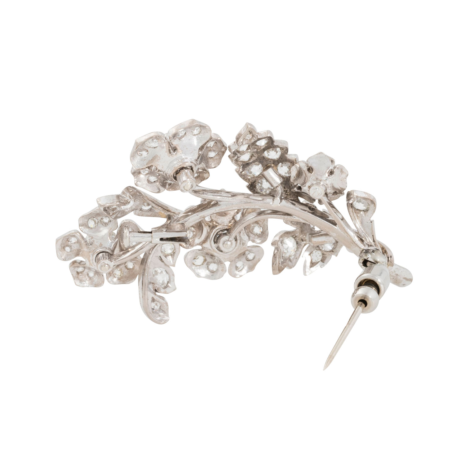 Brooch 'Flower Branch' with old-european-cut diamonds: 4 pc ca. 0.5+0.7+0.9+0.4 ct, ca. WHITE-STW (H-I)/SI, further diamonds totalling ca. 3 ct, medium to good colour a. clarity, 18K WG, 16.3 gr, L: ca. 5 cm, 2nd half 20th century, minor signs of wear.