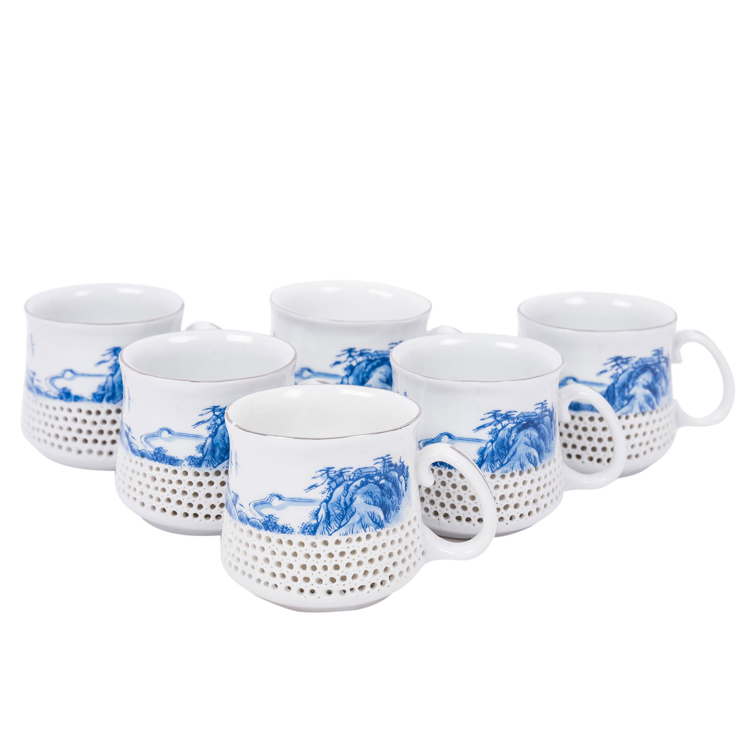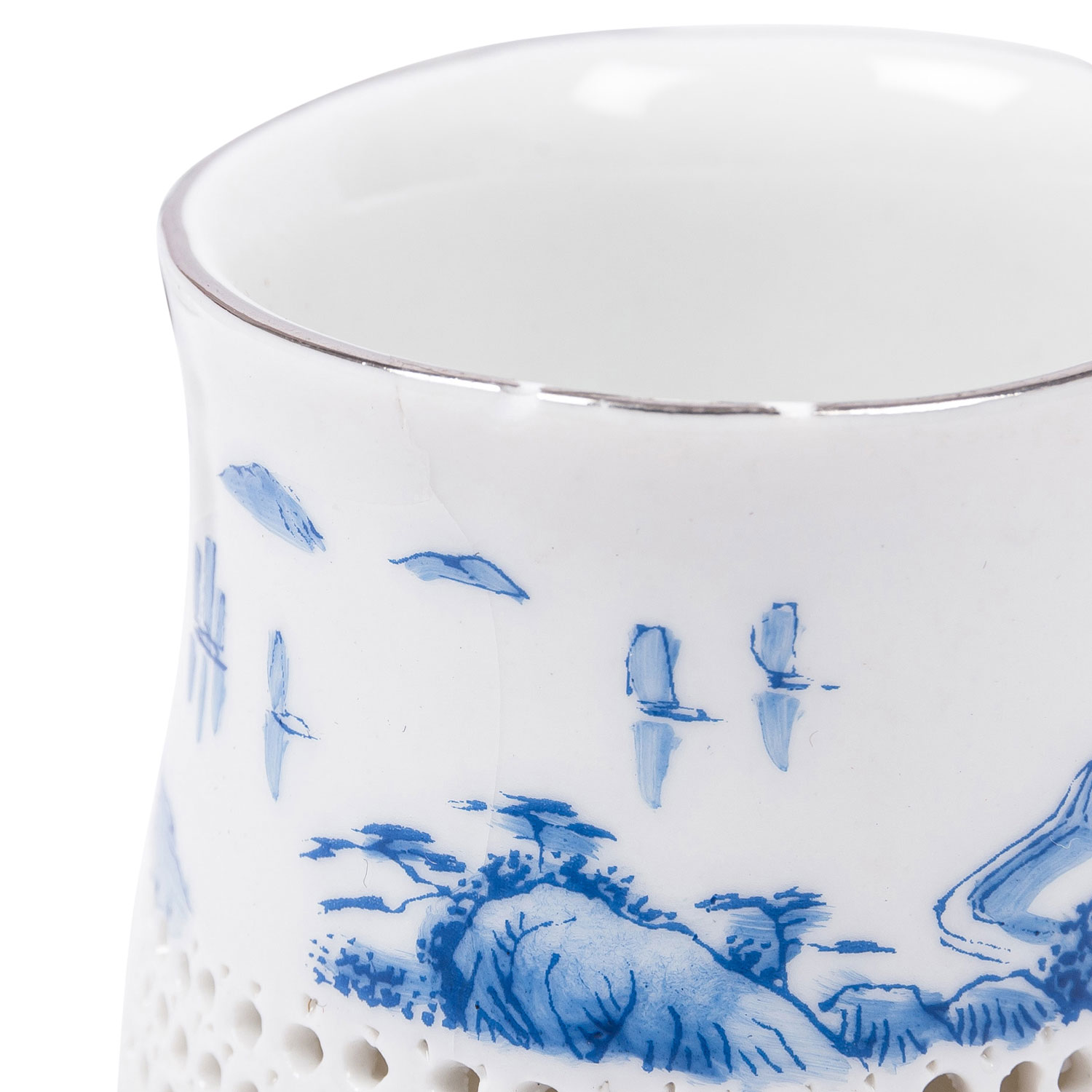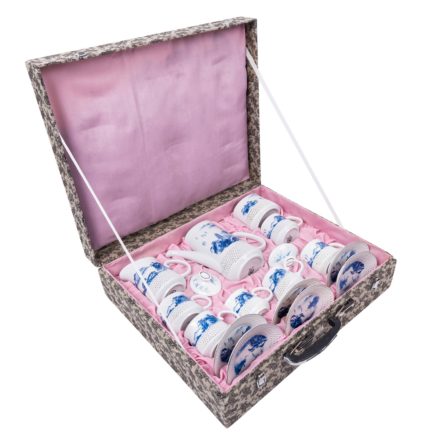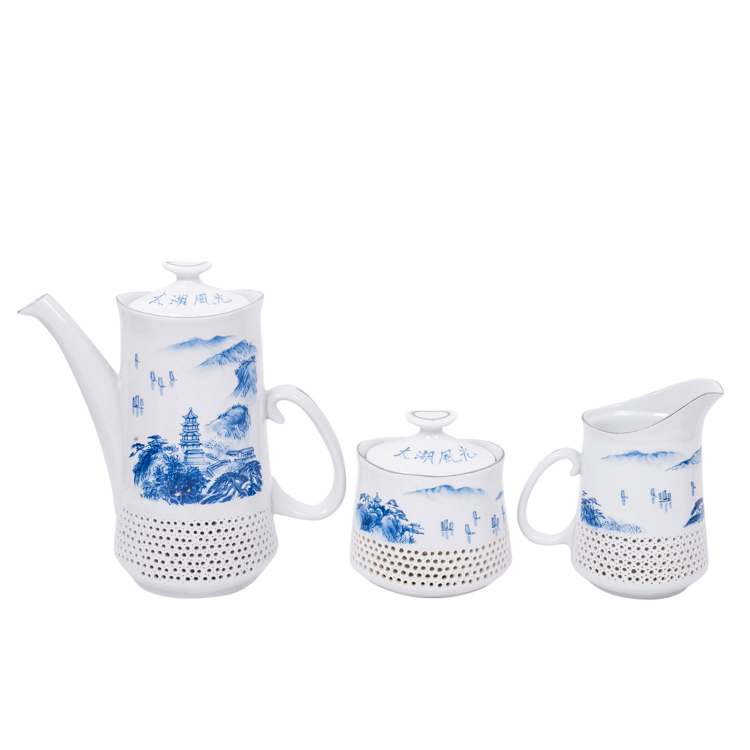 Blue and white coffee service for 6 persons, SOUTH EAST ASIA. Partly with openwork rim. Consisting of: 6 cups, 6 oval saucers, 1 coffee pot, 1 sugar bowl, 1 milk jug. With matching storage case. Purchased in SINGAPORE in the 1980s.