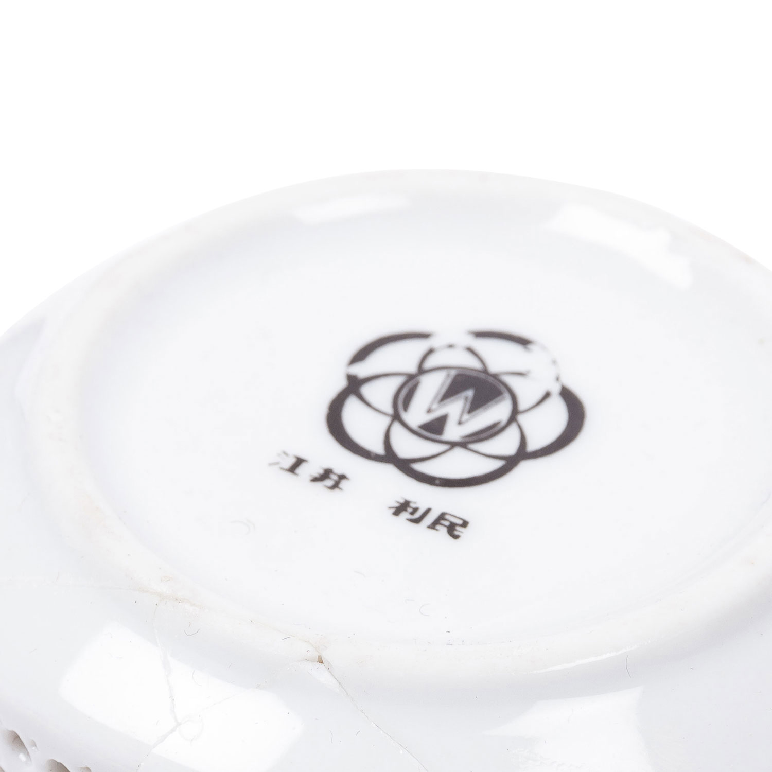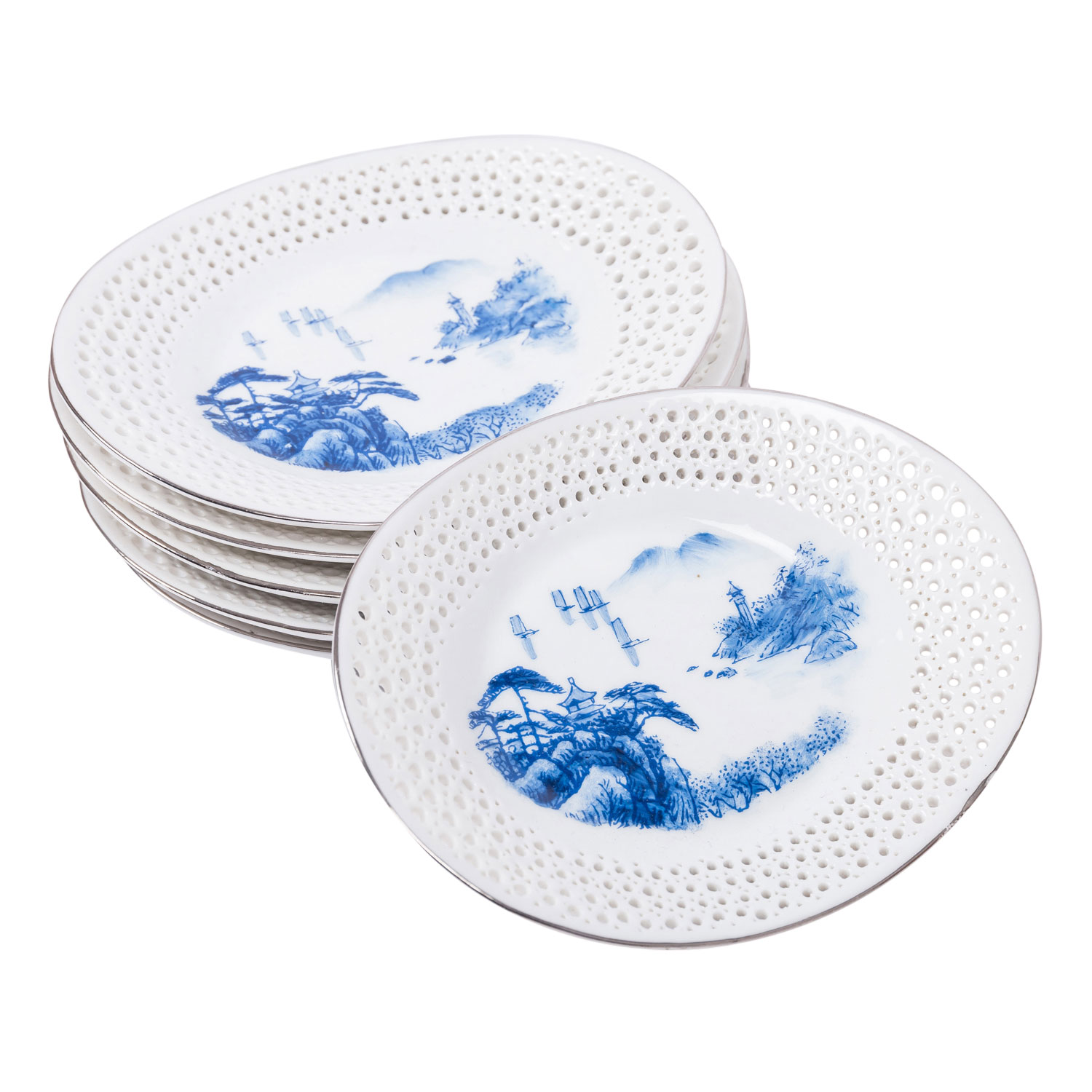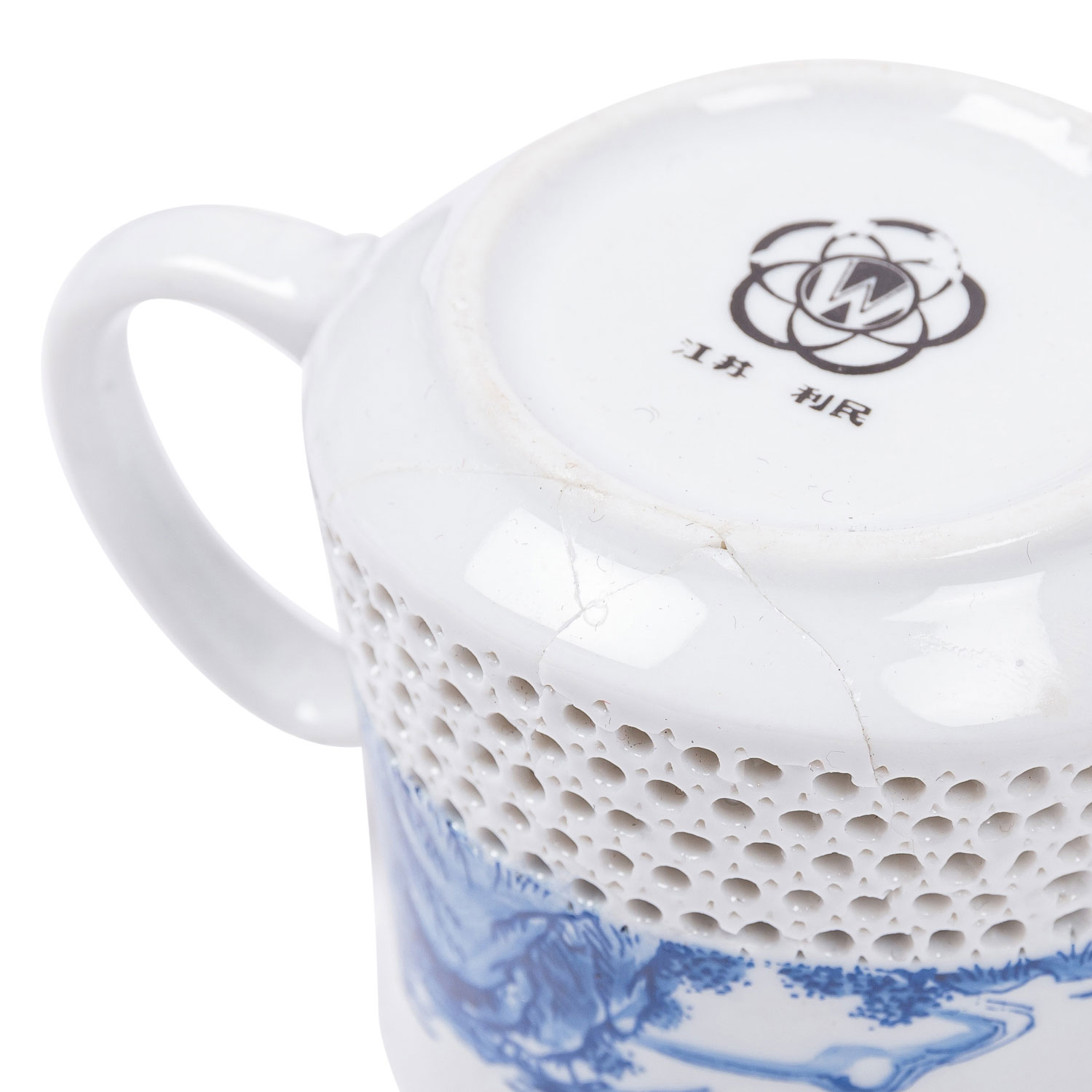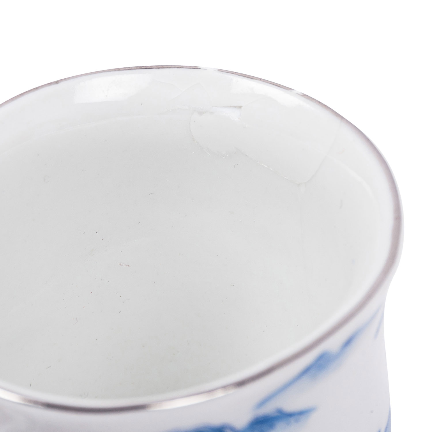 Blue and white coffee service for 6 persons, SOUTH EAST ASIA. Partly with openwork rim. Consisting of: 6 cups, 6 oval saucers, 1 coffee pot, 1 sugar bowl, 1 milk jug. With matching storage case. Purchased in SINGAPORE in the 1980s.