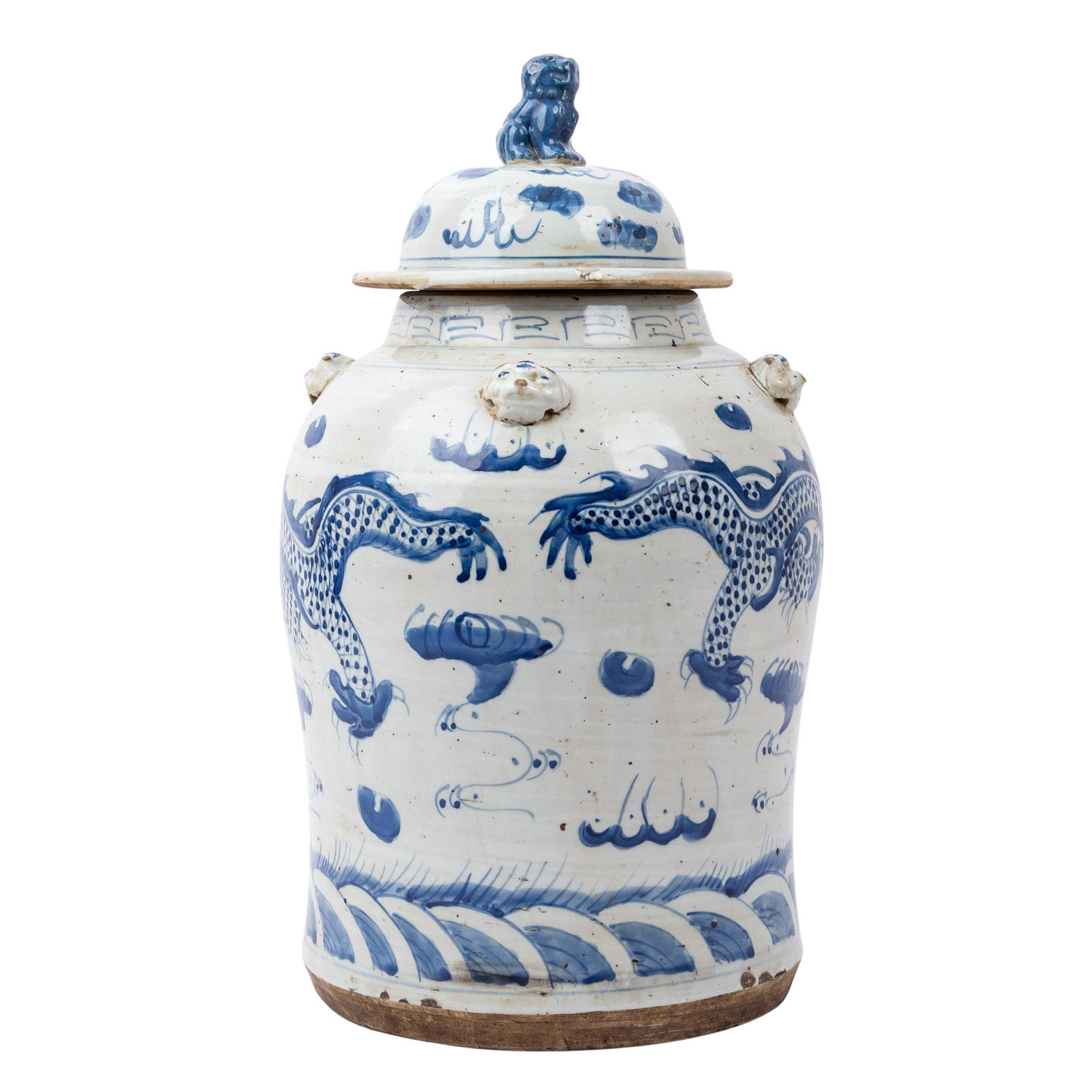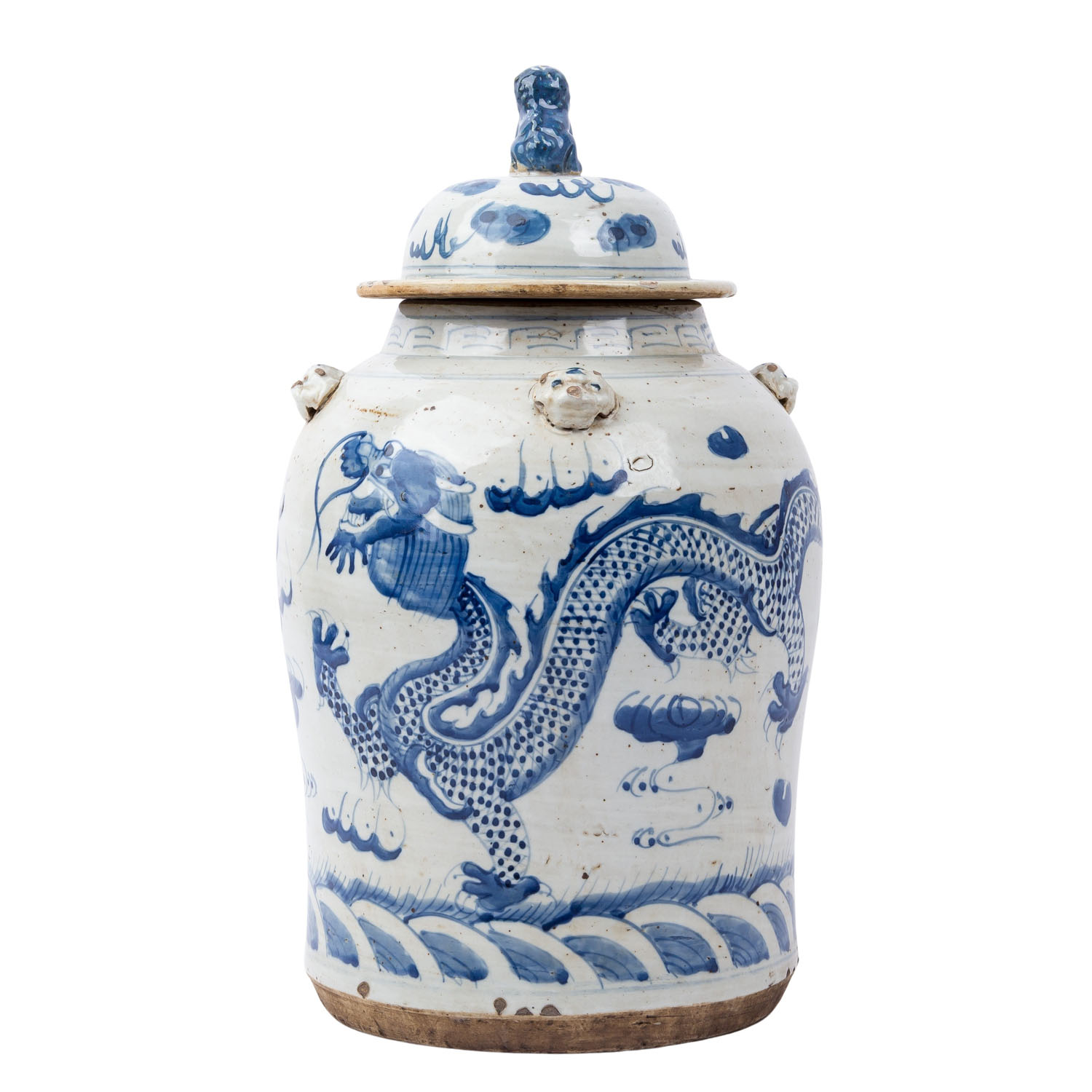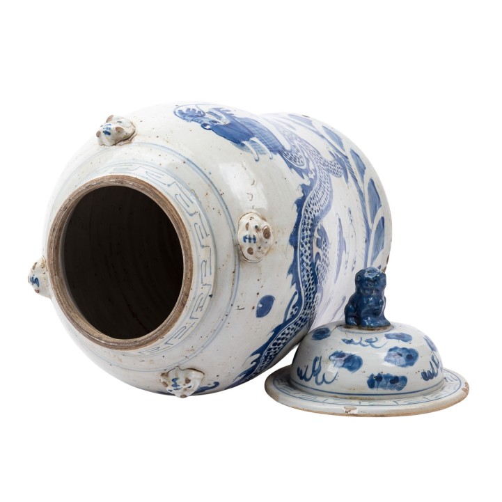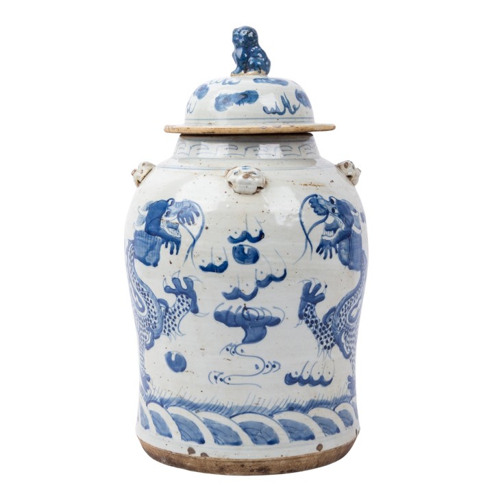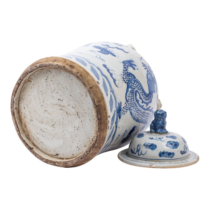 Blue and white lidded vase. CHINA, 20th century, with dragon decoration, H: 46.5 cm, damaged.