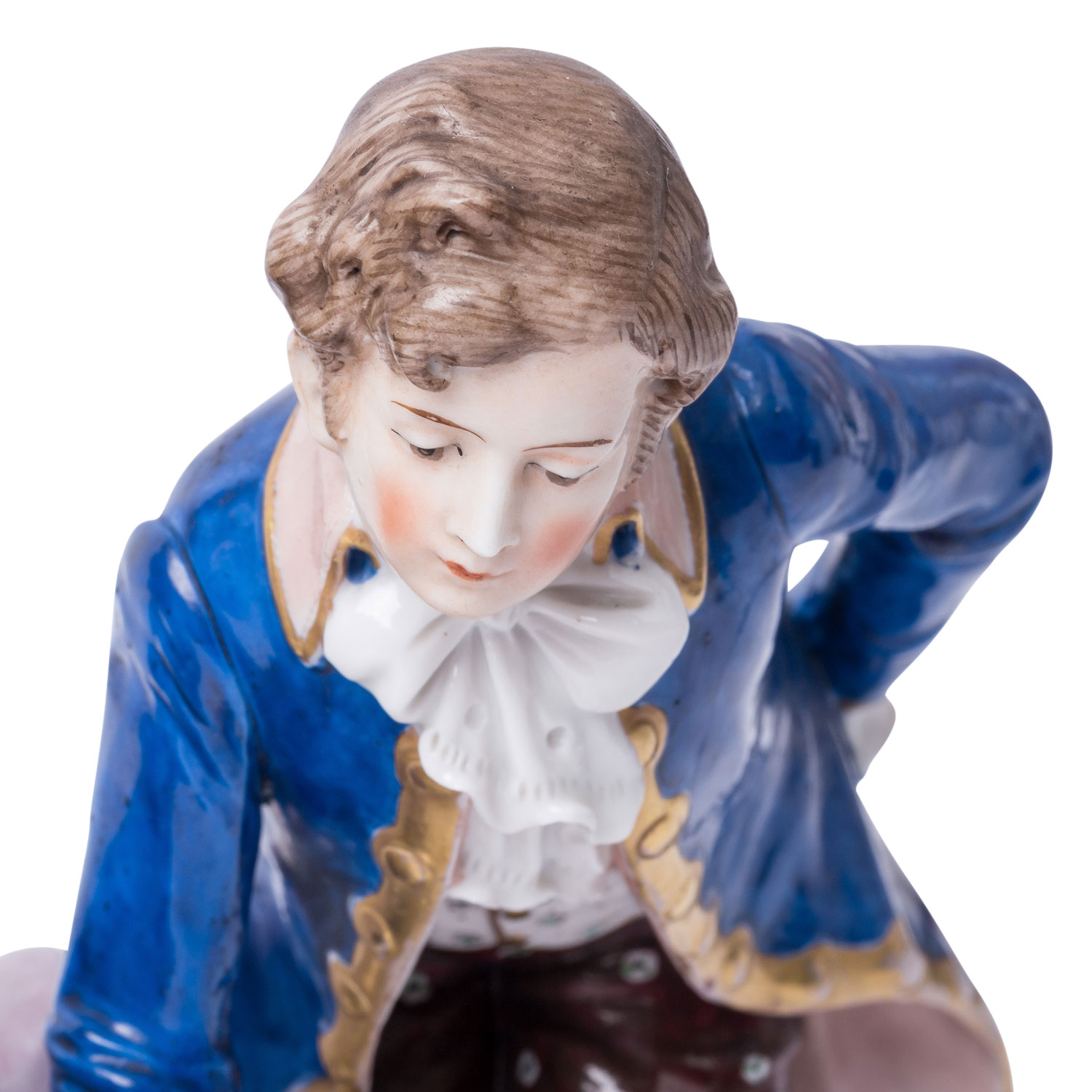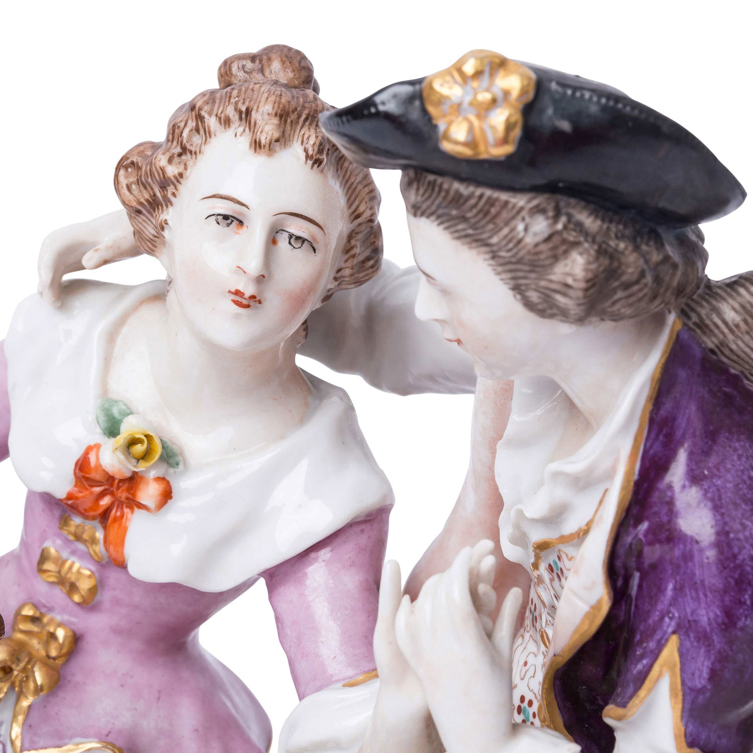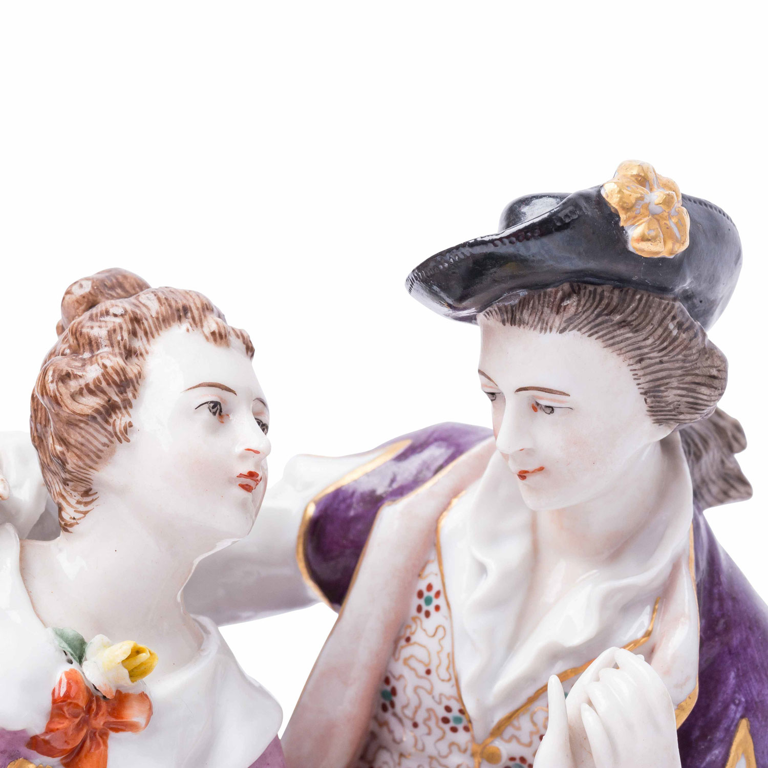 BOCK-WALLENDORF 2 groups of figures, 19th/20th century. Figure group 'Galant Scene', H. approx. 22.5 cm and figure group 'Musician Couple', H. approx. 19. Both with crowned double C stamp, signs of age, small damage, repaired.
