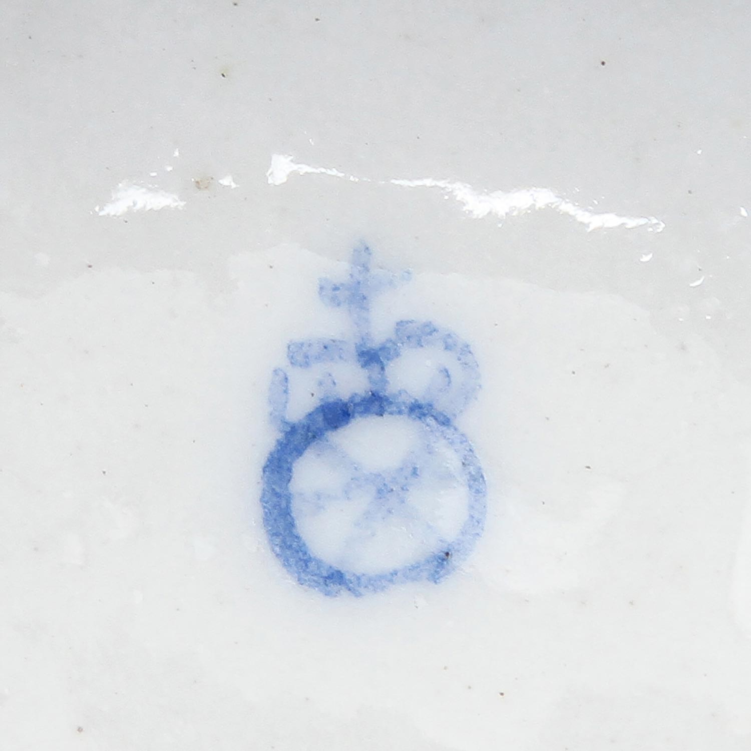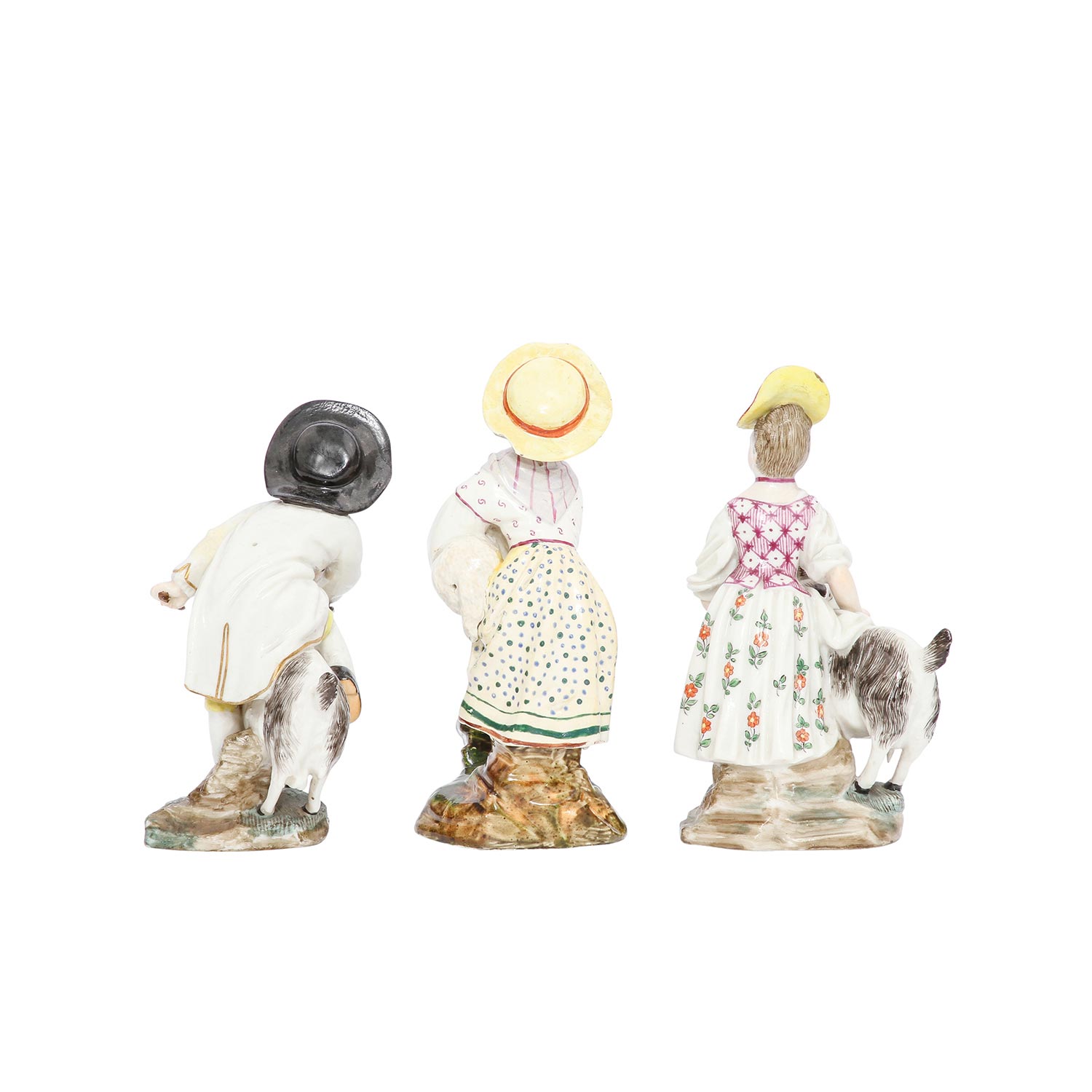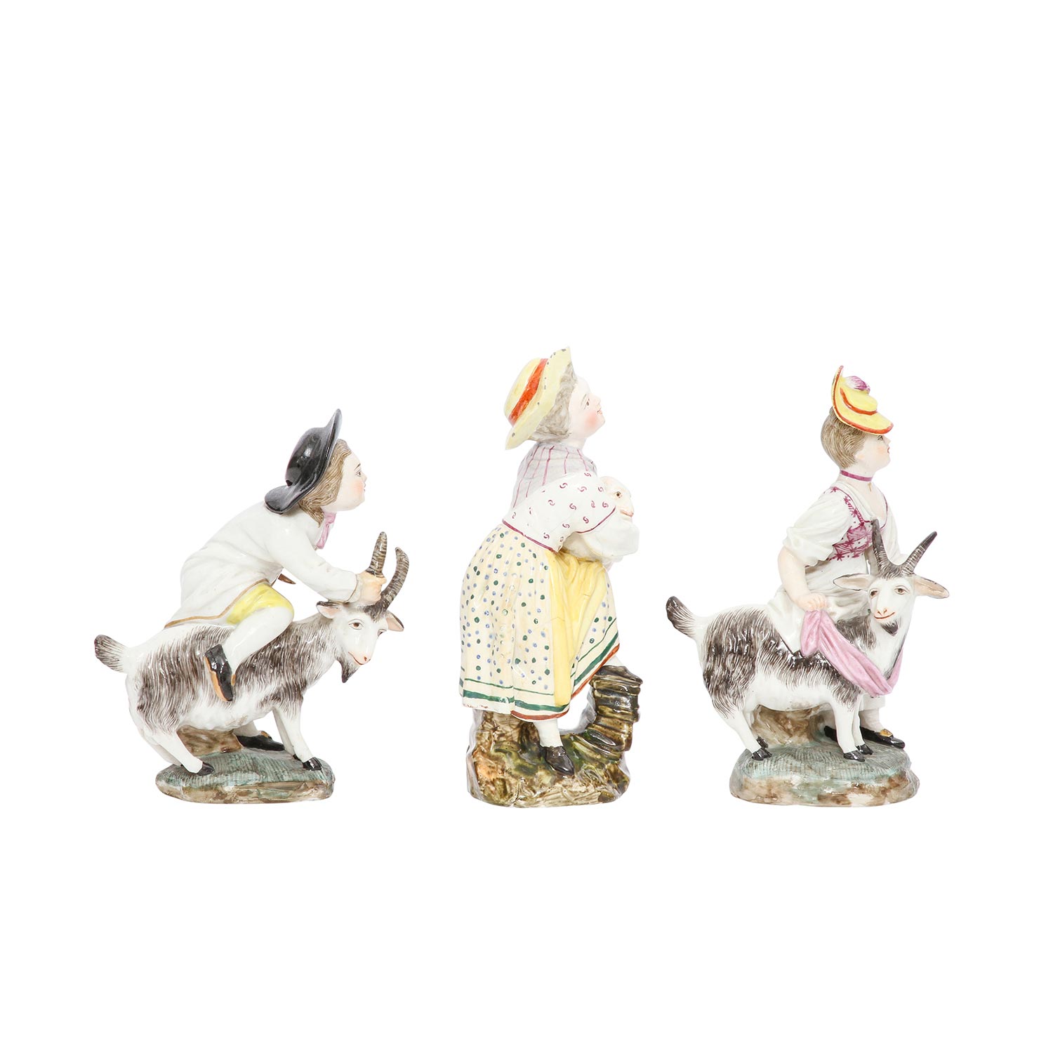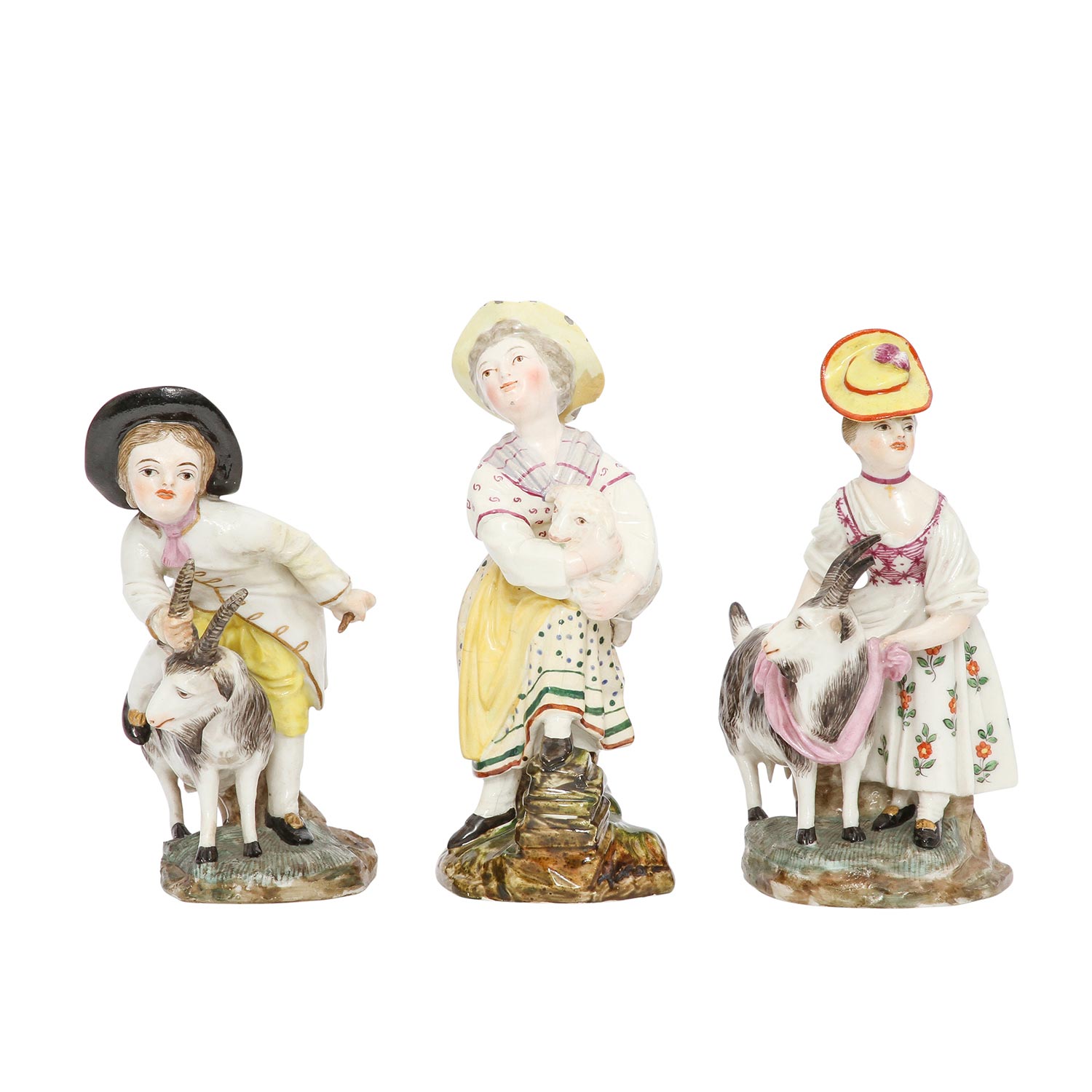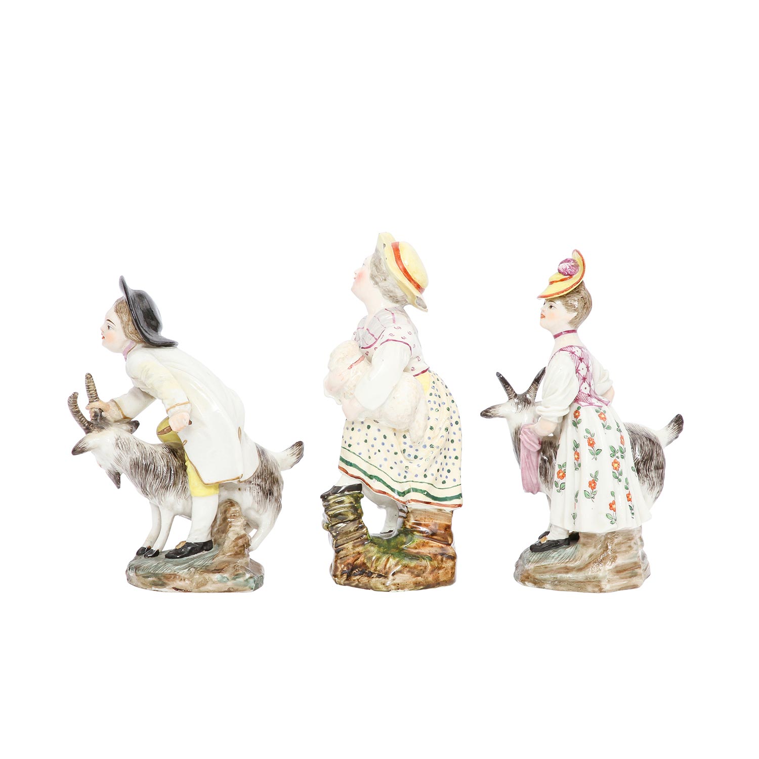 BOCK-WALLENDORF/DAMM Thuringia, 3 figure groups, 19th/20th century Bock-Wallendorf: "Boy with billy goat" (old restoration) and "Girl with billy goat", Höchst model by Johann Peter Melchior, c. 1780, each with blue Kurhut wheel mark and Damm: Girl with lamb (craquelure), blue wheel mark with the addition "D", polychrome staffage, each damaged, h 14 cm/16 cm.