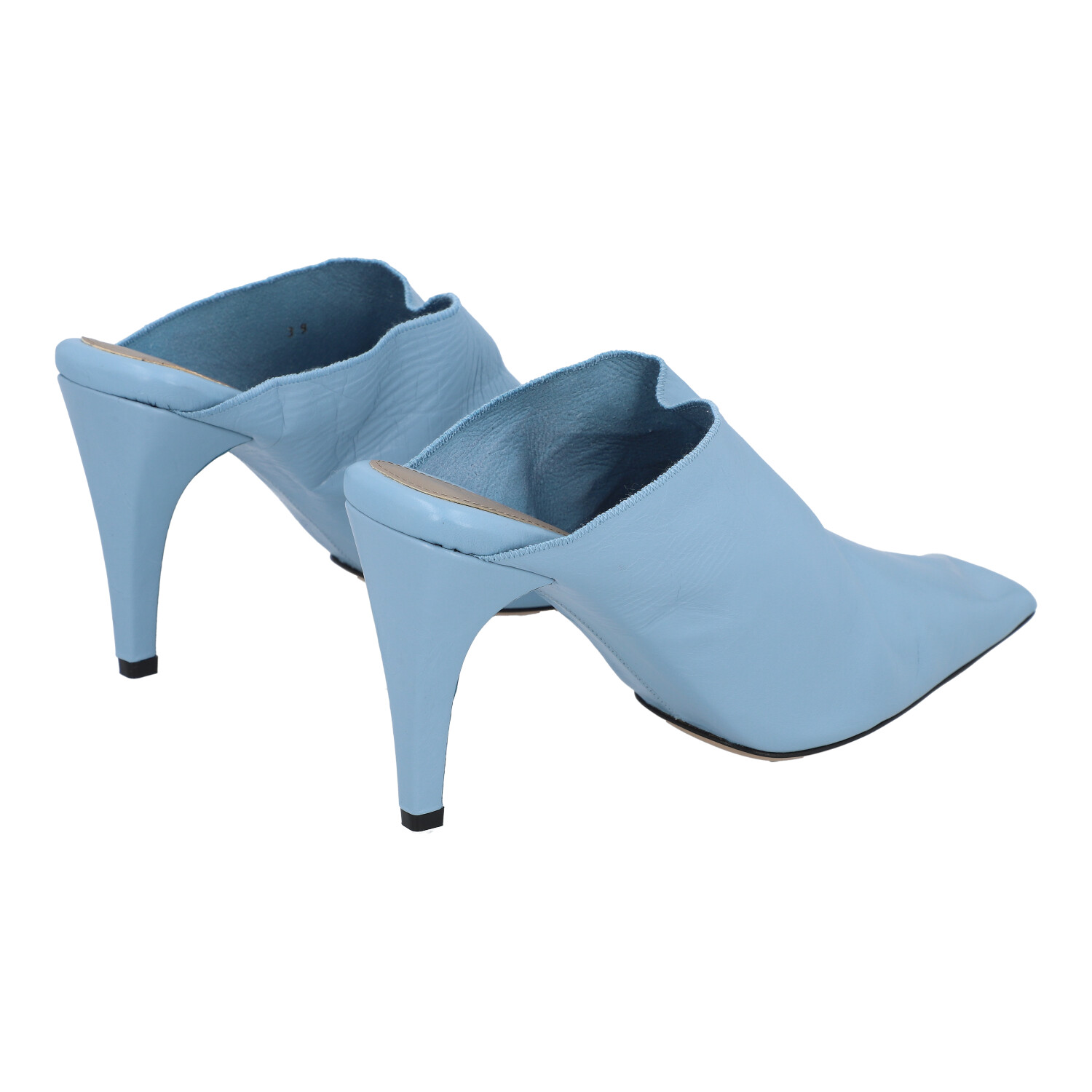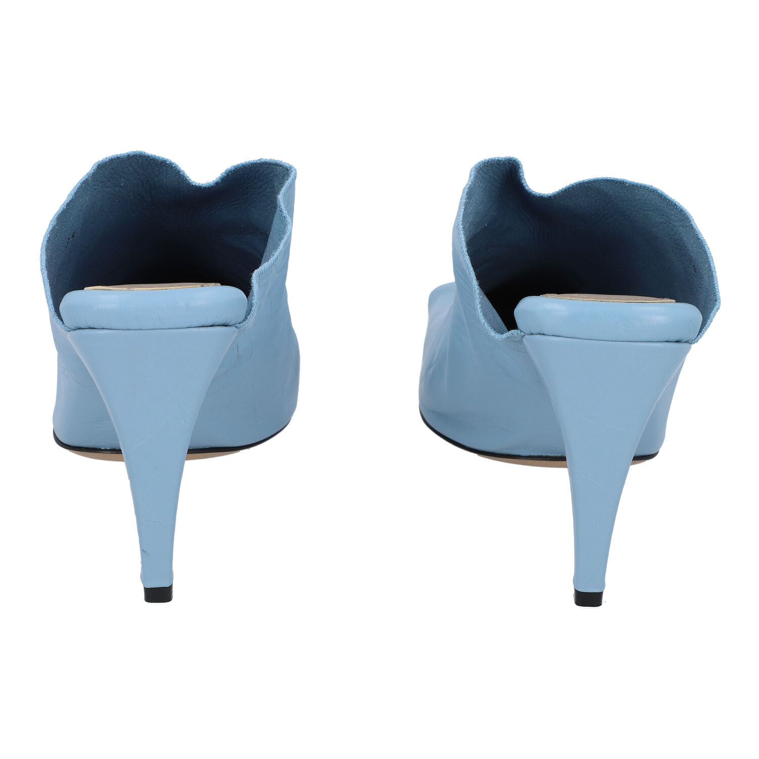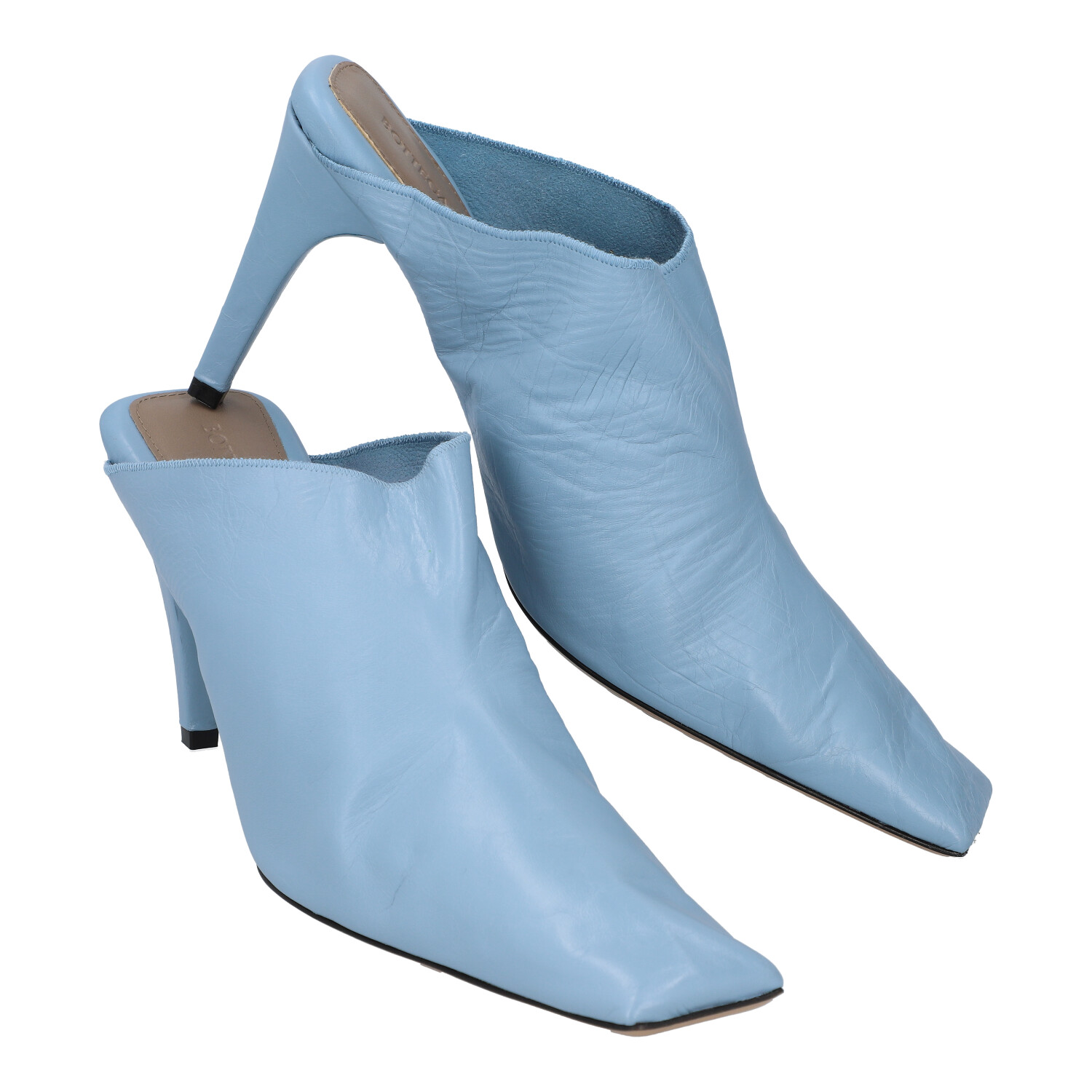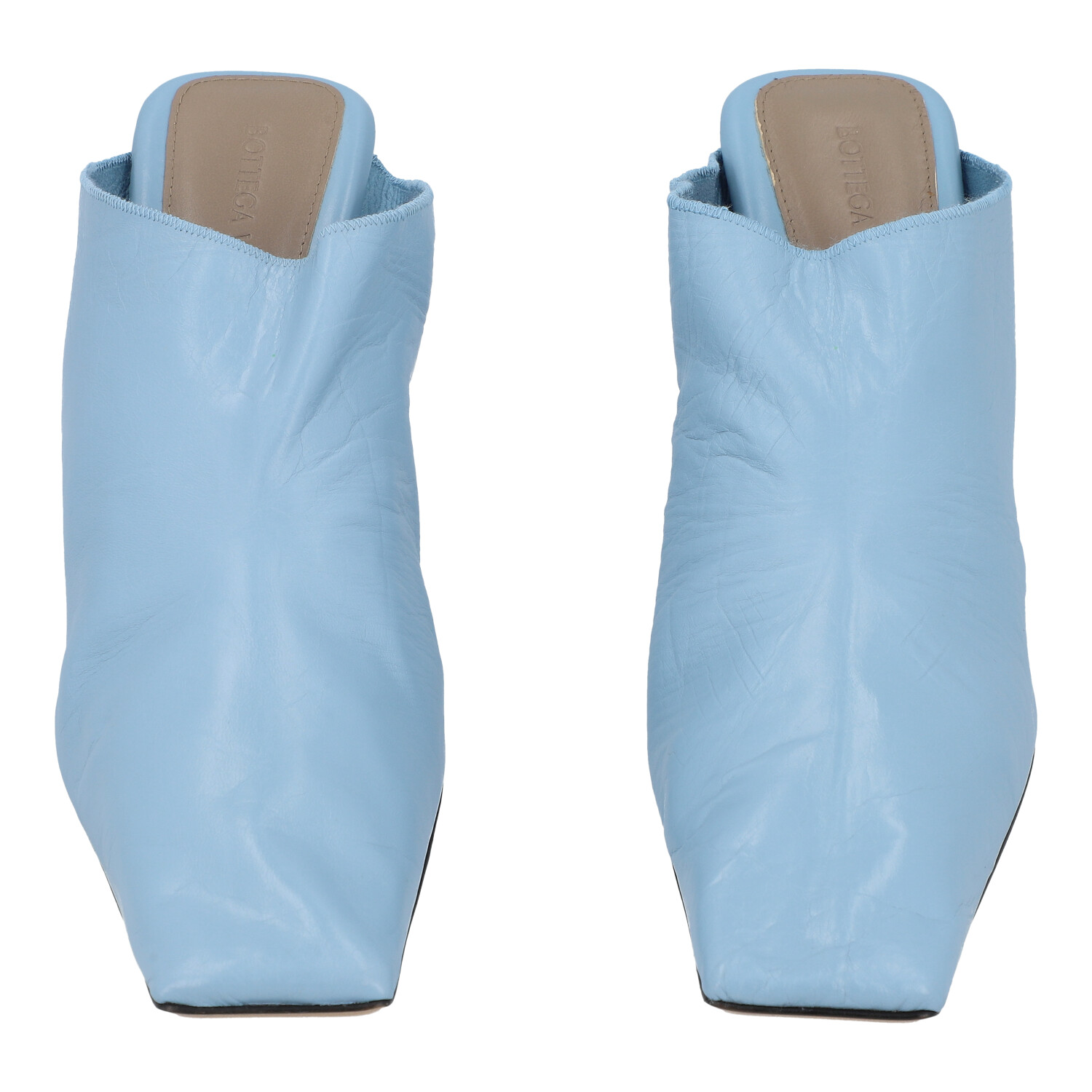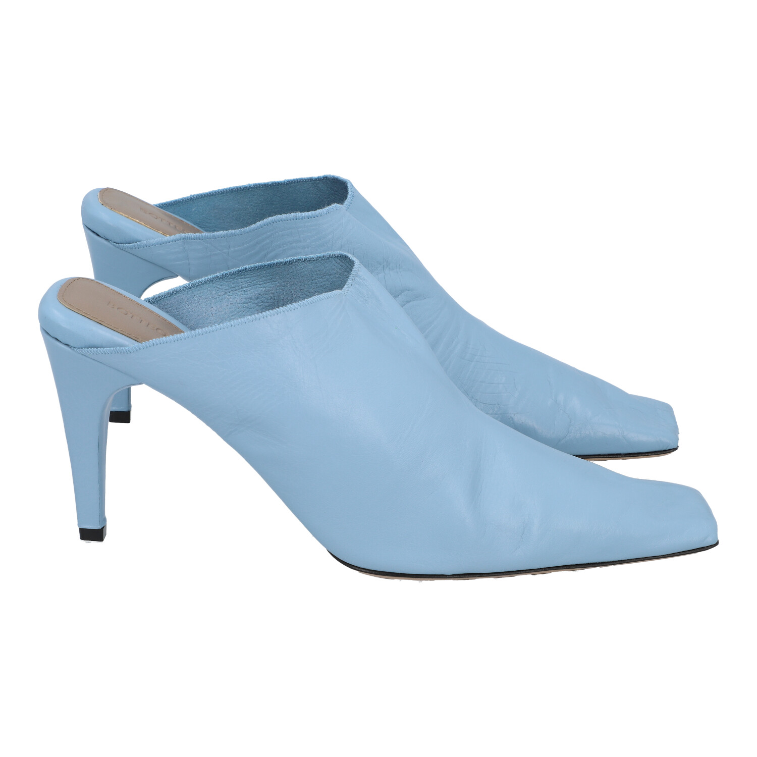 BOTTEGA VENETA mules, size 39. Leather in light blue with elongated toe. Rubberized outsole. Box enclosed. Very good condition.