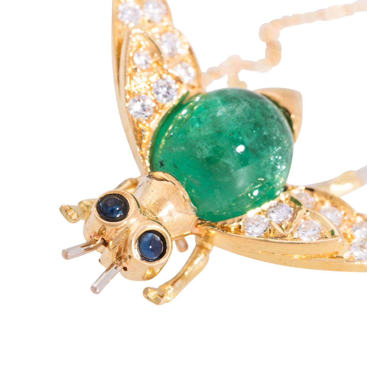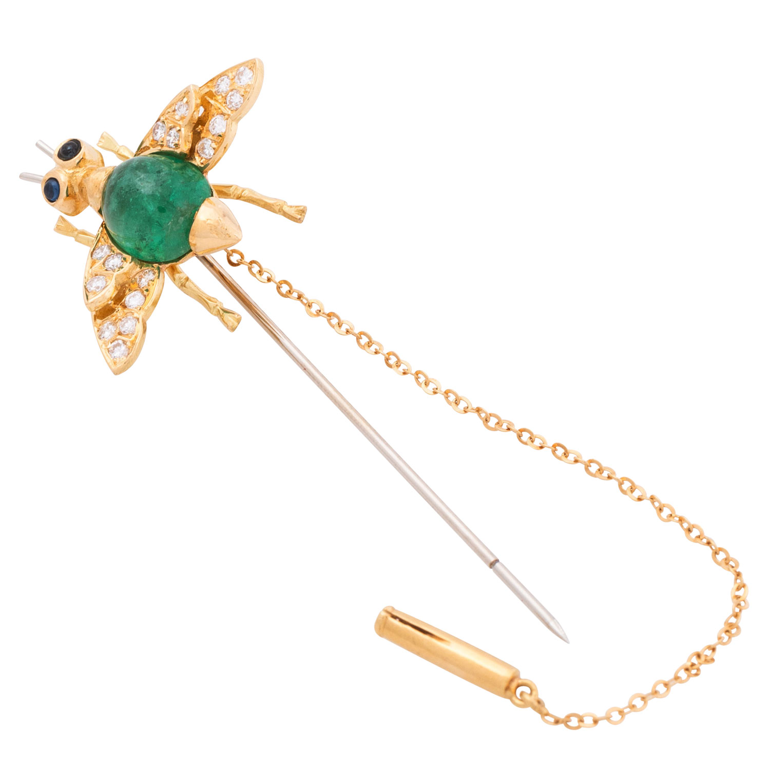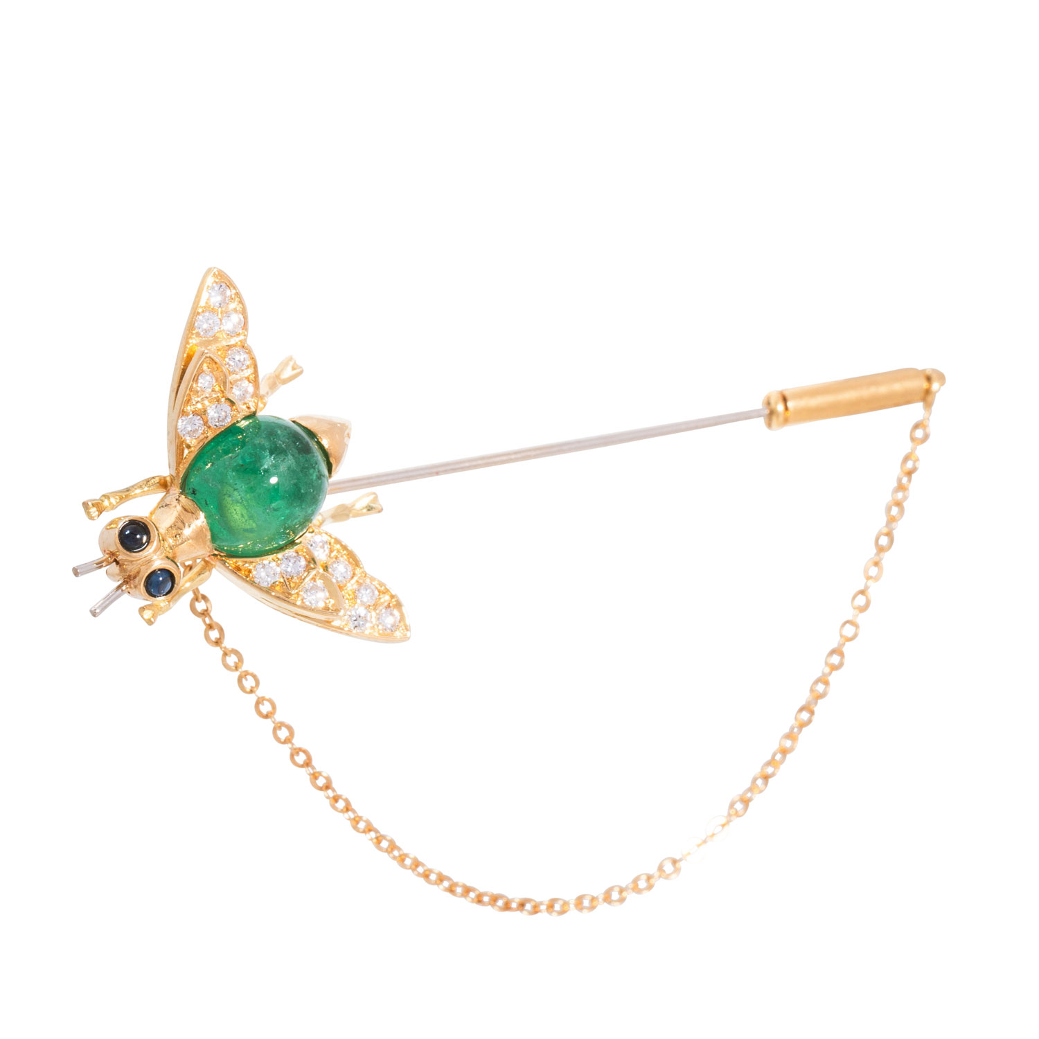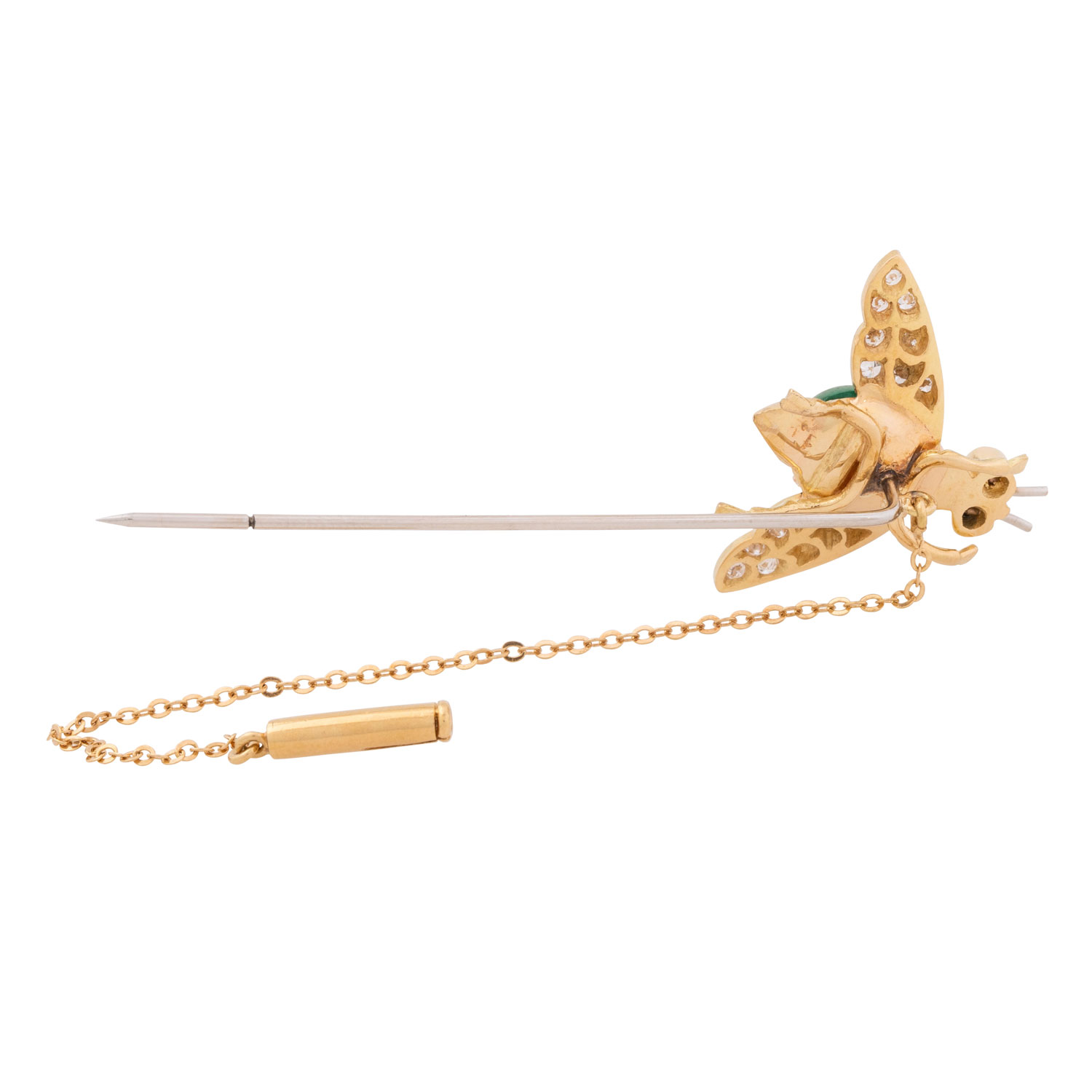 Needle "Fly" with cabochon-cut emerald, 2 small sapphires and brilliant-cut diamonds totalling ca. 0.35 ct, good colour and clarity, 18K yellow and white gold, 6.3 g, 25x2 cm, L: 6.5 cm, with safety chain, late 20th century, good condition, nice workmanship.