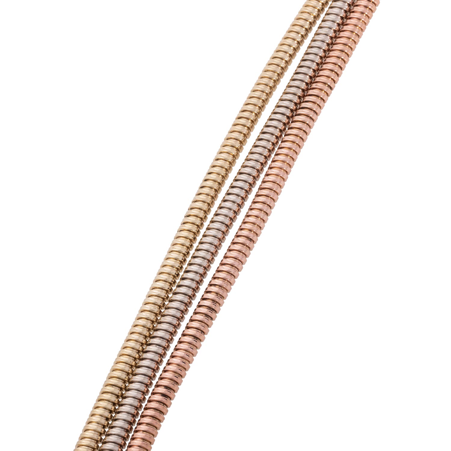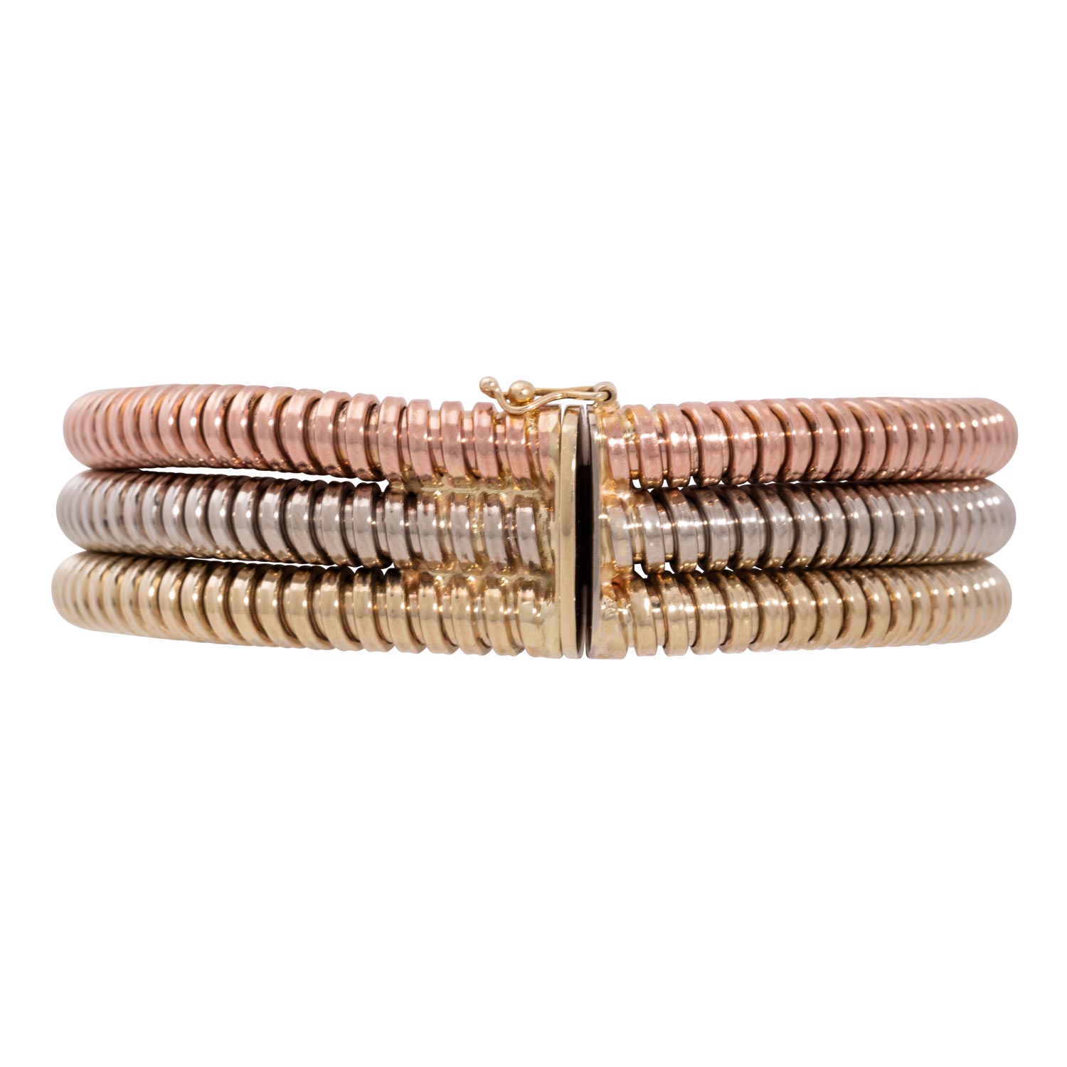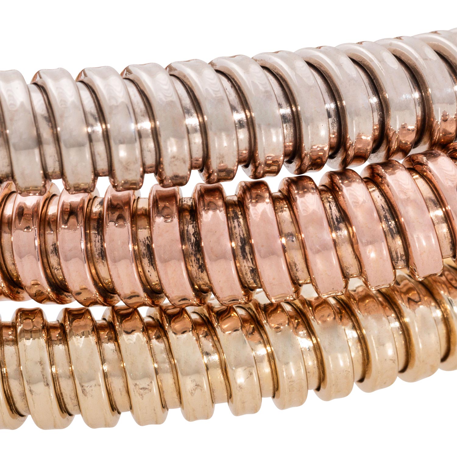 Bracelet, 3 rows, 14K yellow, white and red gold, 50.9 g, L: 21 cm, W: 18 mm, box clasp, security catch, 2nd half of 20th century, minimal signs of wear.