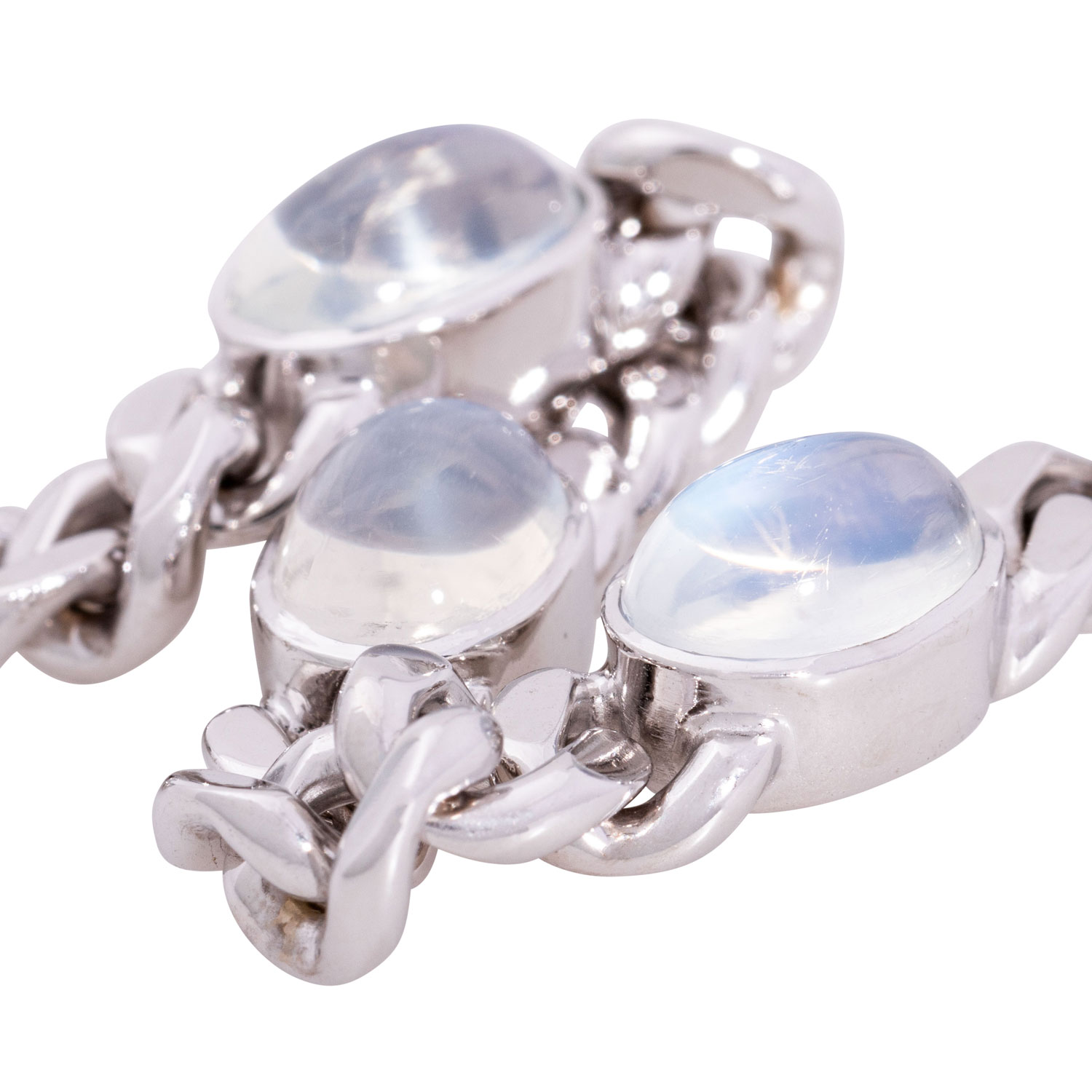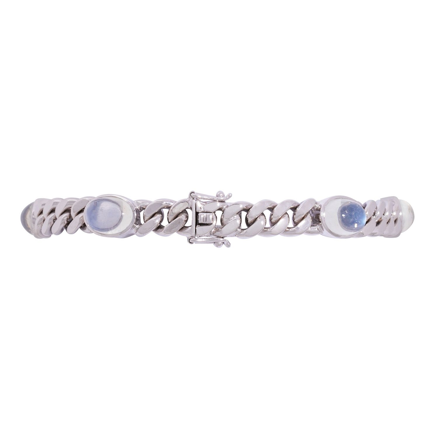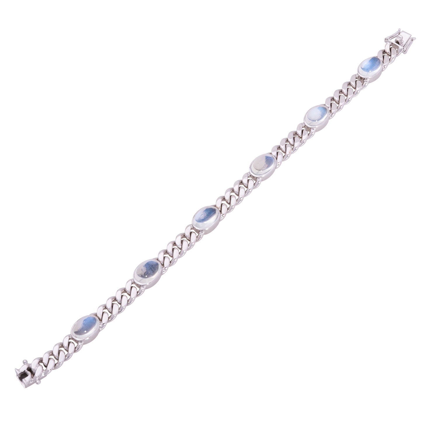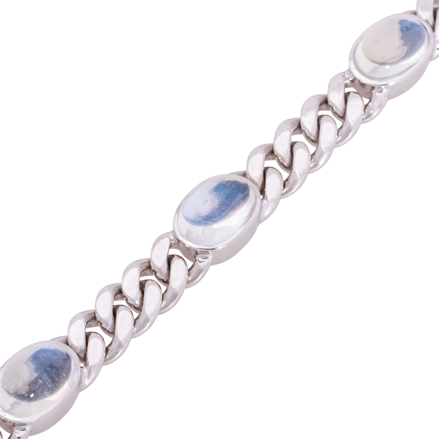 Bracelet, curb link chain, with 6 moon stones, oval cabochons, ca. 9.6 x 6.7 mm, 14K white gold, 29.9 g, L: 19 cm, W: 8 mm, box clasp, 2 security catches, late 20th century, minimal signs of wear.