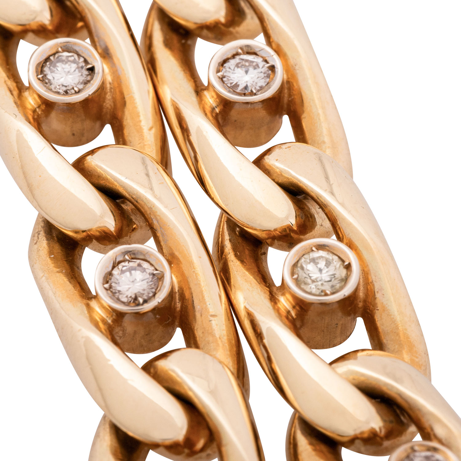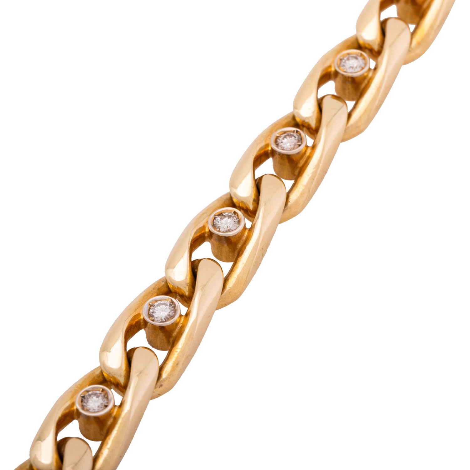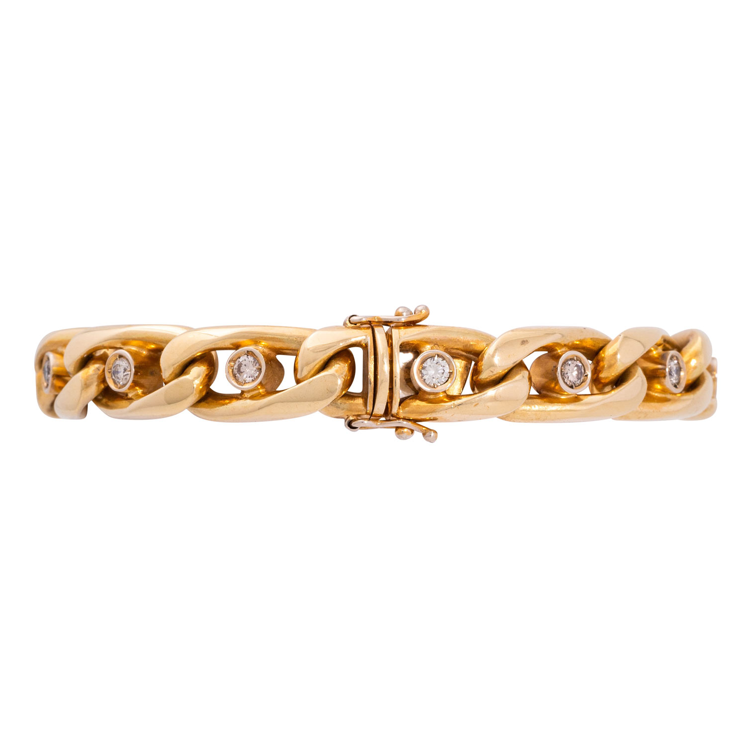 Bracelet, curb link chain with 14 brilliant cut diamonds, totalling ap. 1.2 ct, STW (I-J)/SI-P, 18K yellow and white gold, 57.1 g, L: 19 cm, W: 9 mm, box clasp with 2 security catches, late 20th century, minimal signs of wear, 1 stone chipped.