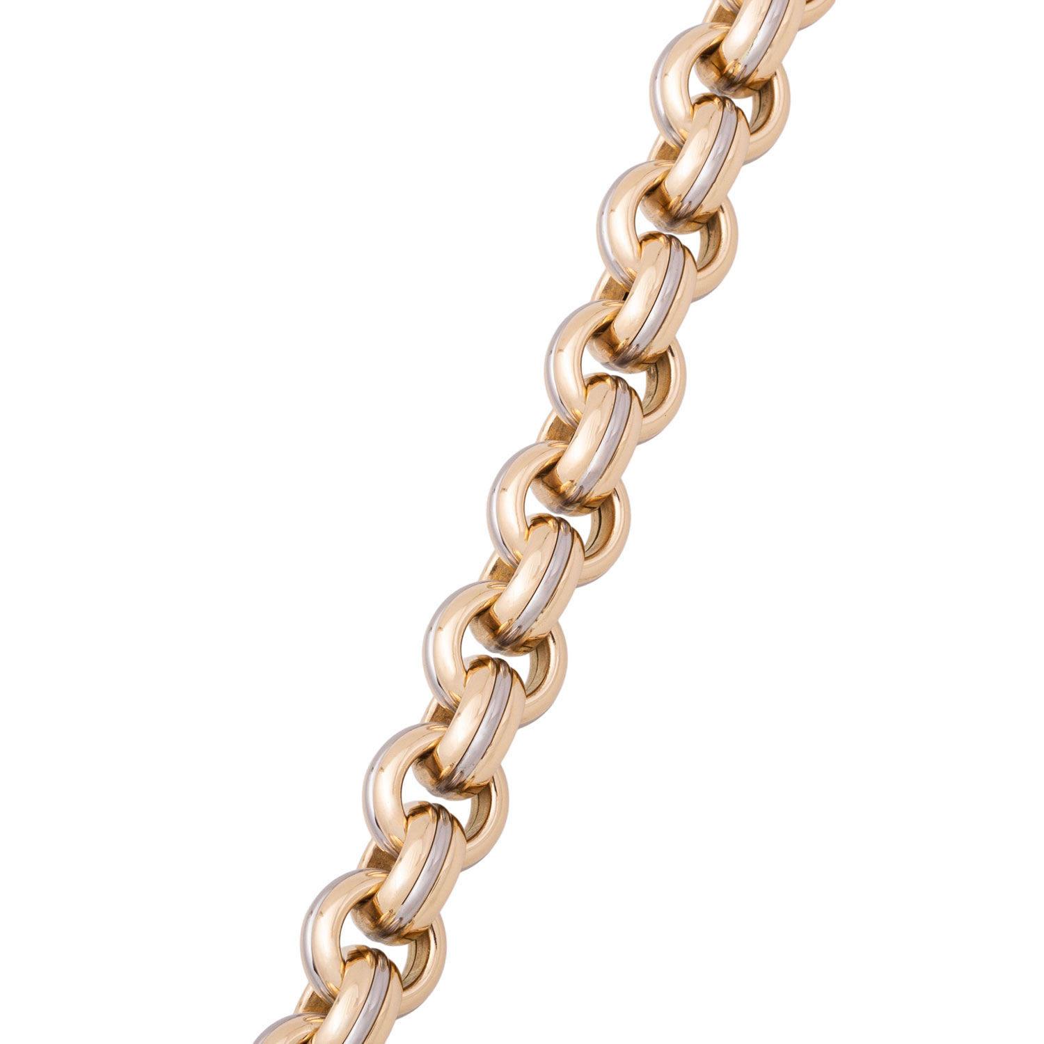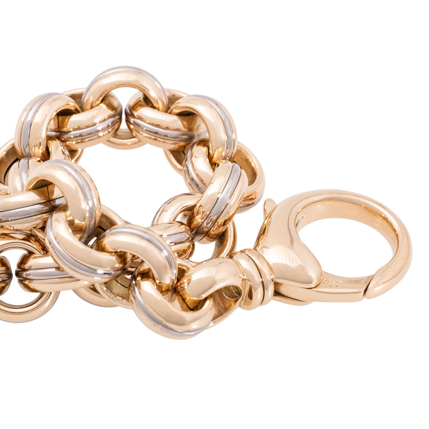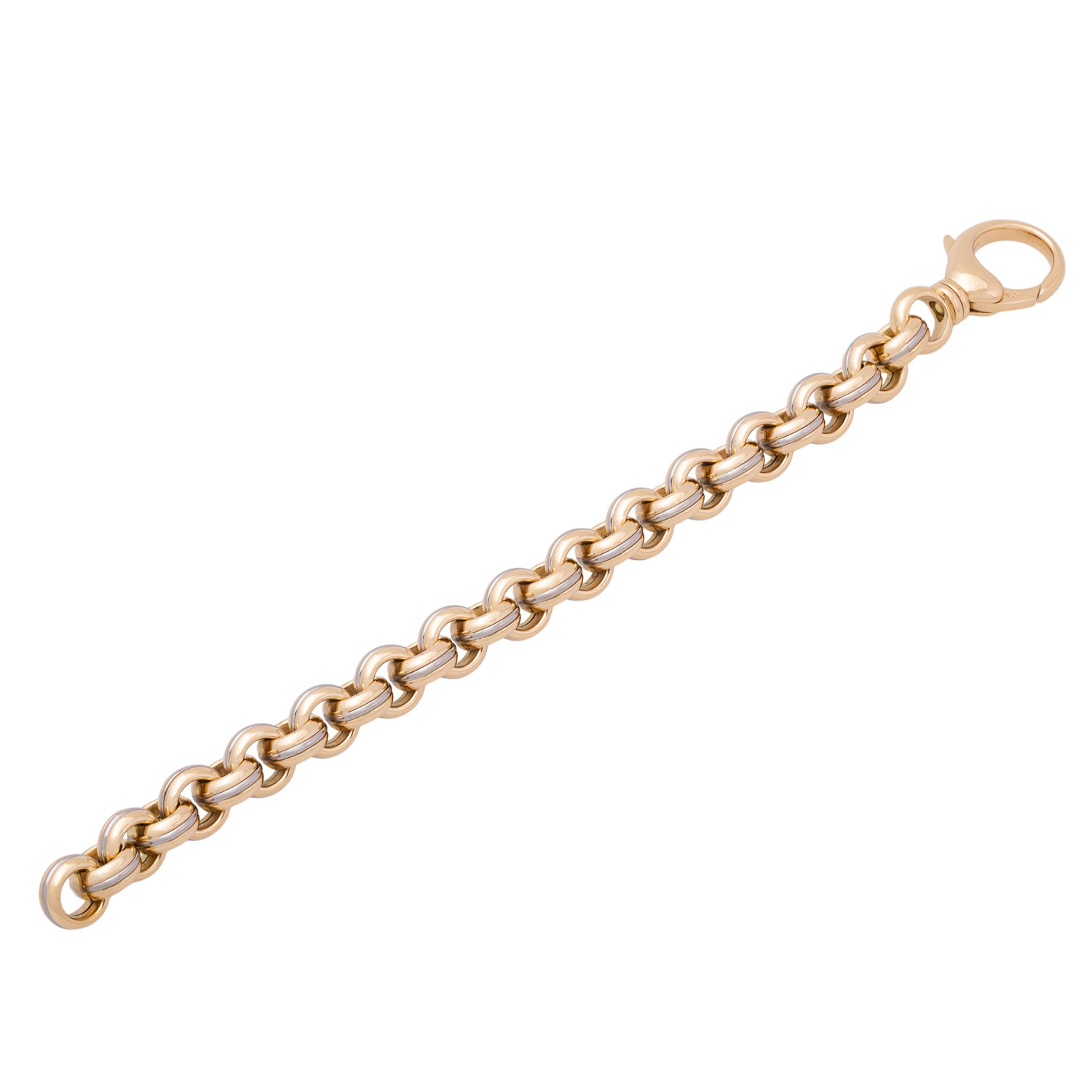 Bracelet, round links with half round profile and in two colours, 18K yellow and white gold, 85.4 g, L: 22.5 cm, W: ap. 13 mm, jewellery snap hook, late 20th century, minimal signs of wear, handcrafted.