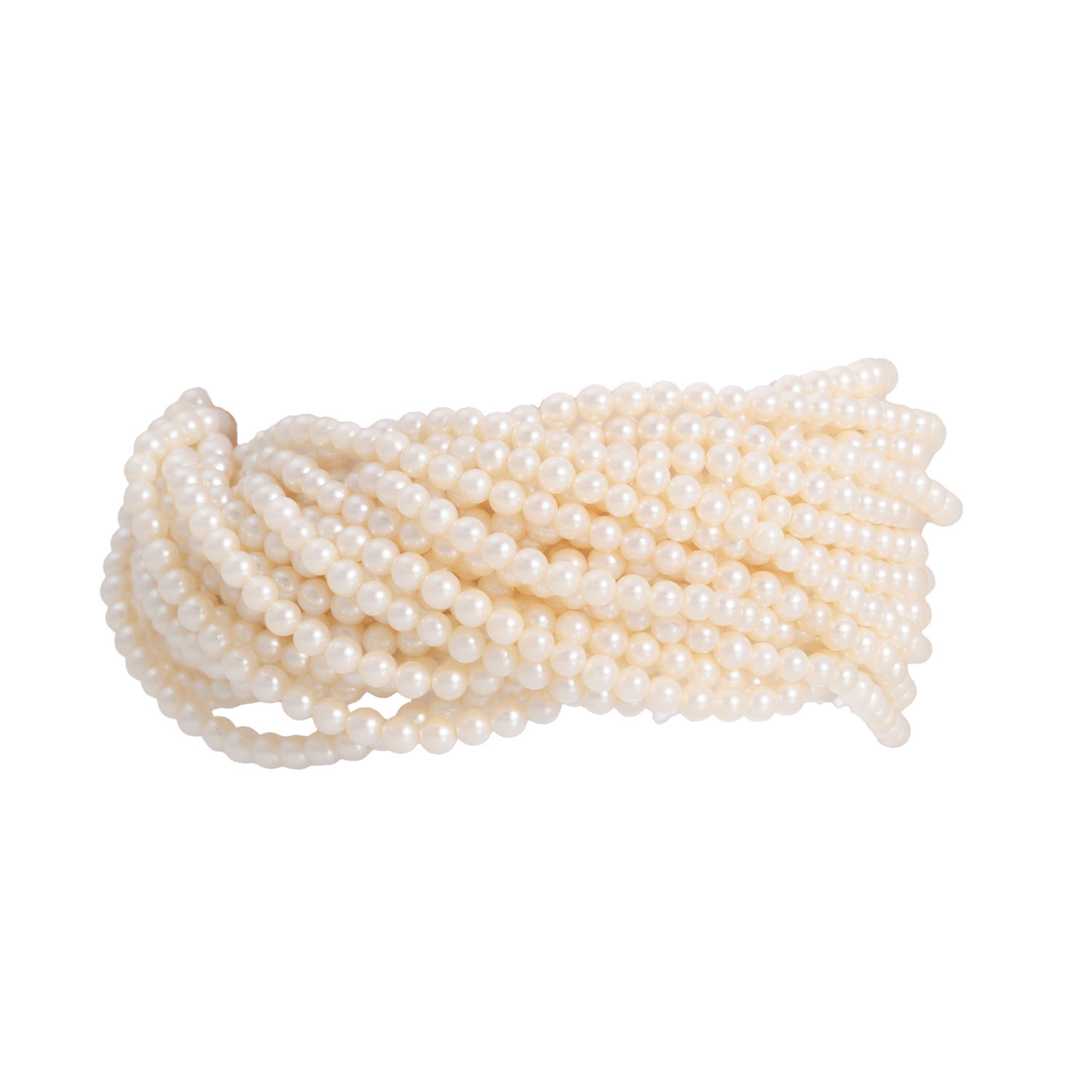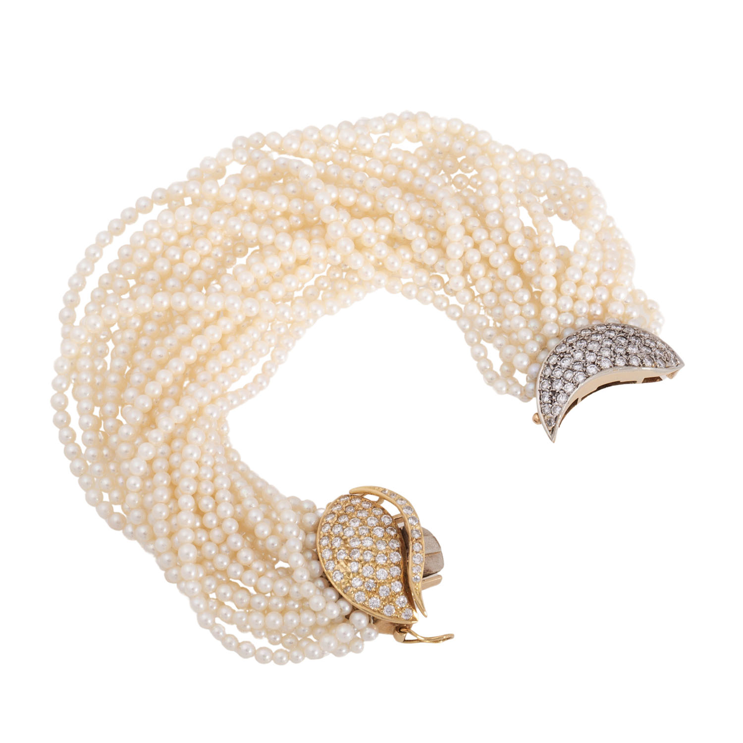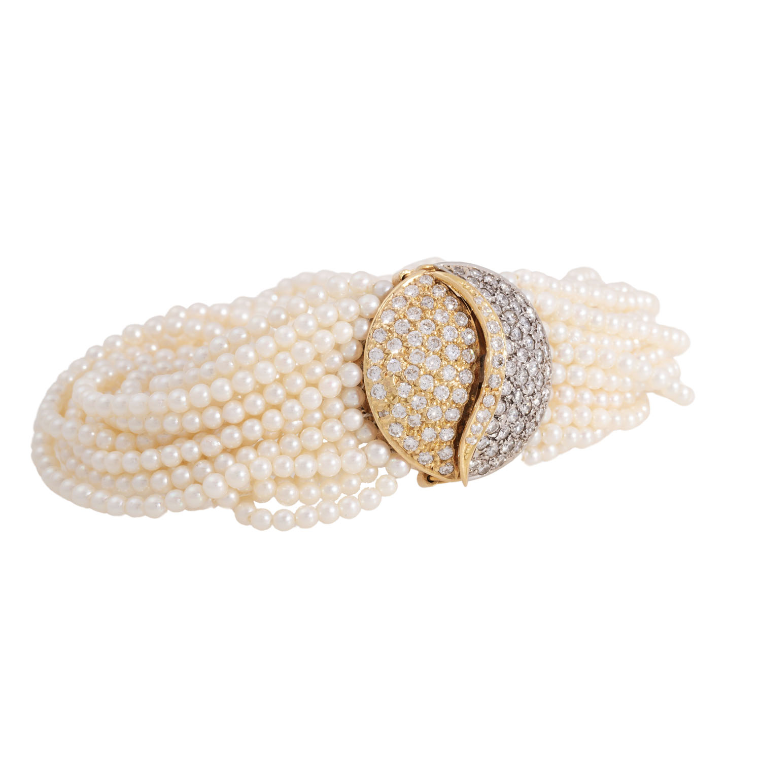 21-row bracelet of cultured seed pearls 2.2 mm, L: 16.5 mm, clasp of YG/WG 18K, D: 2.5 cm, with brilliant-cut diamonds totall. c. 3 ct, good colour and clarity, late 20th century, good condition, nice craftsmanship.
