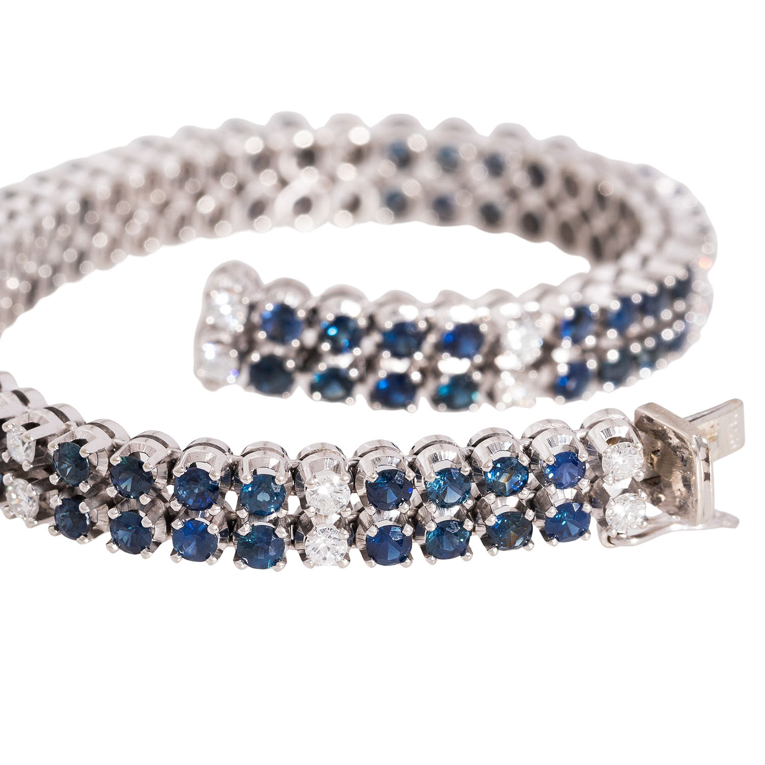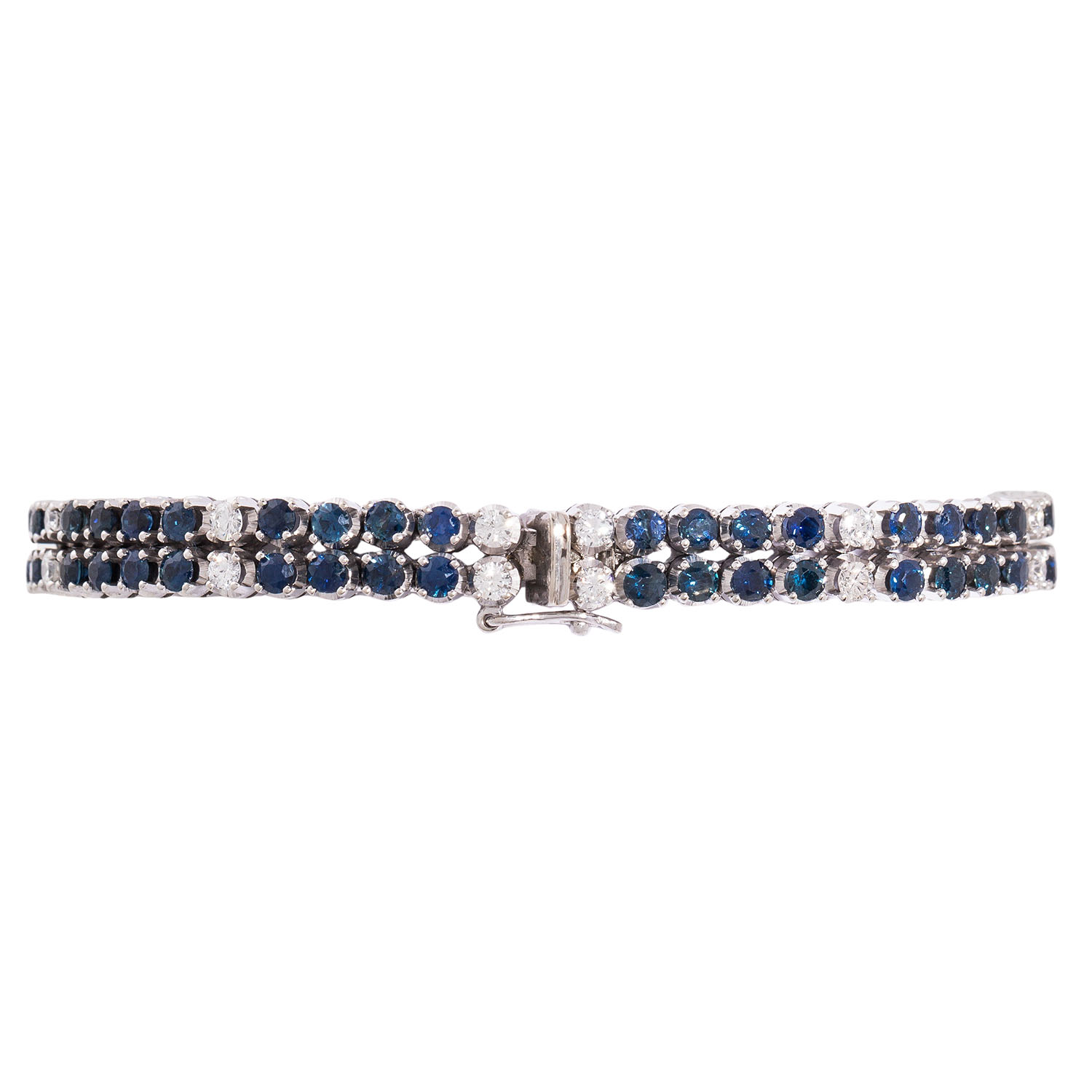 Bracelet with 2 row of sapphires, totalling ca. 8.35 ct and brilliant-cut diamonds totalling ca. 1.48 ct, good colour, low to medium clarity (stone weights marked), 18K white gold, 26.8 g, L: 18 cm, 2nd half of 20th century, good condition.