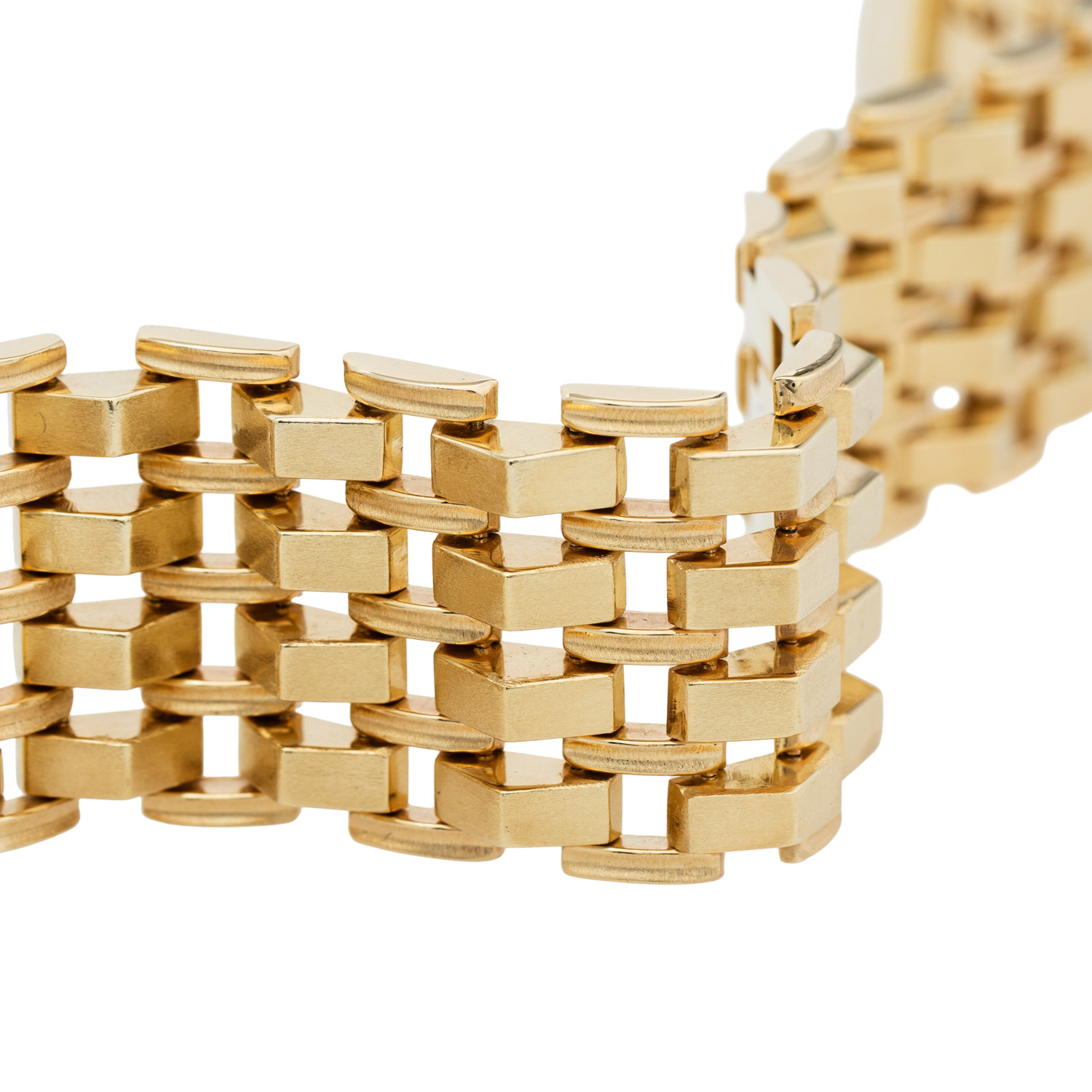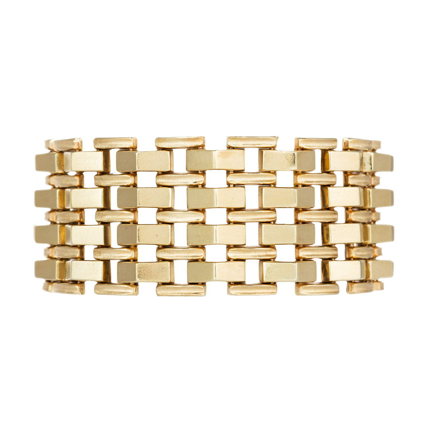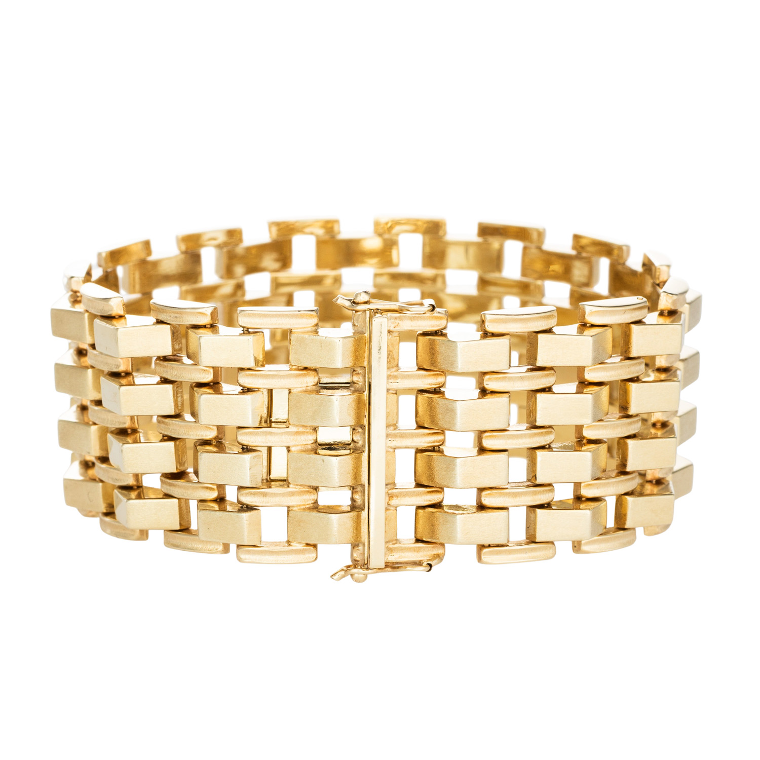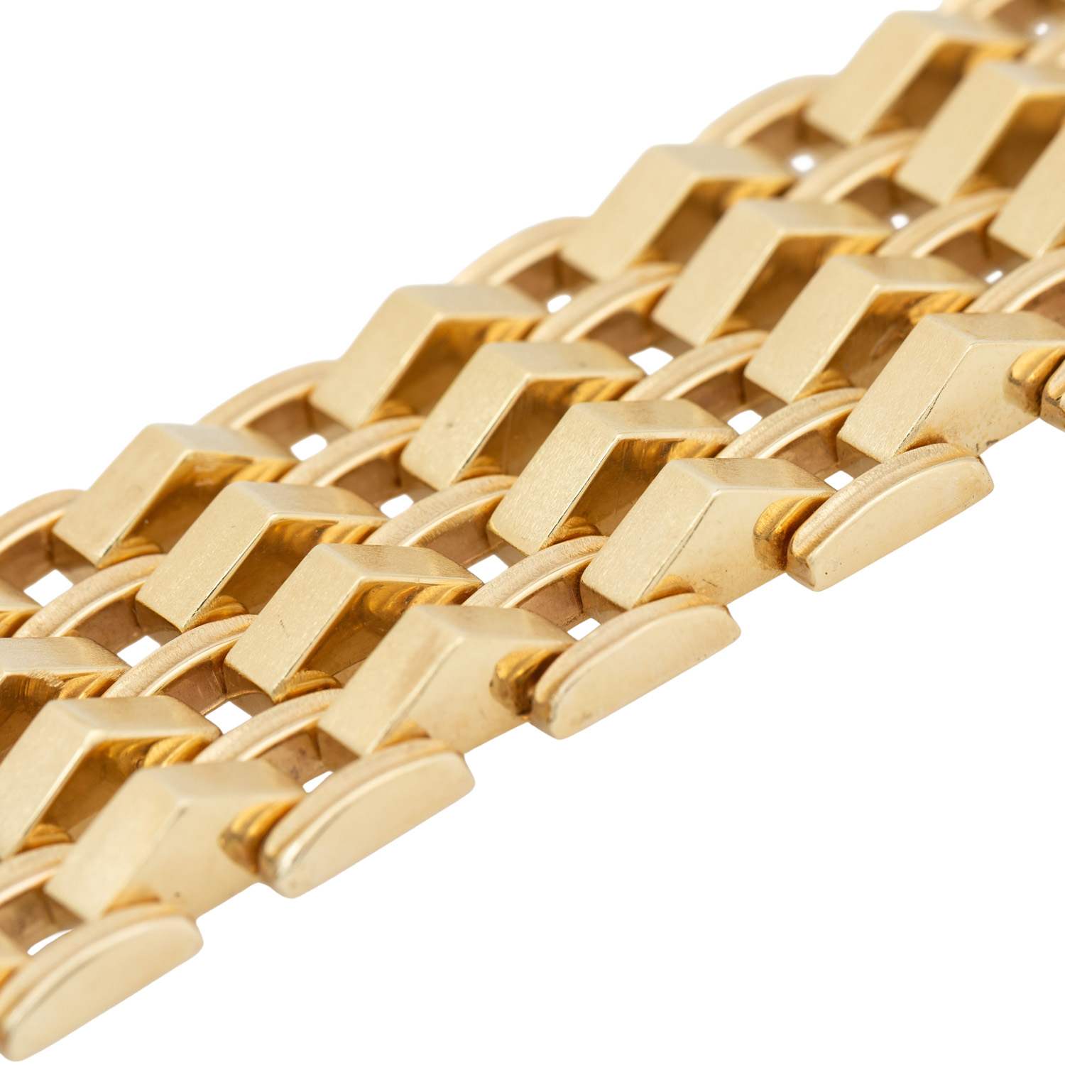 Bracelet, links tacked, matted, 14K yellow gold, 63.6 g, L: 20 cm, B: 29.5 mm, box clasp, 2 safety catches, 2nd half of 20th century, minimal signs of wear.