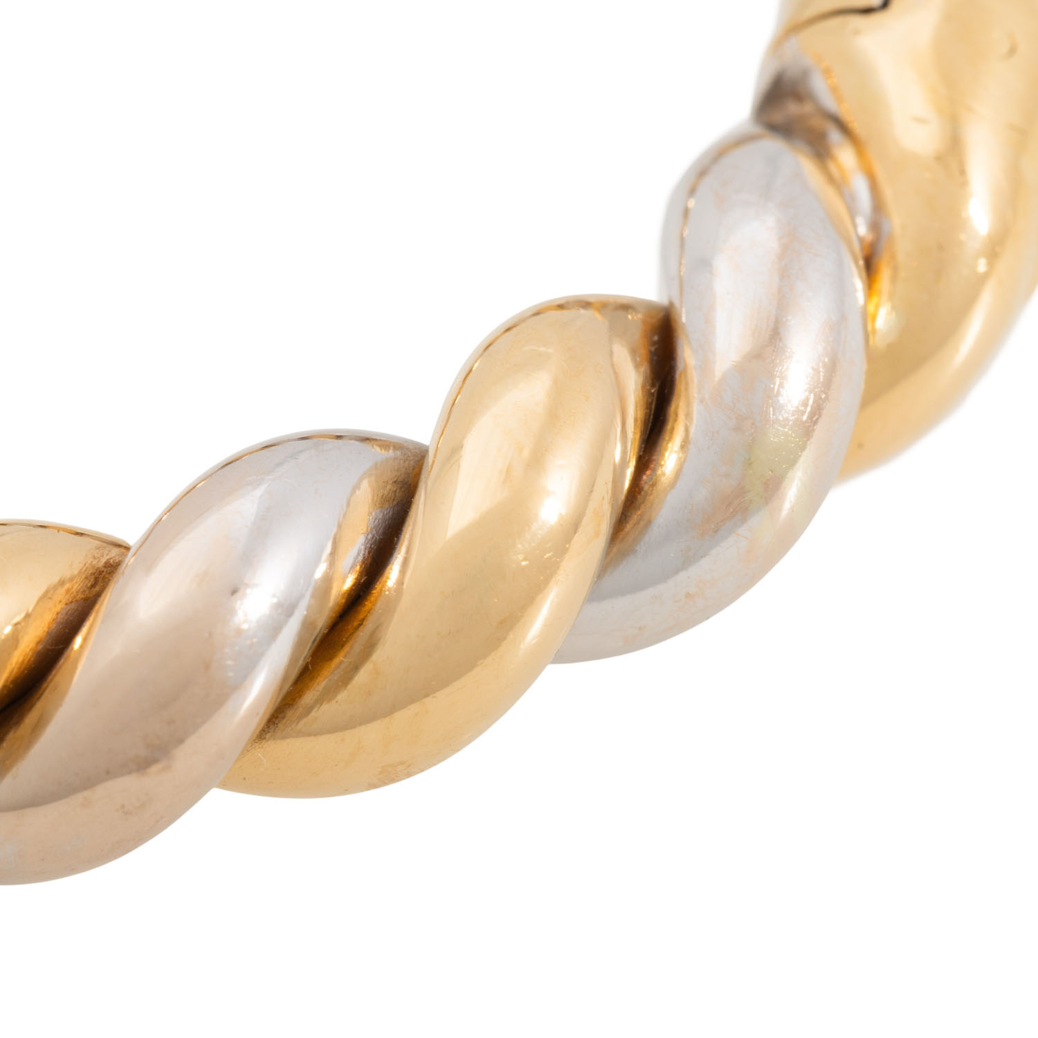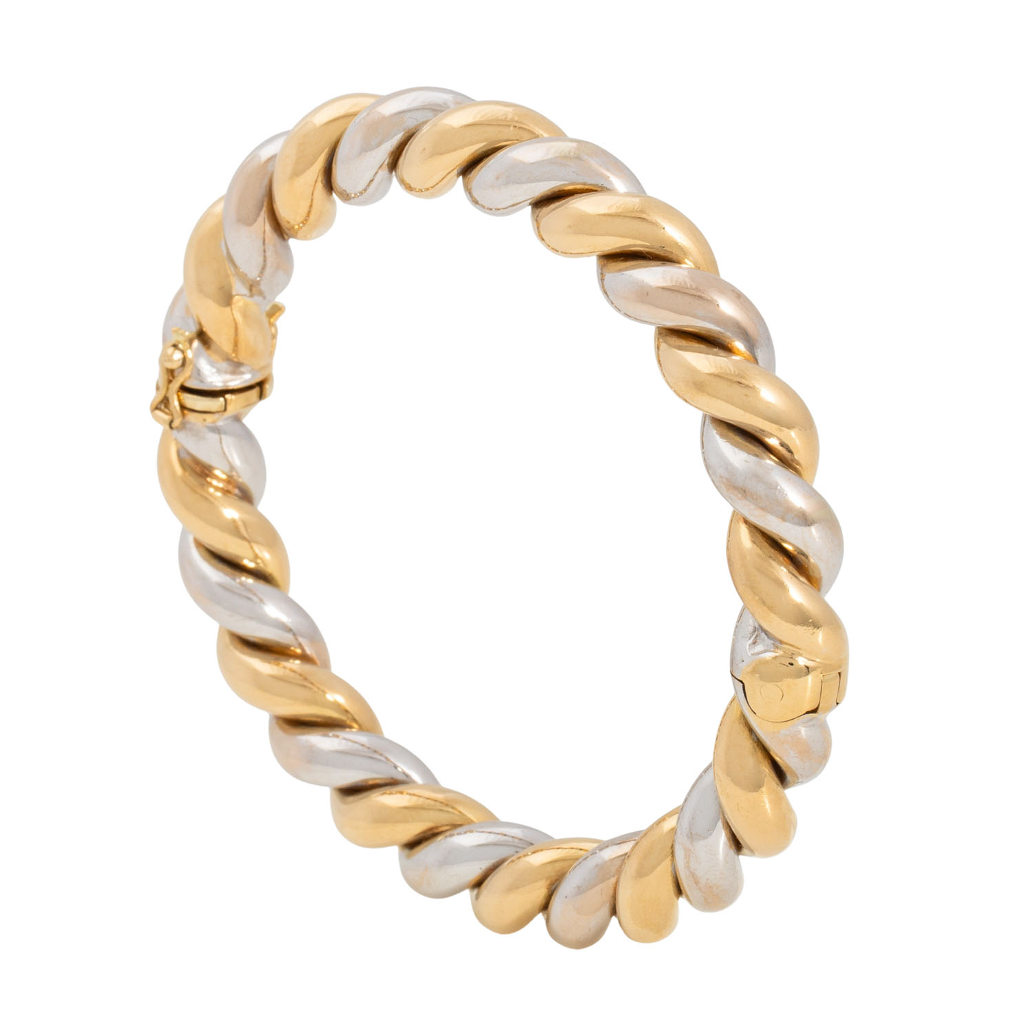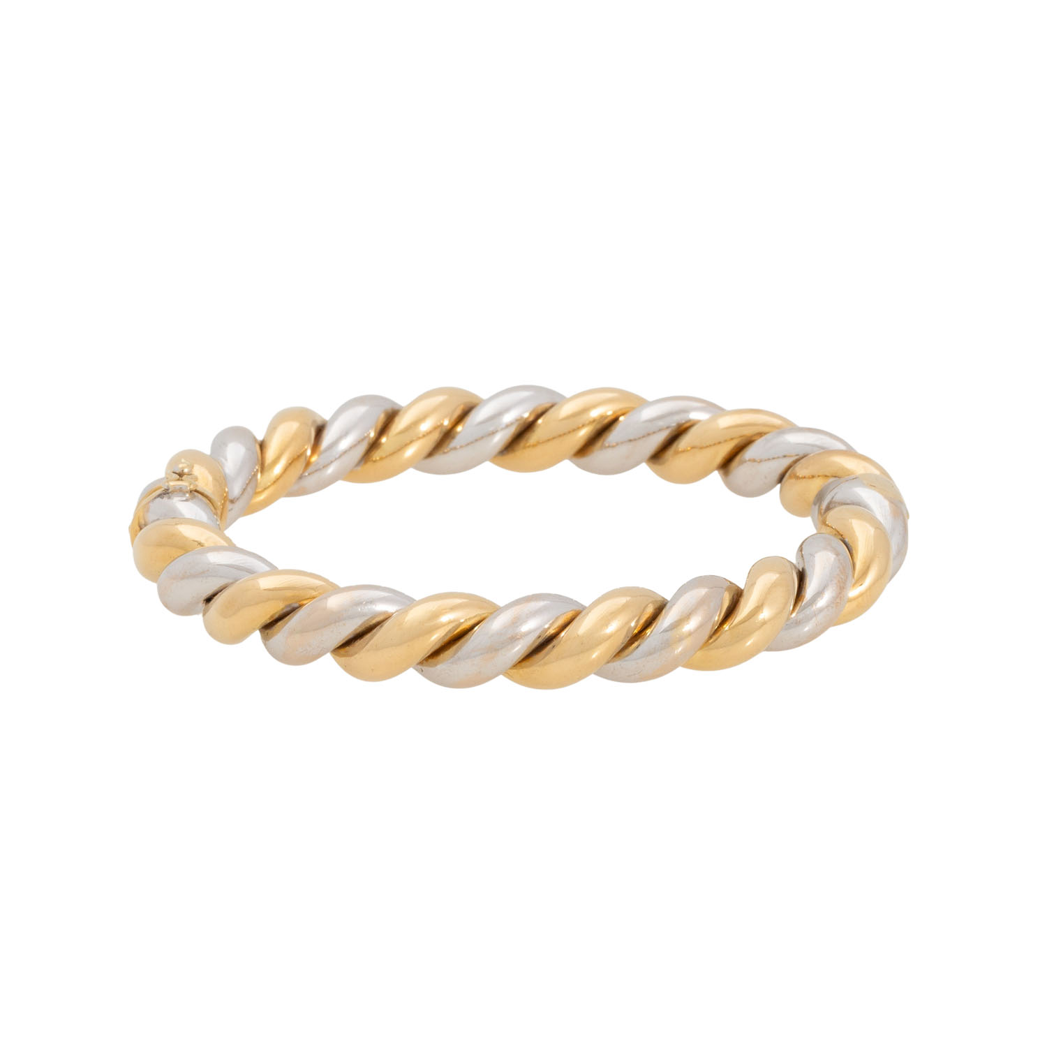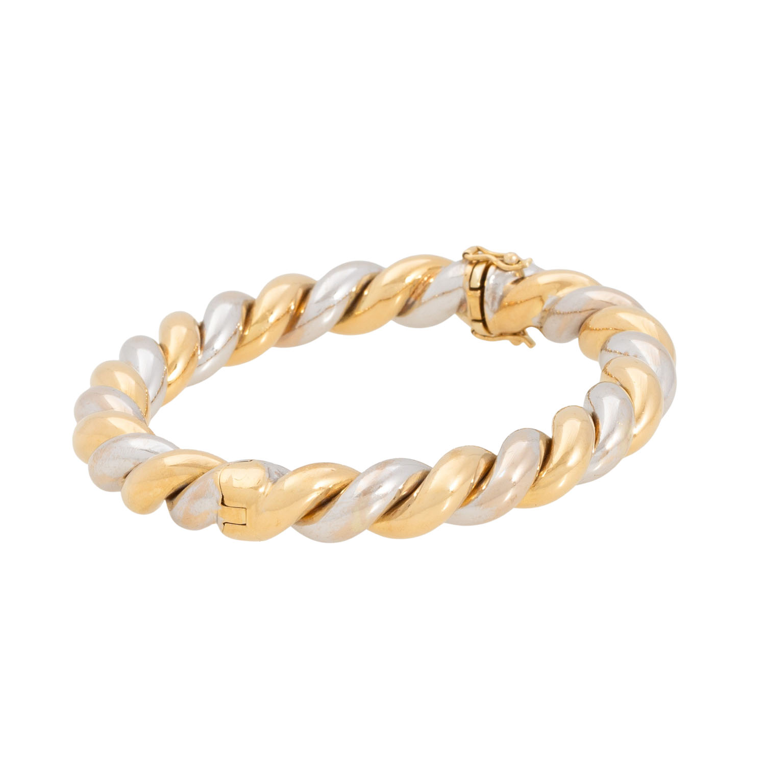 Bangle, 18K yellow and white gold, 45,4 g, inside circumference: ca. 16,5 cm, late 20th century, minor signs of wear, box clasp with saftey catch, handcrafted work.