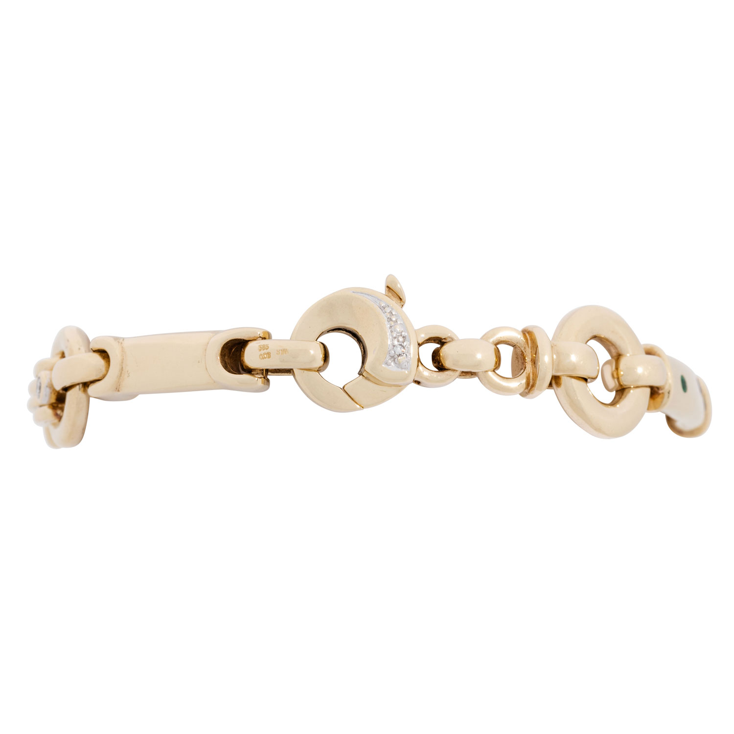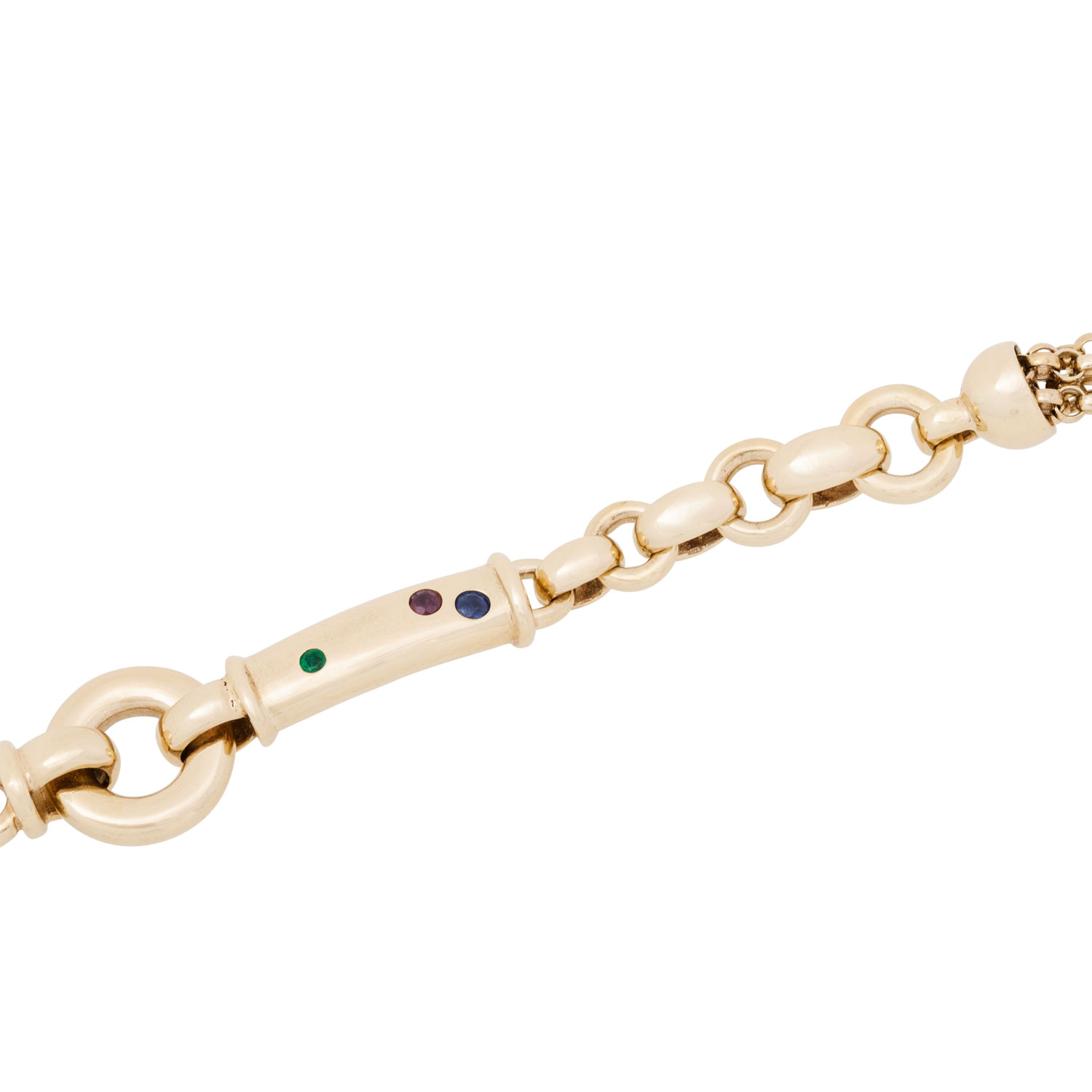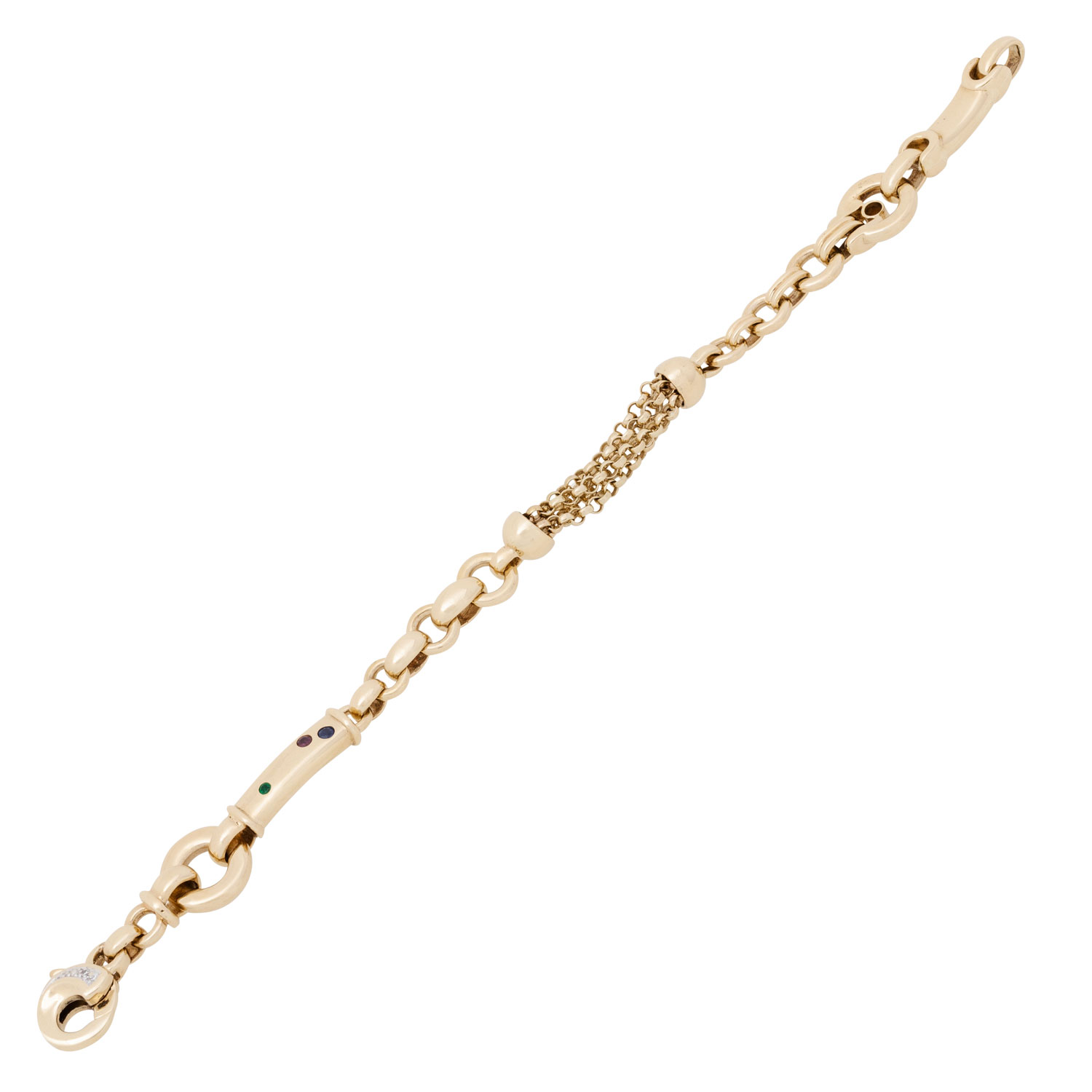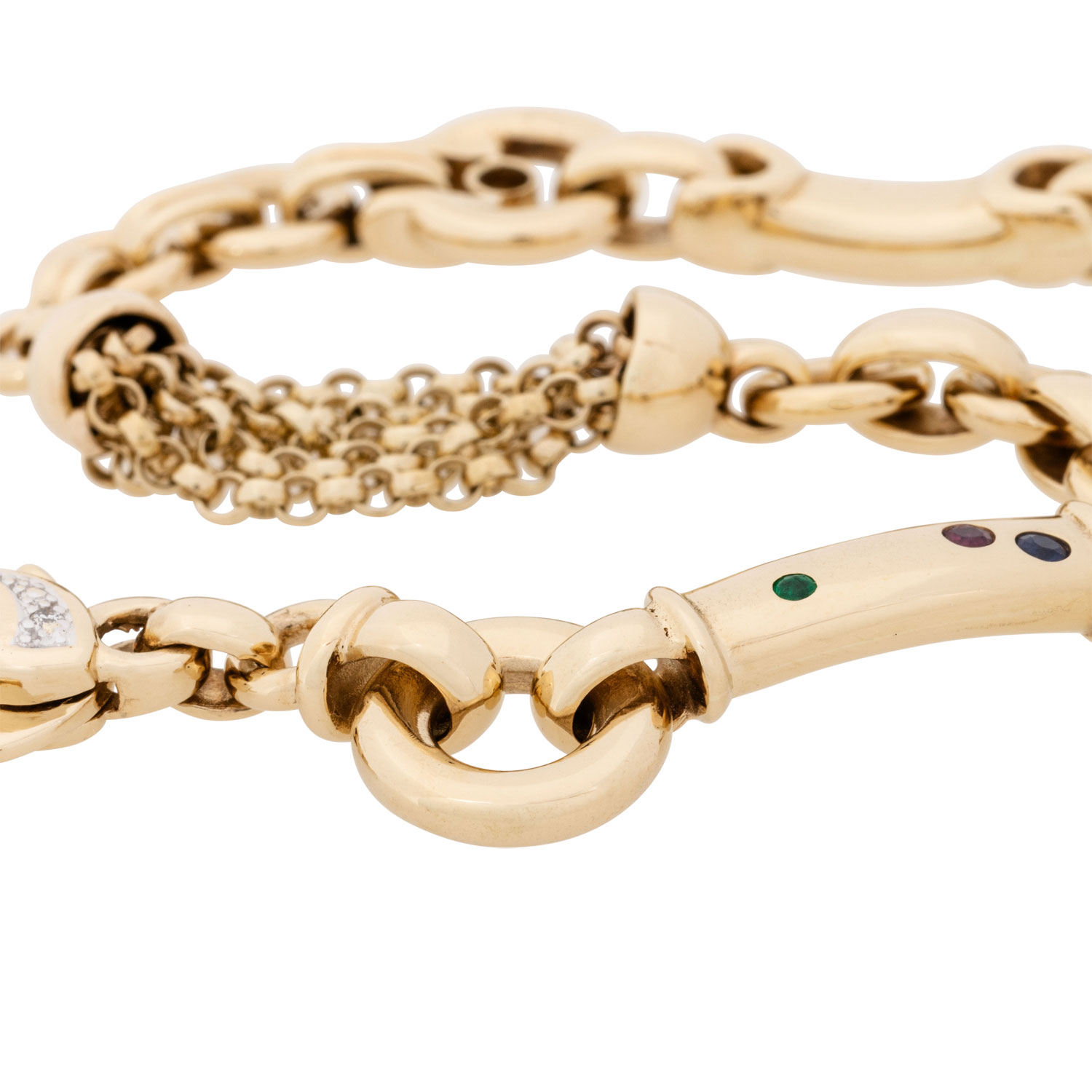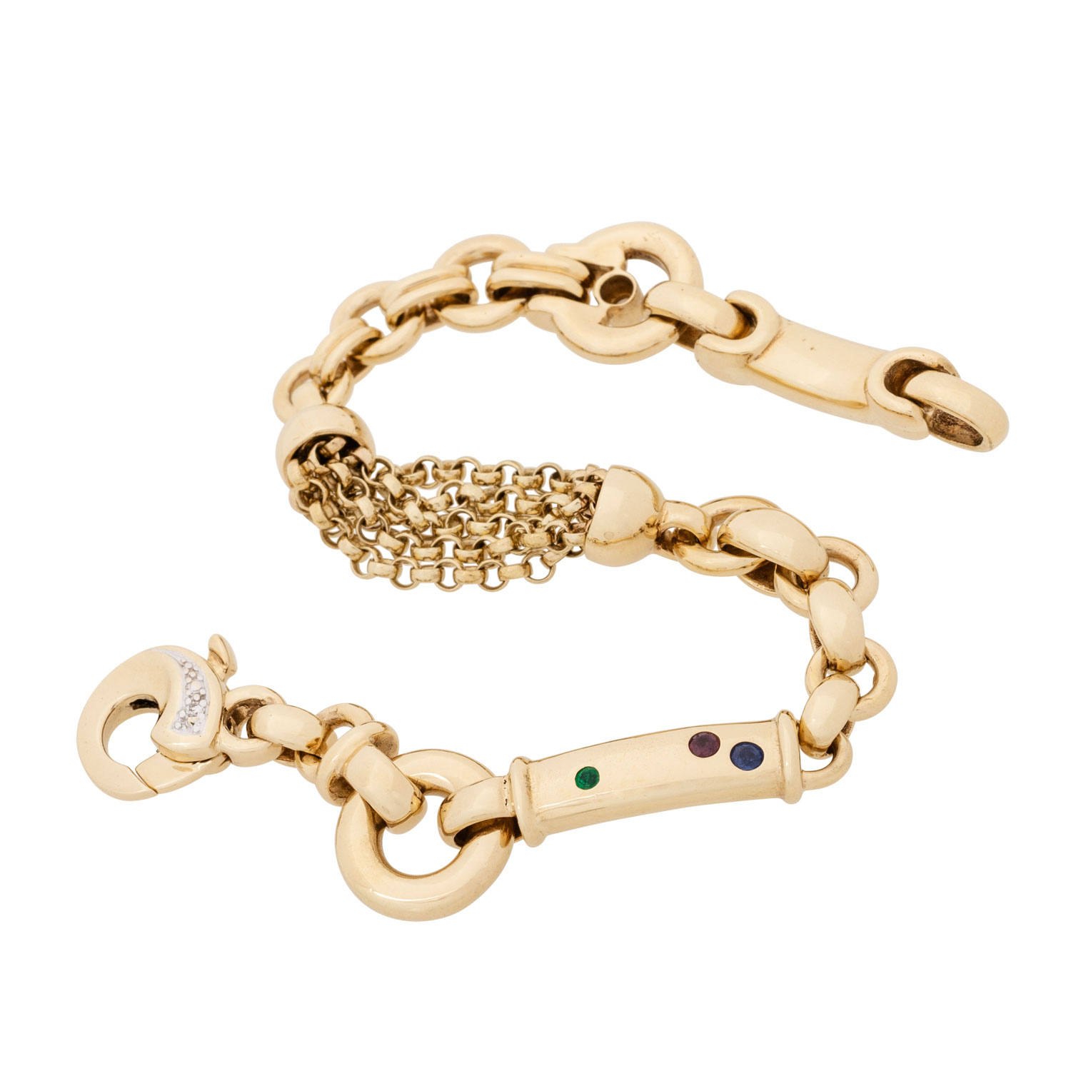 Phantasy bracelet, 2 with brilliant-cut diamonds totall. ca. 0.05 ct, good colour and clarity, sapphire, ruby and emerald, 14K yellow gold, 29 g, L: ca. 19 cm, late 20th century, minimal signs of wear.