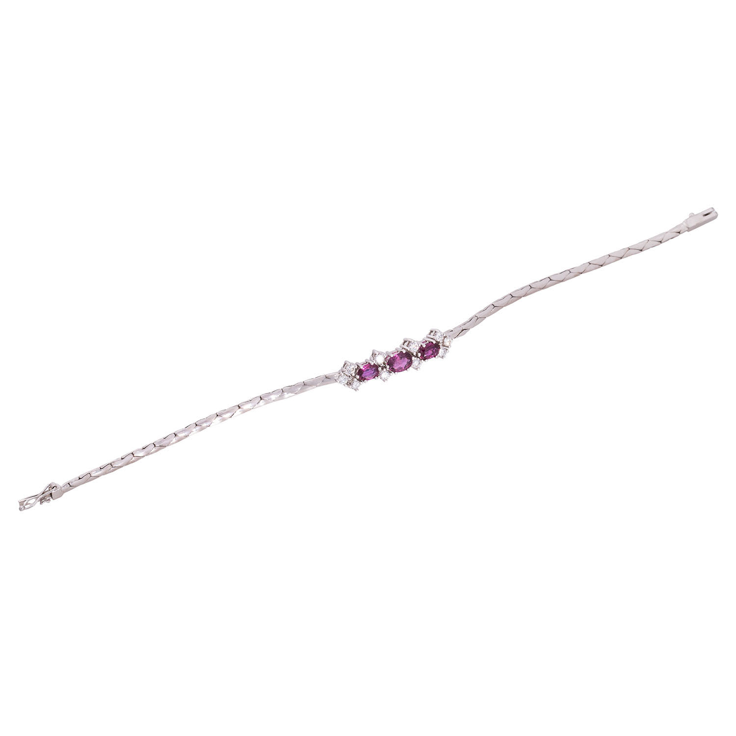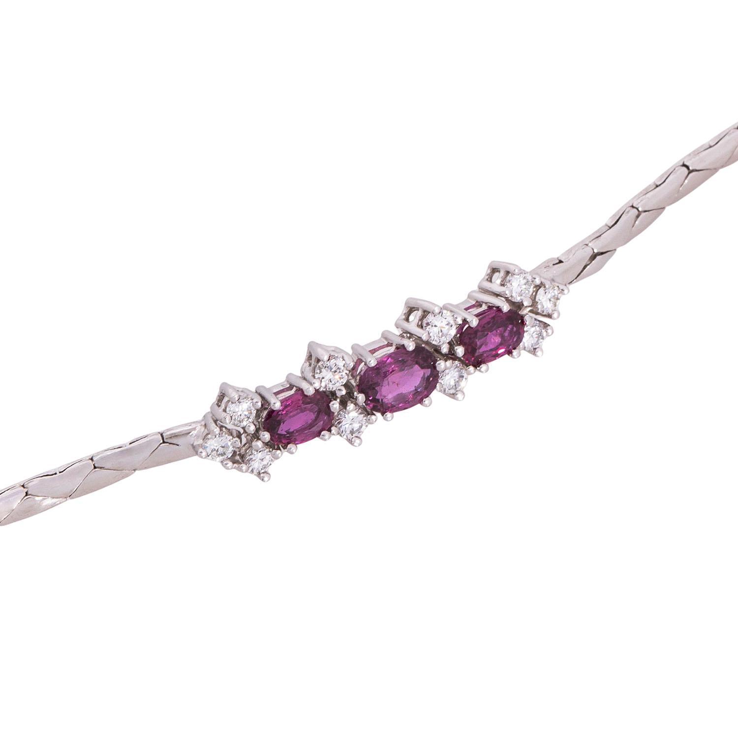 Bracelet with 3 rubies and 10 brilliant-cut diamonds totalling ca. 0.70 ct, WHITE (H)/VS-SI, oval-cut rubies, white gold 14K, 9.6 g, L: ca. 18.5 cm, 2nd H. 20th century, minimal signs of wear, with manufacturer's mark 'GST', numbered '11620'