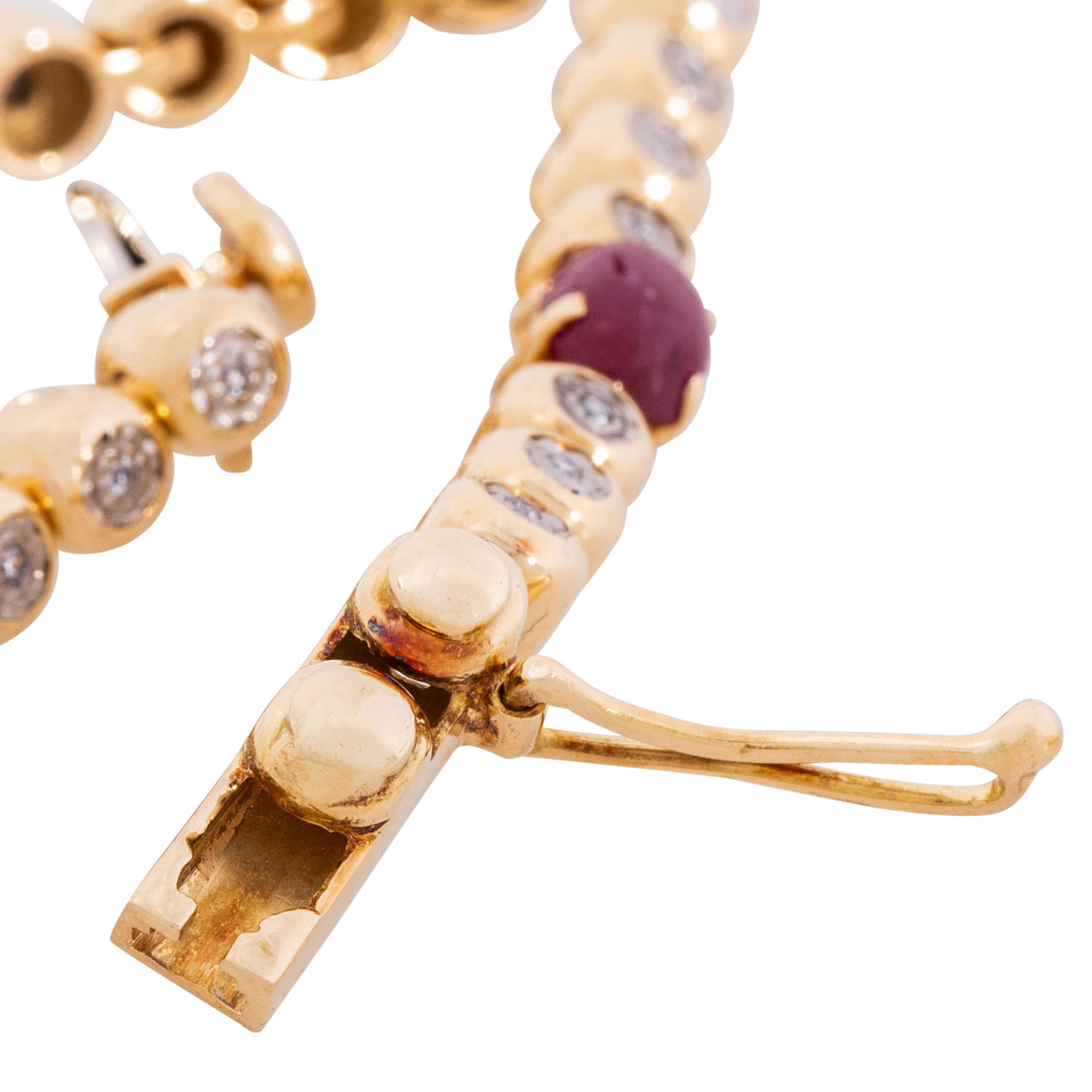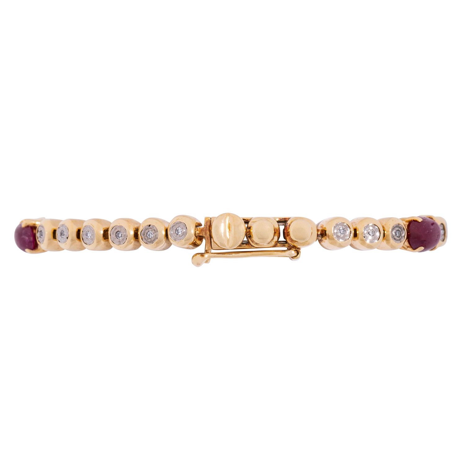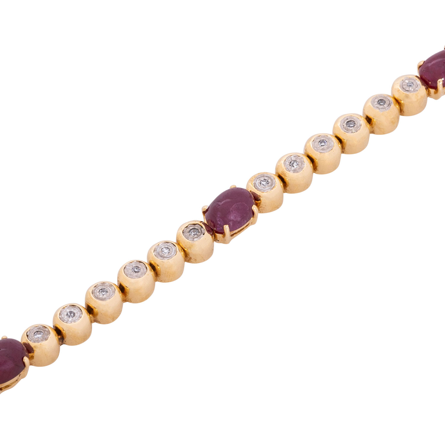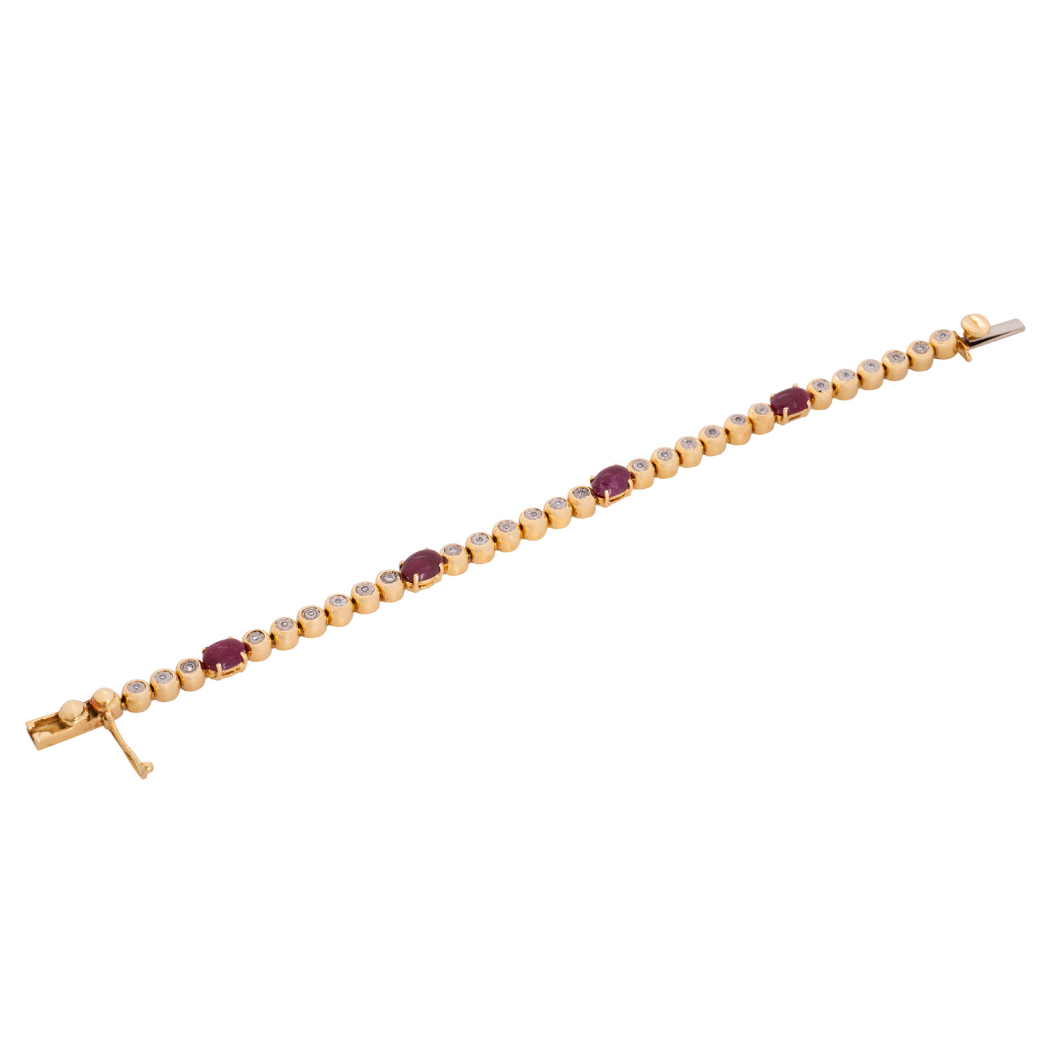 Bracelet with 4 ruby cabochons and 27 single-cut diamonds totalling ca. 0,13 ct, medium colour and low clarity, oval-cut rubies, ca. 7 x 5 mm, clear naturale signs of growth, 1 movable stone, yellow gold/white gold 18K, 24,4 g, L: ca. 17 cm, W: ca. 0,47 cm, 21st century, minor signs of wear.