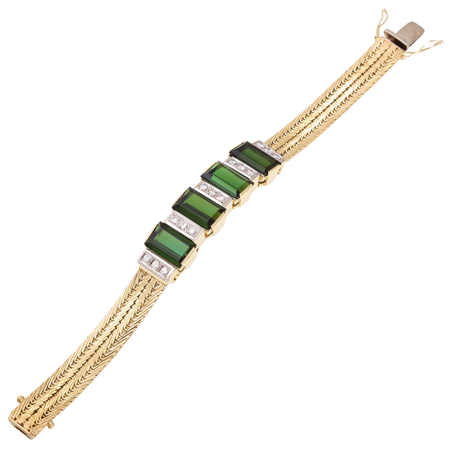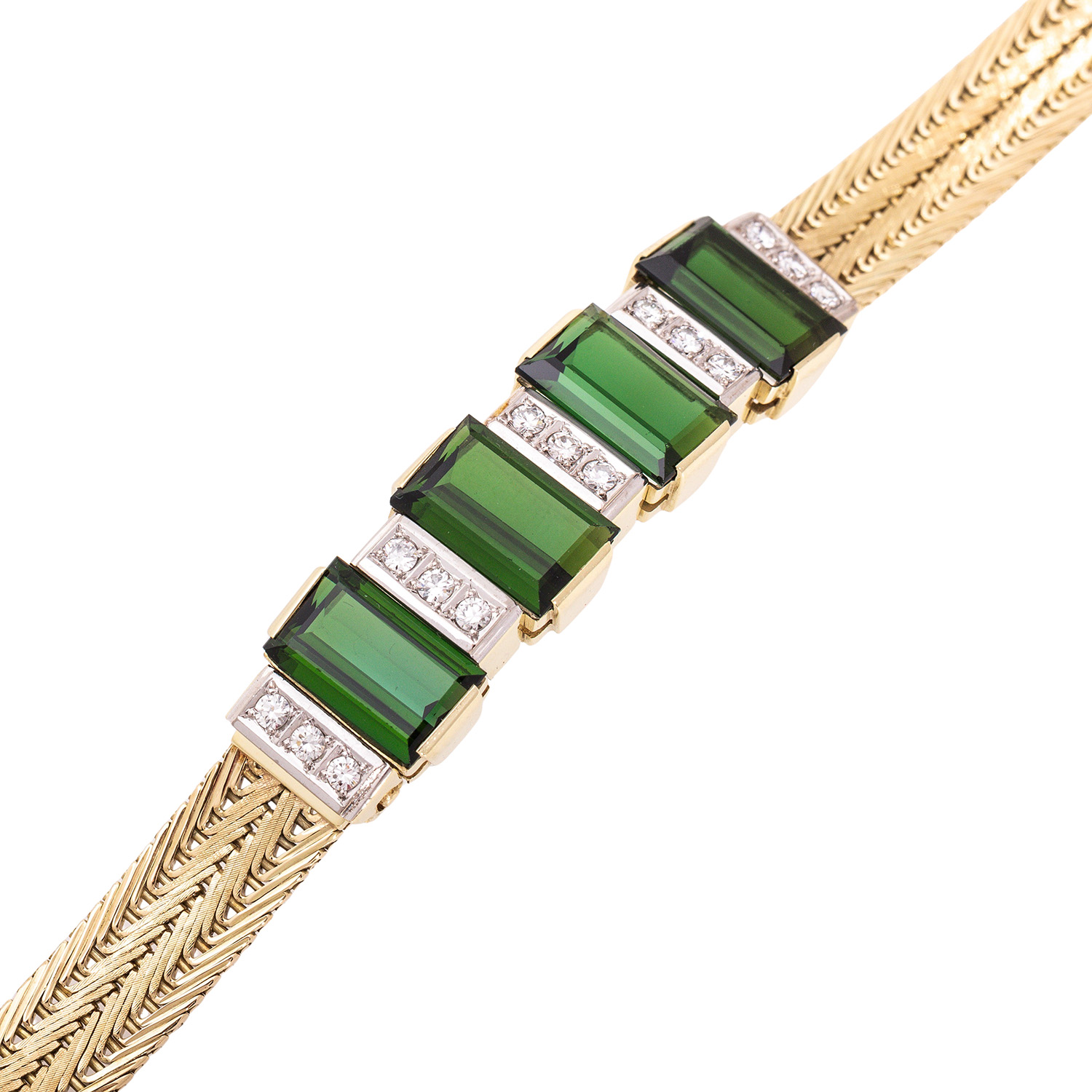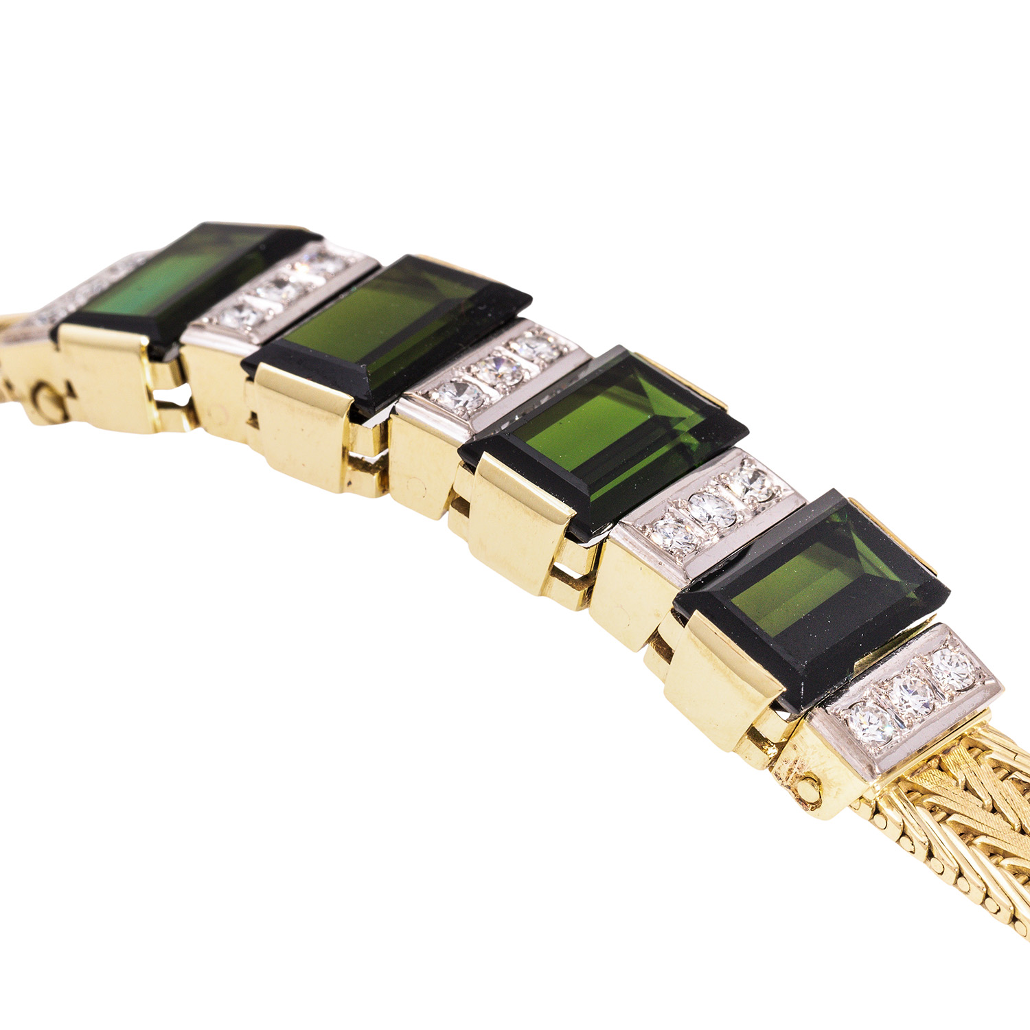 Bracelet with 4 baguette-cut tourmalines from approx 12.7 ct and brilliant-cut diamonds from approx 0.50 ct with good color and clarity, 14K YG/WG, 33 gr, L approx 15.5 cm, 2nd half 20th century, signs of wear, two tourmalines with nicks.