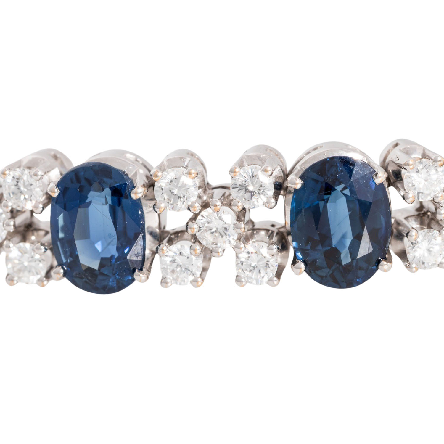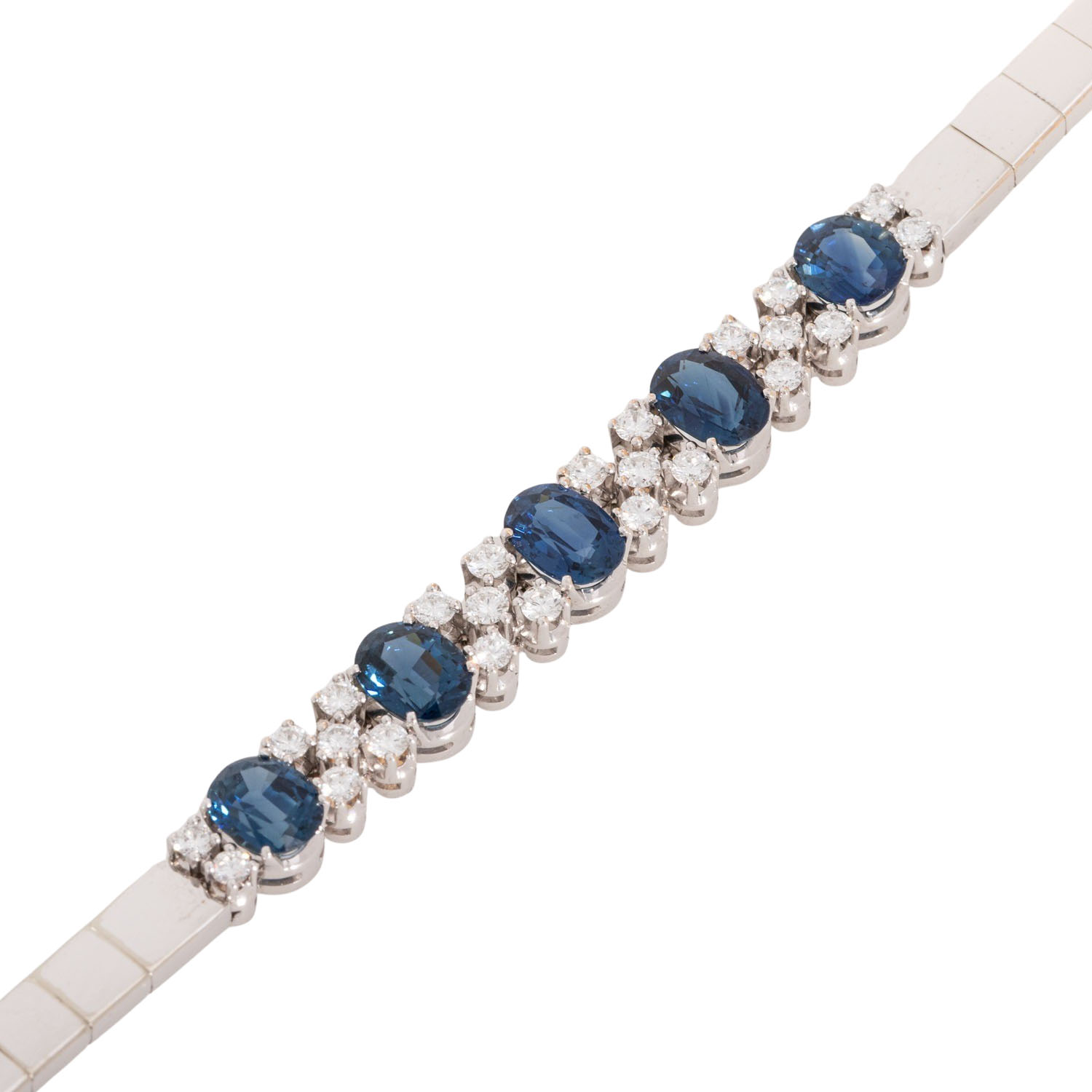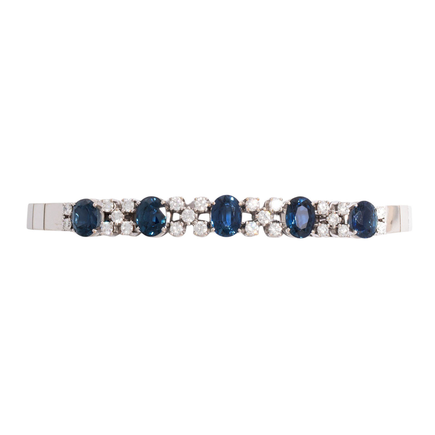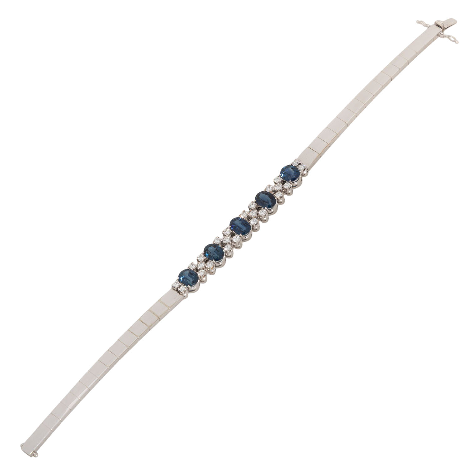 Bracelet with 5 fine oval faceted sapphires totalling ca. 5 ct and 24 brilliant-cut diamonds totalling ca. 0.7 ct, good to very good colour and clarity, 18K white gold, 18.2 g, L: 18 cm, 1960-70s, very good condition, very nice workmanship.