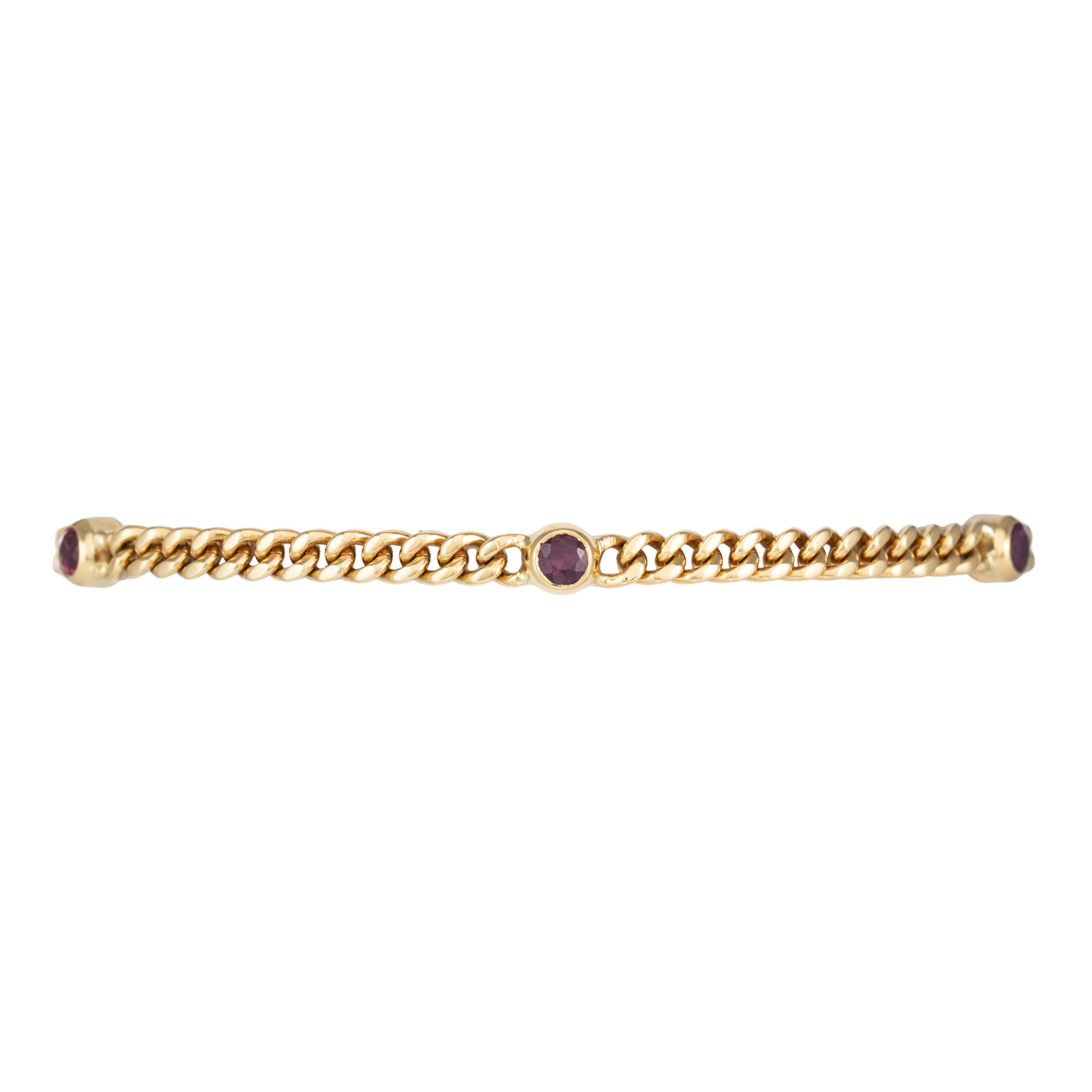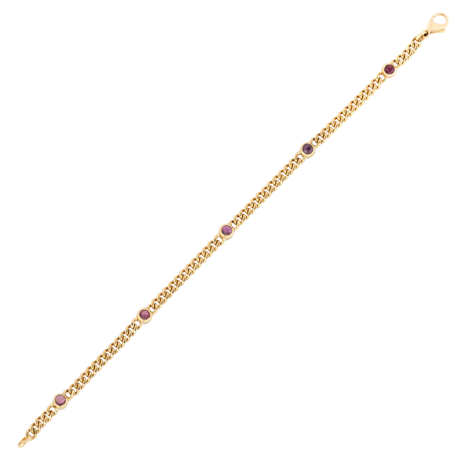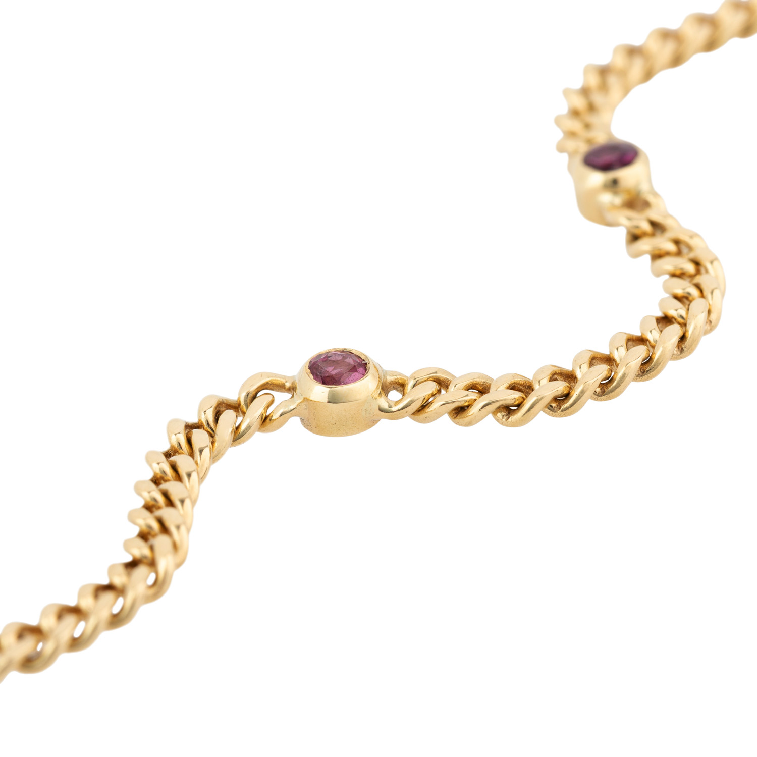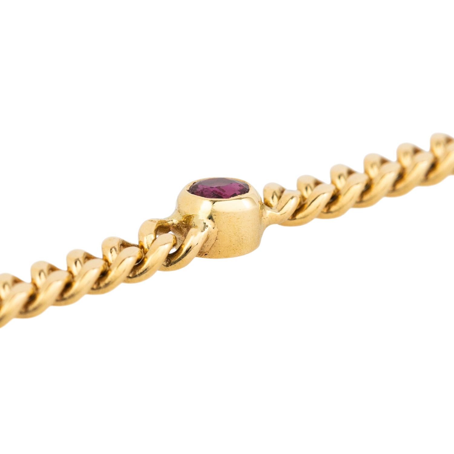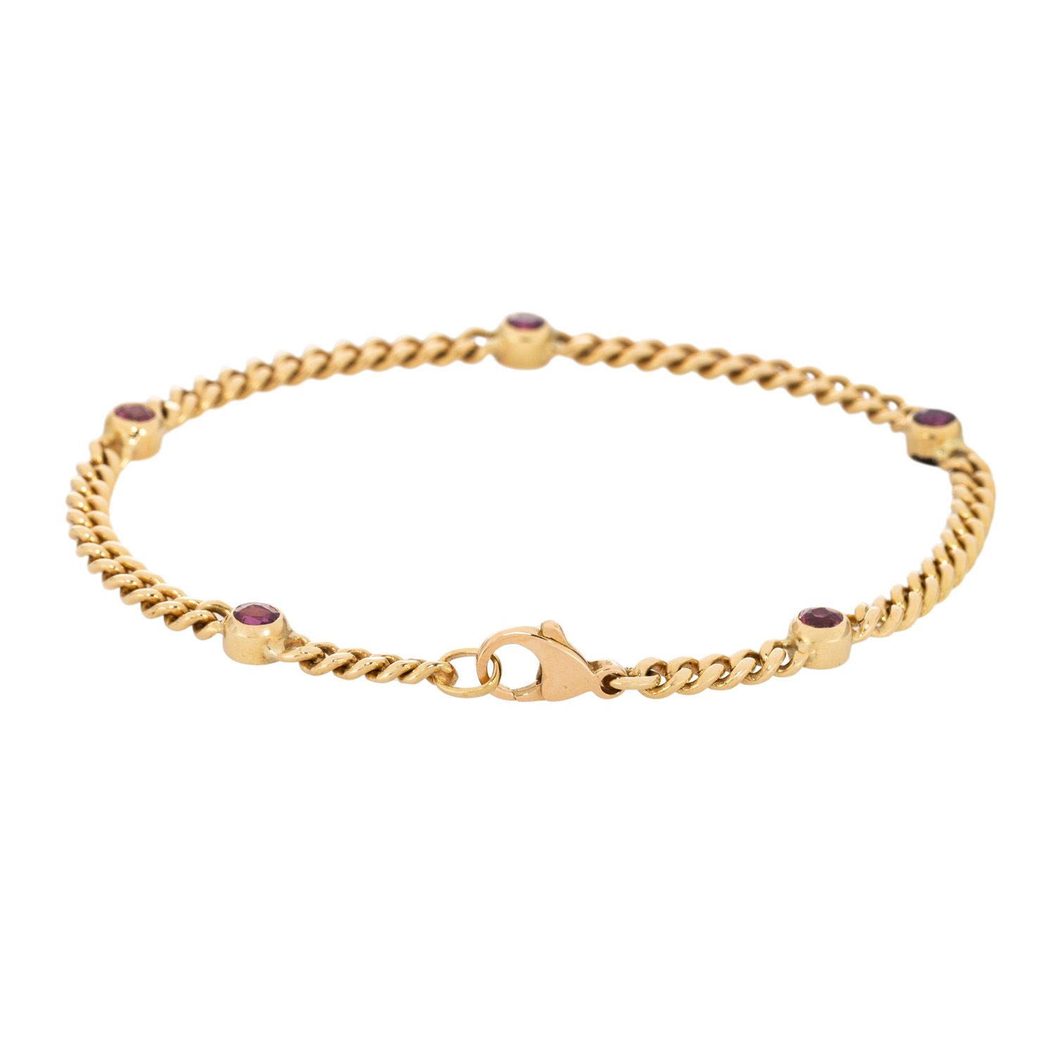 Bracelet with 5 round faceted rubies, ap. 3.5 mm, 18K yellow gold, 9.7 g, L: 18 cm, W: 4.5 mm, carabiner clasp, late 20th century, minor signs of wear.