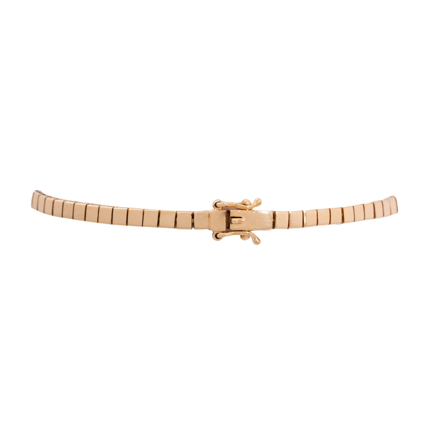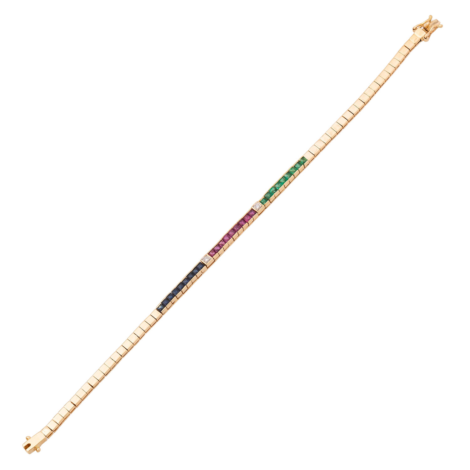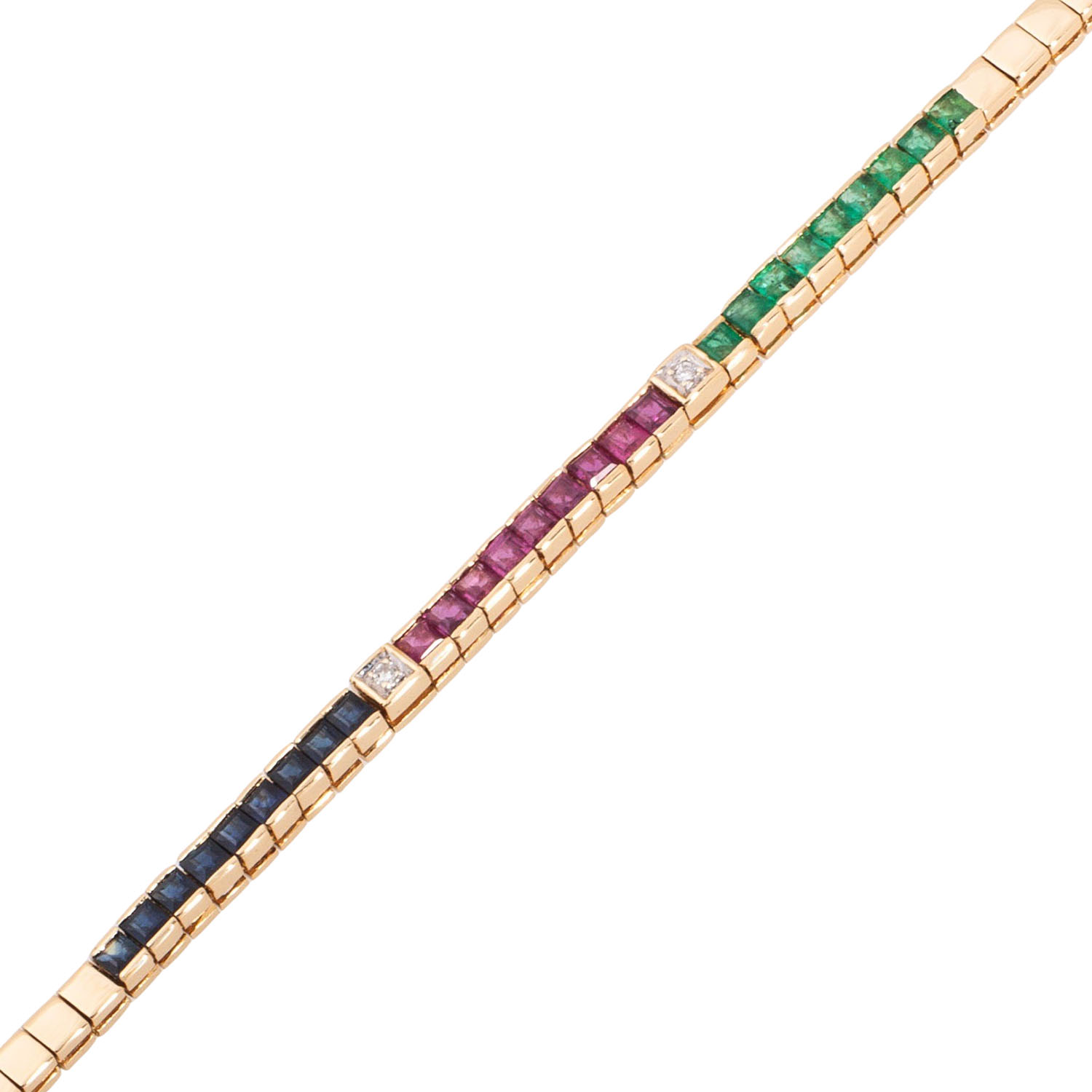 Bracelet with 9 sapphires, 9 rubies, 9 emeralds and 2 brillant-cut diamonds totalling approx. 0.03 ct, STW (I-J)/SI, square-cut gemstones, all stones totalling 0.82 ct (marked), 1 sapphire chipped, 1 emerald out of setting, 18K yellow gold, 10.2 g, L: approx. 17.5 cm, W: approx. 0.28 cm, 21st century, minor signs of wear.