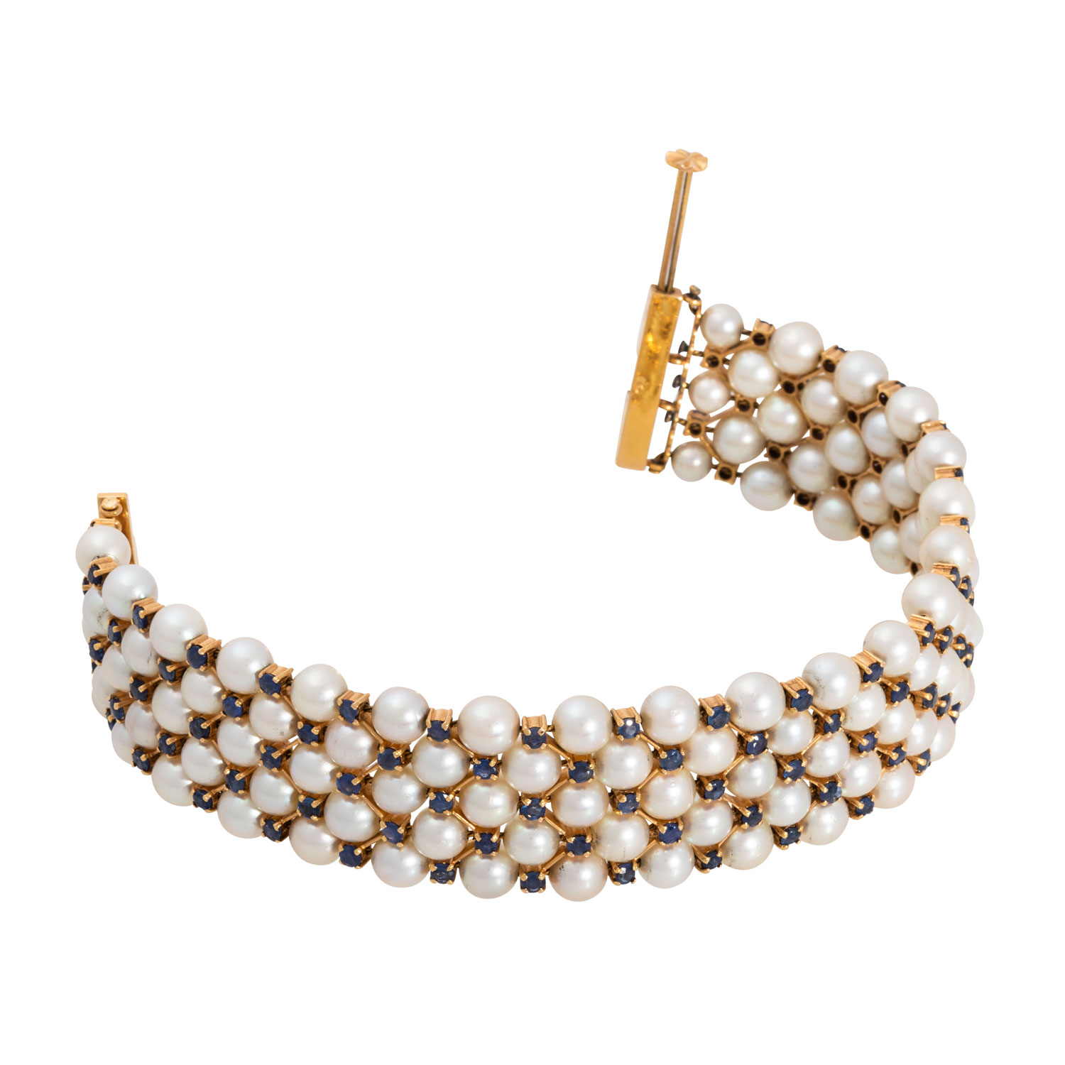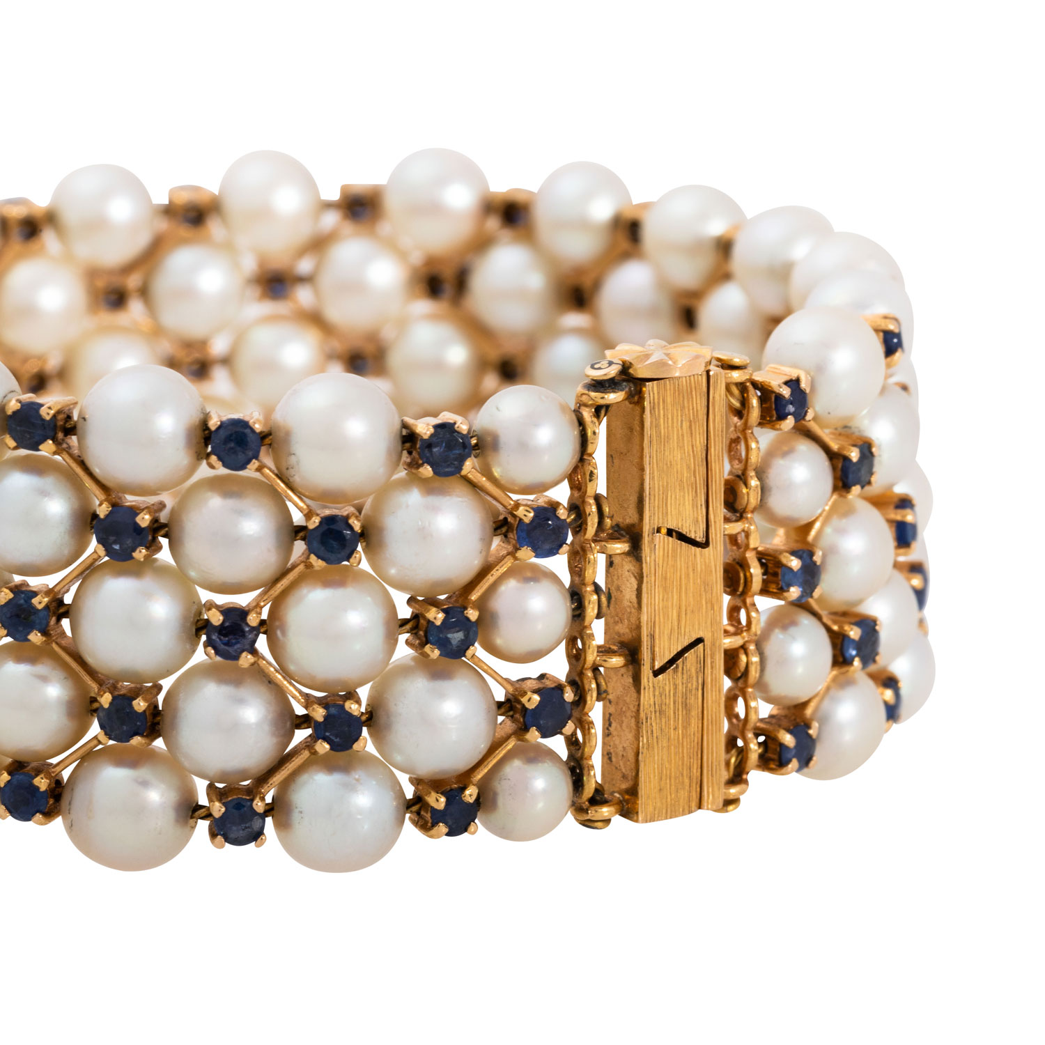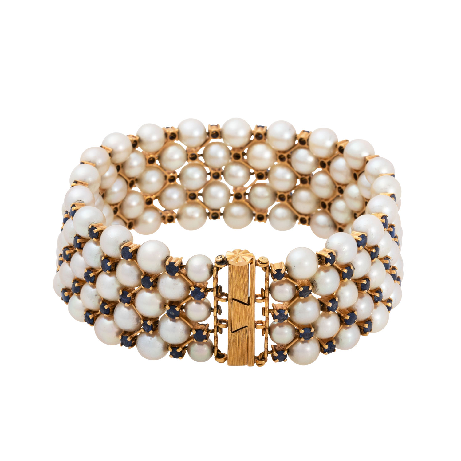 Bracelet with 95 cultured pearls, cream colour, D: 6.3 mm, 5 cultured pearls, cream colour, D: 5 mm, 100 sapphires in golden settings on bars, 18K yellow gold, 64.3 g, L: 20 cm, W: 25 mm, 2nd half of 20th century, minor signs of wear.